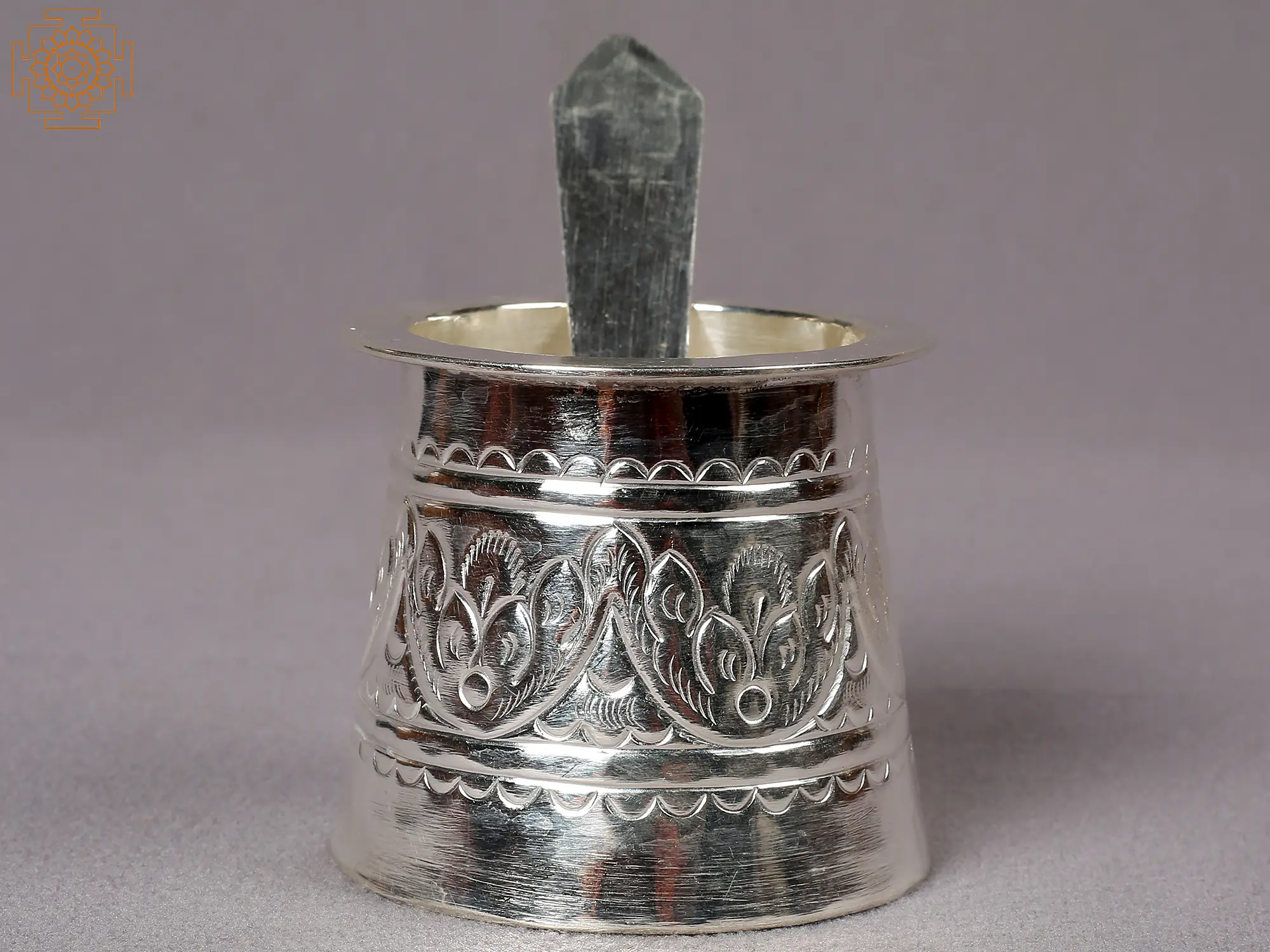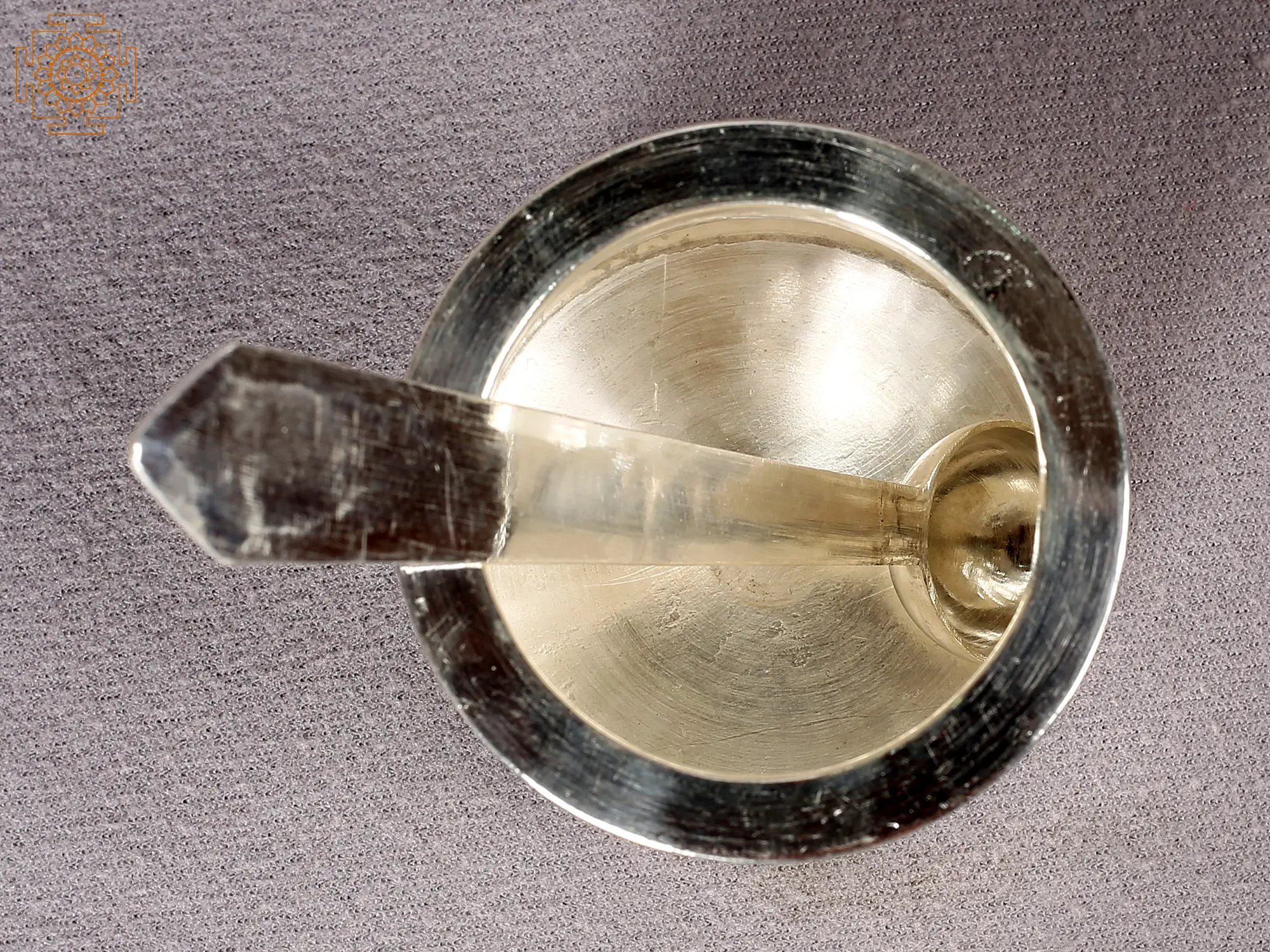 Silver is considered a sacred metal due to its historical significance as a cleaner and combatant of bacterial infections. The silverware is only used for serving deities for this reason. This little traditional silver Pancha Patra attests to the sacred qualities of silver. The Pancha Patra is a vessel used to serve Panchamrita during Vedic rites. It is composed of two parts: a Patra or container and a spoon. Without a doubt, this Pancha Patra makes the rituals easier to complete.