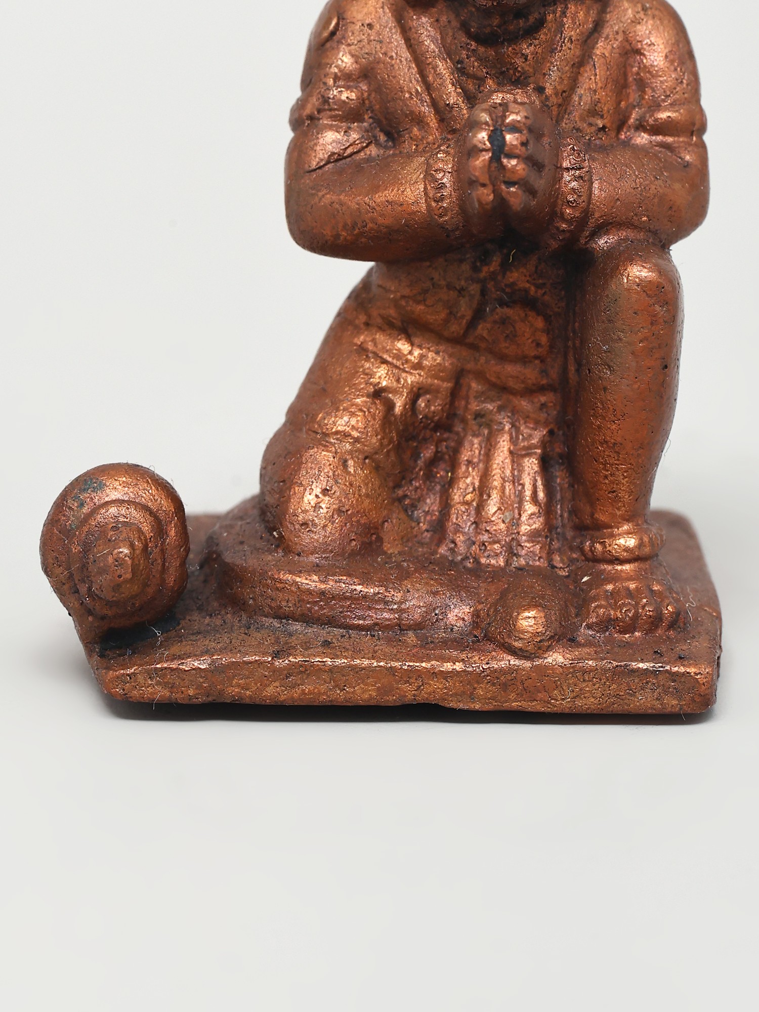 This exquisite 2.5 x 1.7 x 1.5 inch copper statue depicts Lord Hanuman, the revered Hindu deity, in the Namaskar mudra – a gesture of respect and devotion. Crafted with meticulous detail, this small yet powerful figurine captures the essence of Hanuman's strength, wisdom, and unwavering loyalty. The rich, warm tones of the copper enhance the statue's inherent beauty, making it a captivating addition to any spiritual space or collection. Its compact size allows for versatile placement, be it on a desk, altar, or shelf, bringing a touch of divine grace to your surroundings.