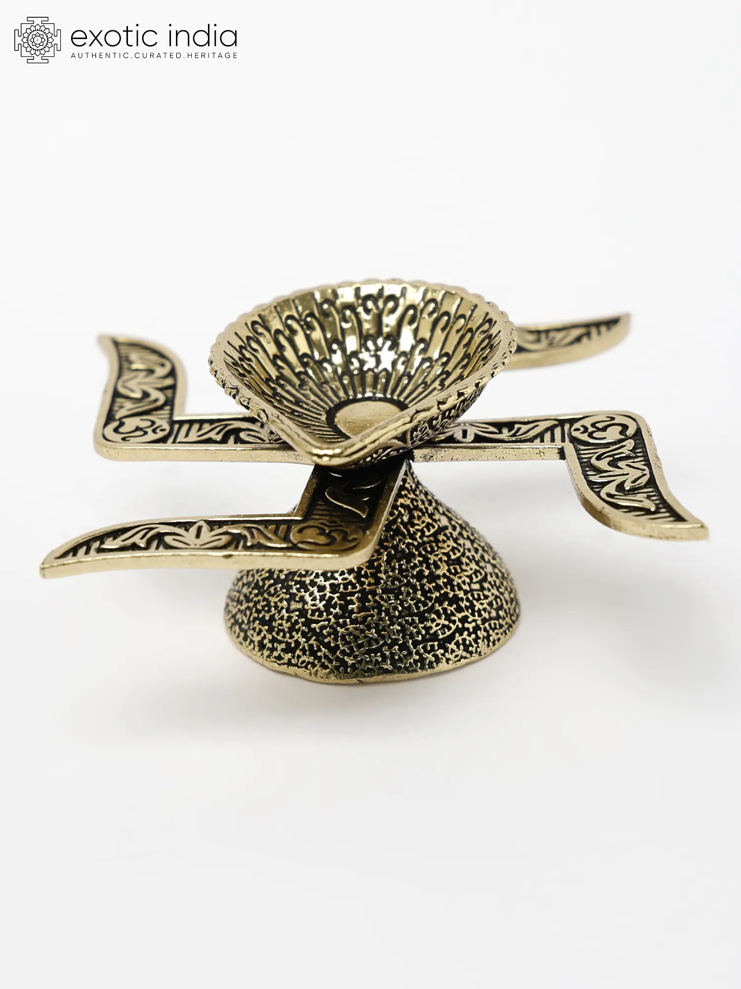 This Small Swastik Diya in Brass is a stunning piece, exuding traditional charm and spiritual significance. Its unique design features a leaf-shaped oil basin, while black sedimentations accentuate the intricate grooves of the swastika design.