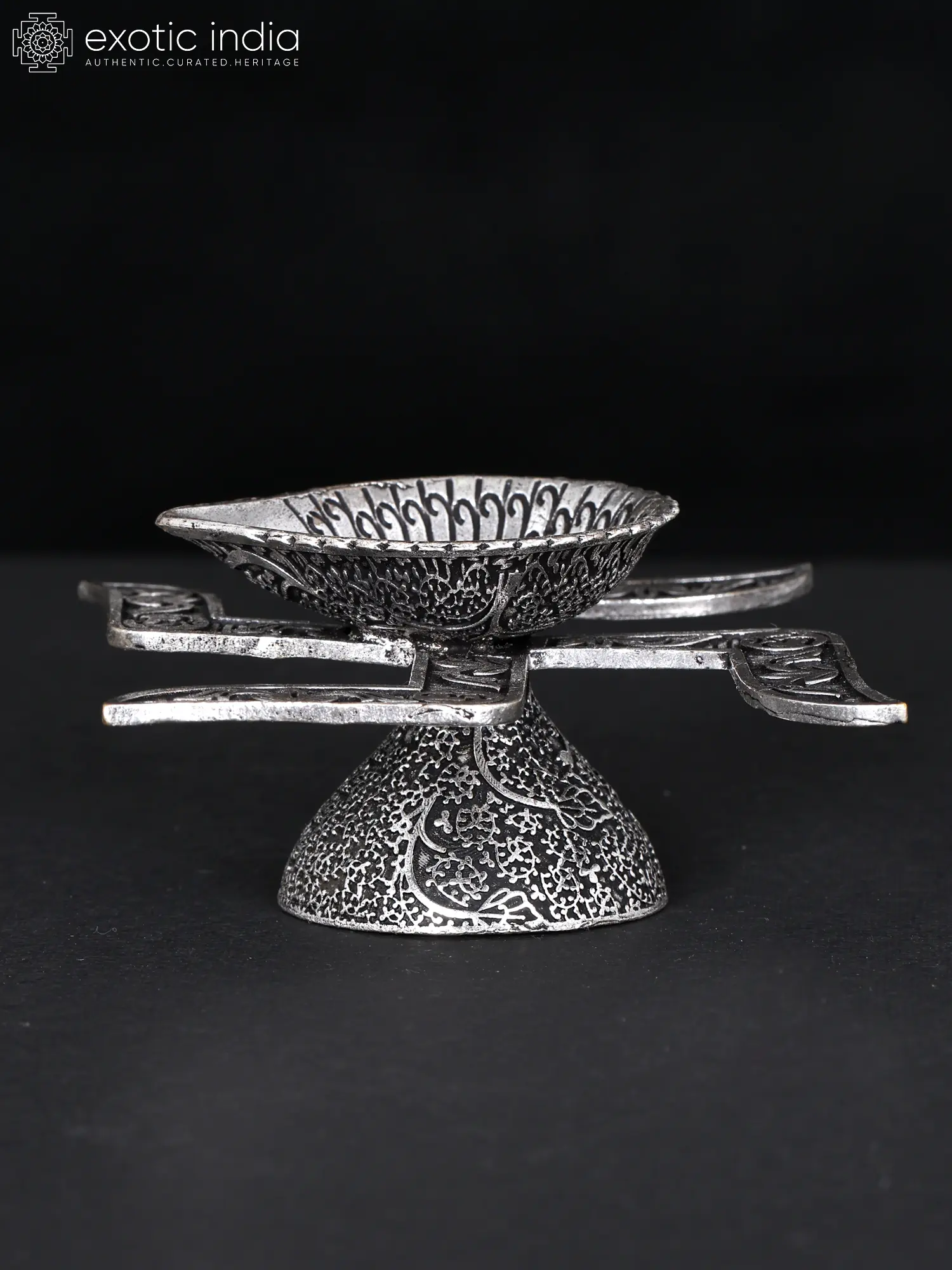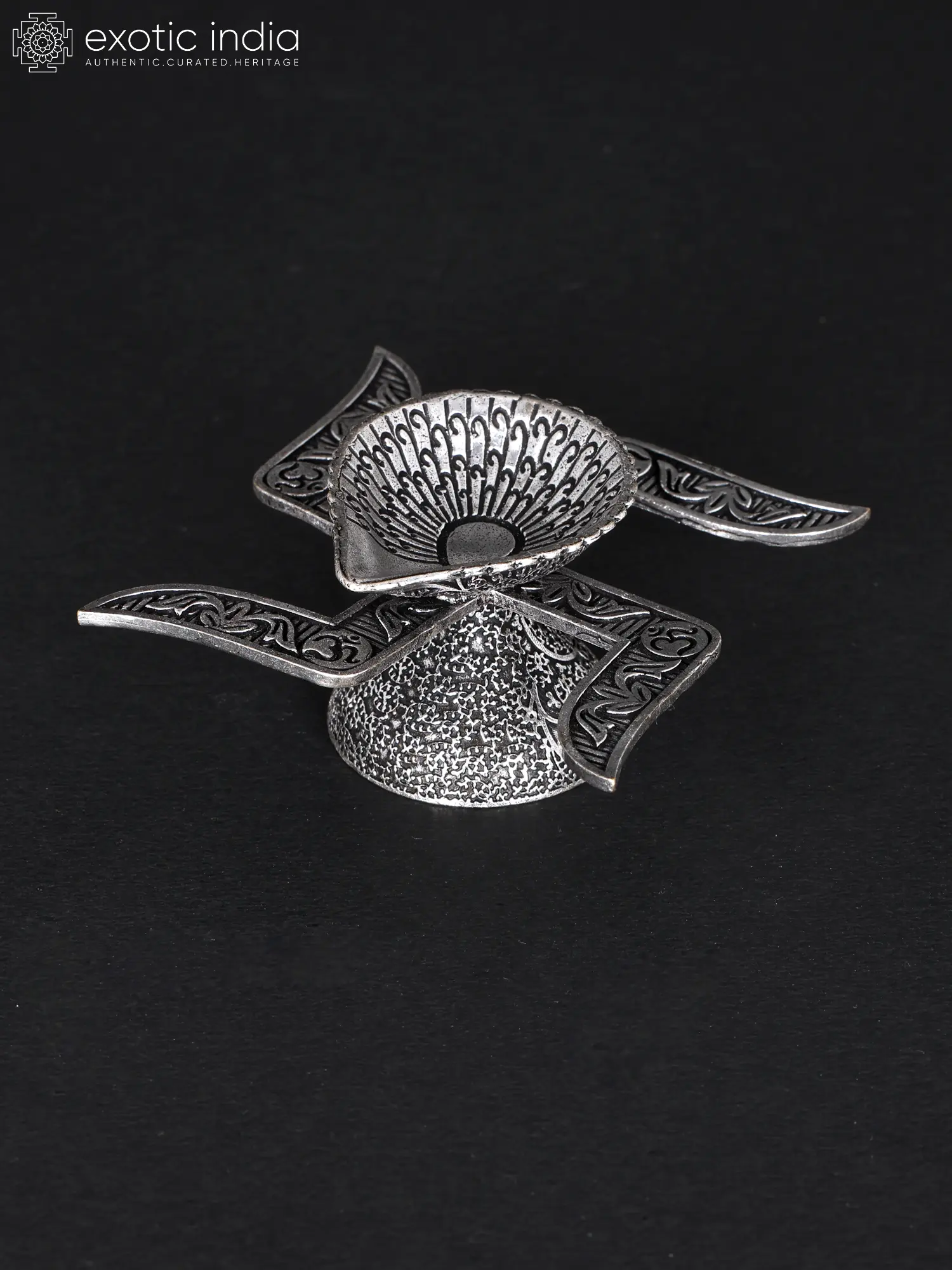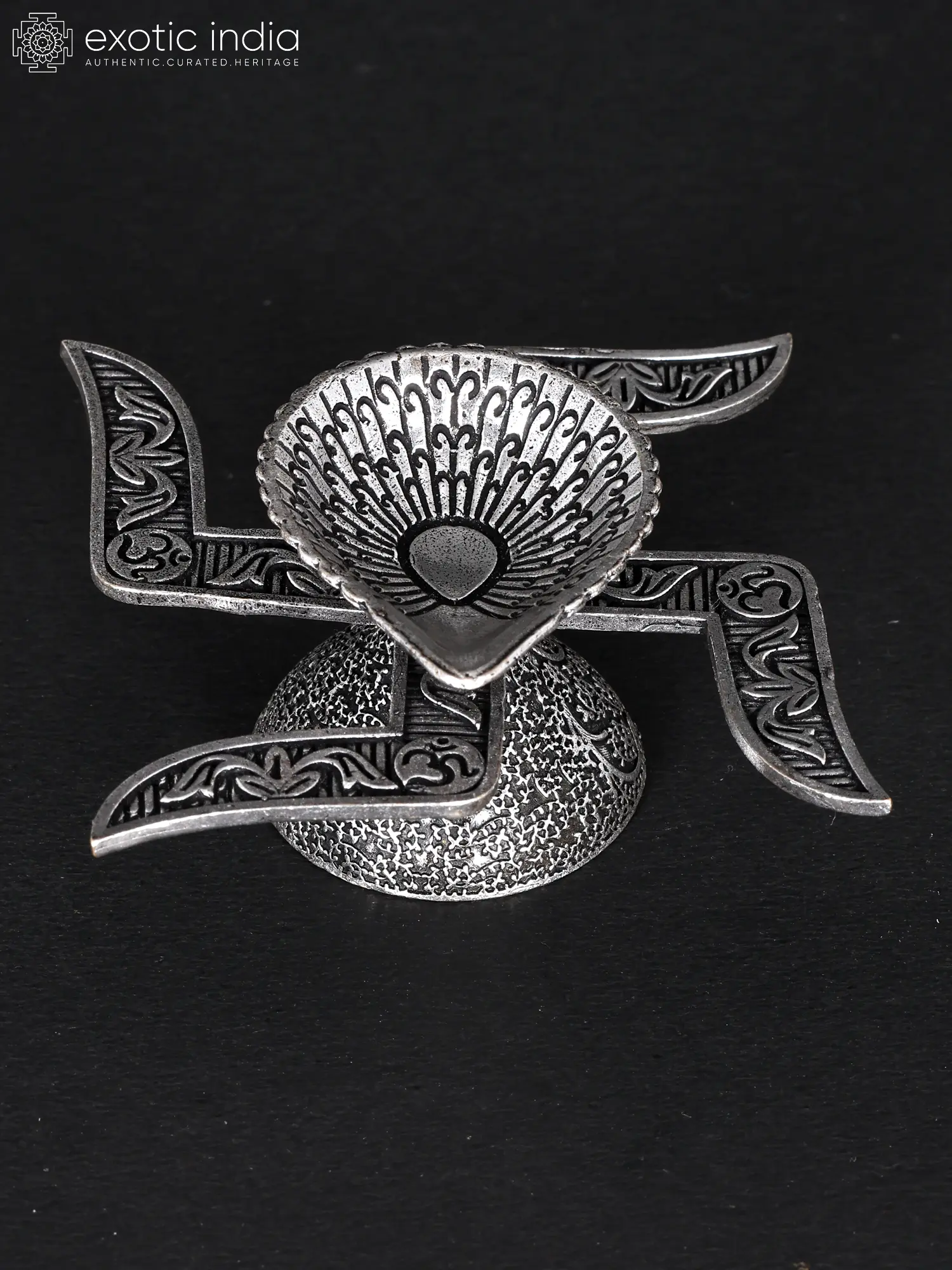 The base, frosted for stability, provides a solid foundation for the diya. Positioned between the diya and the base, the swastika symbolizes auspiciousness and prosperity. Its branches adorned with the sacred Aum symbol further enhance its spiritual aura.