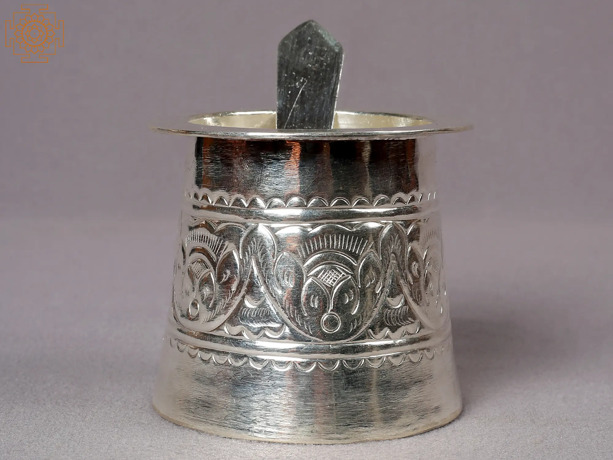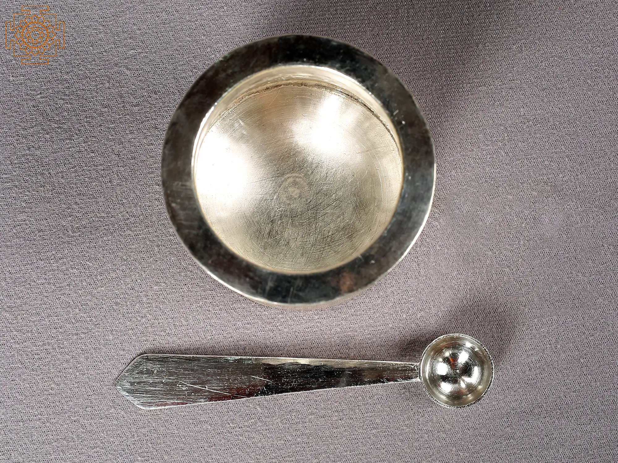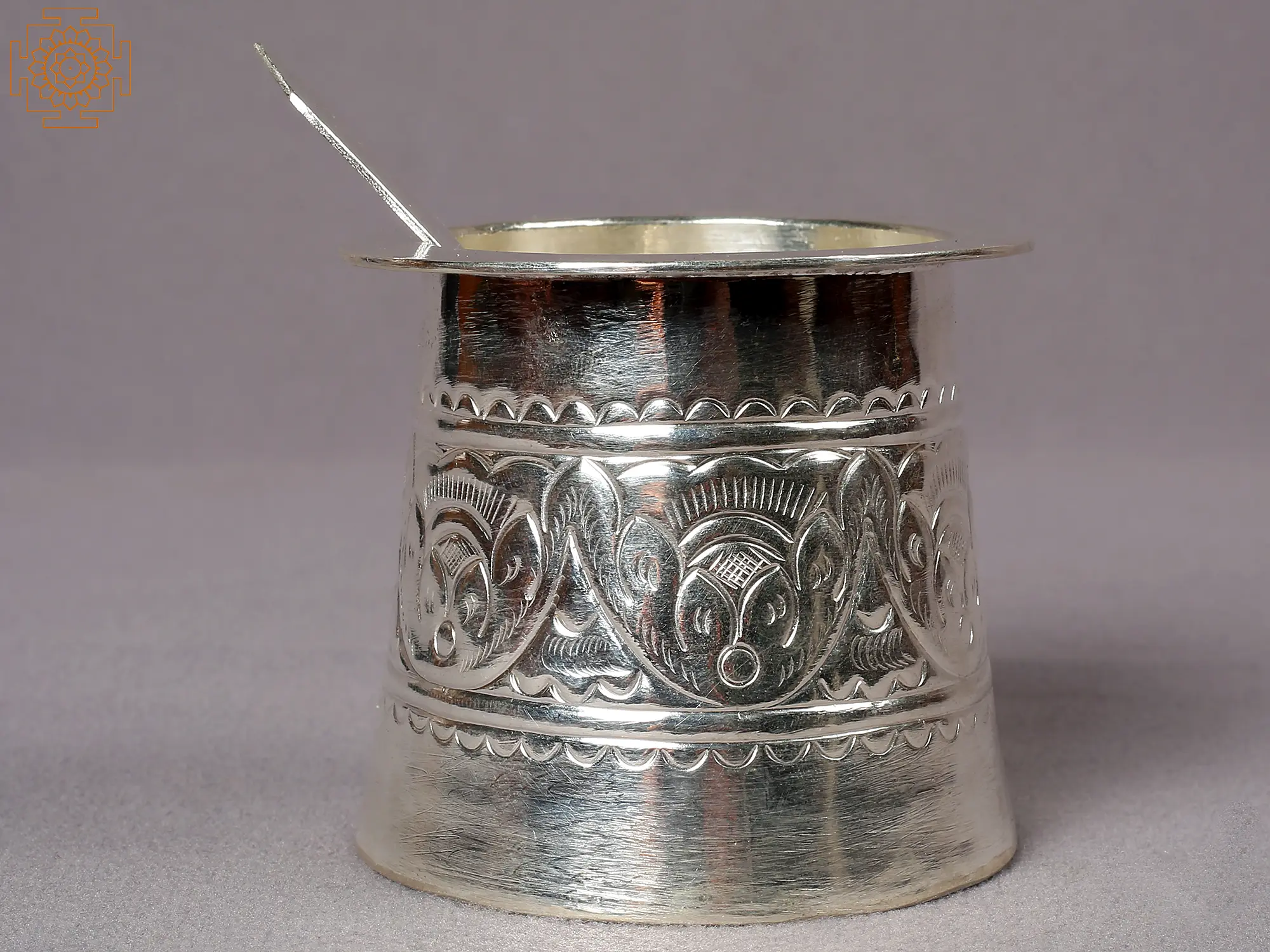It is a necessary ceremonial item for Pujas and Vratas. It is frequently used to serve Ghee at small-scale Homas (offerings to the Fire God or Agni). A Pancha Patra is a container used to hold Panchamrit, a five-item sweet concoction distributed as Prasad as well as Ghee during ceremonies. It is made up of two Sanskrit words: Pancha, which means "five," and Patra, which means "container." This little traditional Pancha Patra is made of silver, another precious metal that is frequently used for serving food and other gifts to the gods. The metal is said to boost the impact by enriching the meal with good energy. A jar and a serving spoon are included in this Pancha Patra. On the body, there are fortunate symbols etched.
