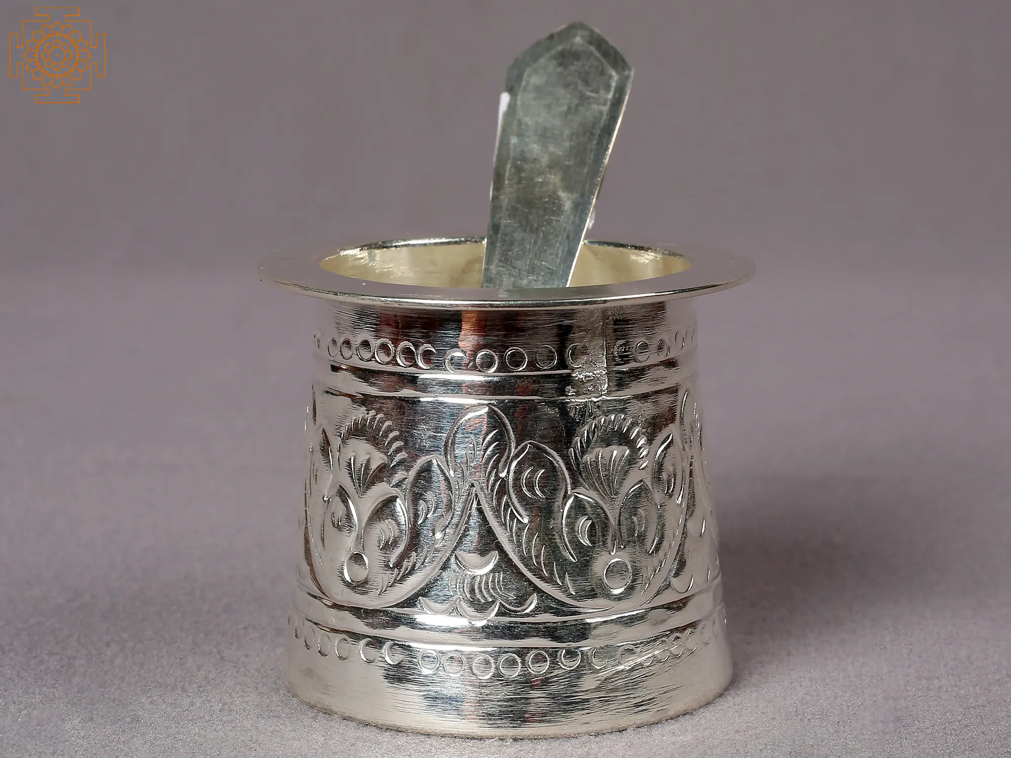 Because of its significance as a cleanser and fighter of bacterial illnesses recounted in ancient literature, silver is regarded as a holy metal. Only for this reason is silverware used for serving items for deities. This little traditional silver Pancha Patra attests to the silver metal's holy powers. The Pancha Patra, a vessel for serving Panchamrita during Vedic ceremonies, is made up of two parts: a Patra or container and a spoon. Without a doubt, this Pancha Patra facilitates the completion of the ceremonies.