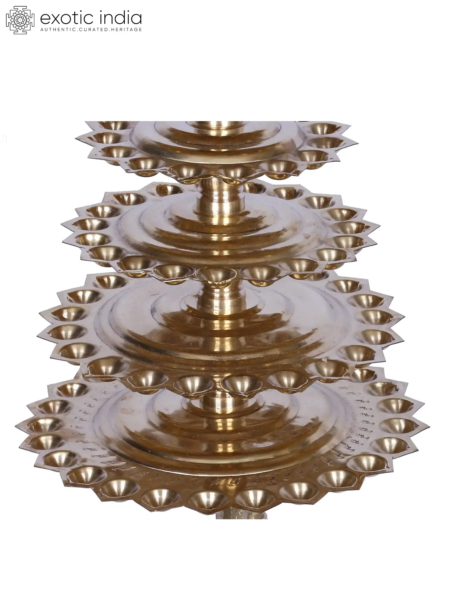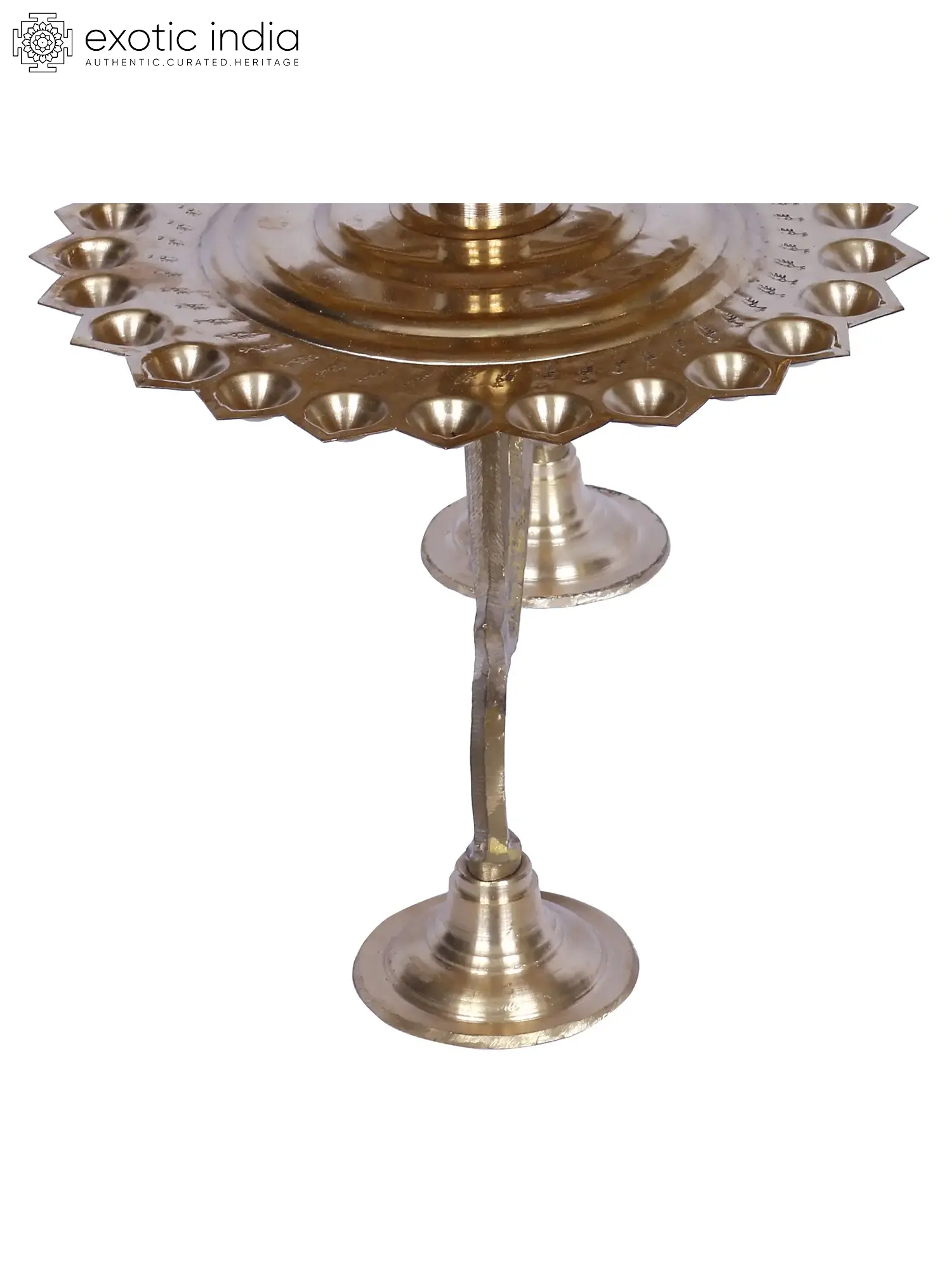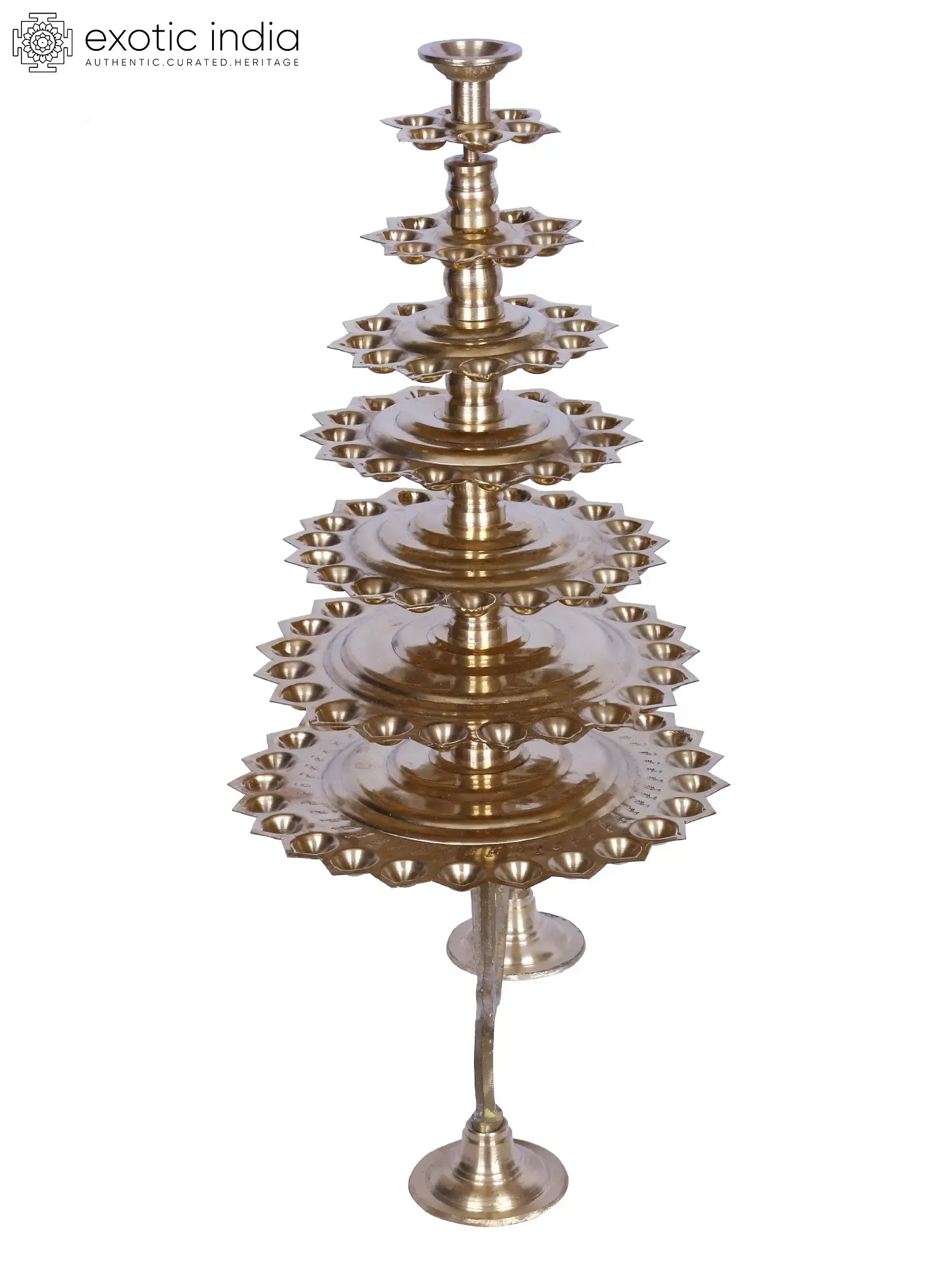 Ratharati refers to tiered aarti lamps with an "S" shaped handle. They are used in temples to pay reverence to the deities using many lighted wicks. These lights are made up of numerous levels of numerous lamps. The numbers might be 5, 7, or even higher. They often include a crown Dhoop Daan in which a large amount of camphor or coconut husk is burnt to help light the lamp with heavenly smoke and finish the Dhoop Aarti process. This classic Ratharati lamp has seven layers of lights and one Dhoop Daan. It is built of high-quality brass to withstand the everyday sacrifice of a large amount of wick burning. This lamp with a very sturdy handle is a perfect fit for Temple worship rituals and can become a cultural asset for the same.