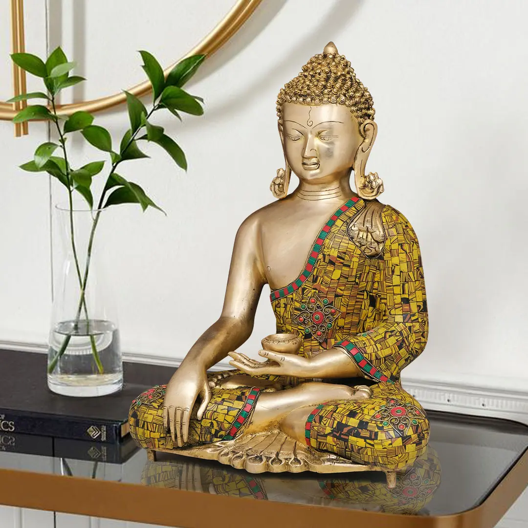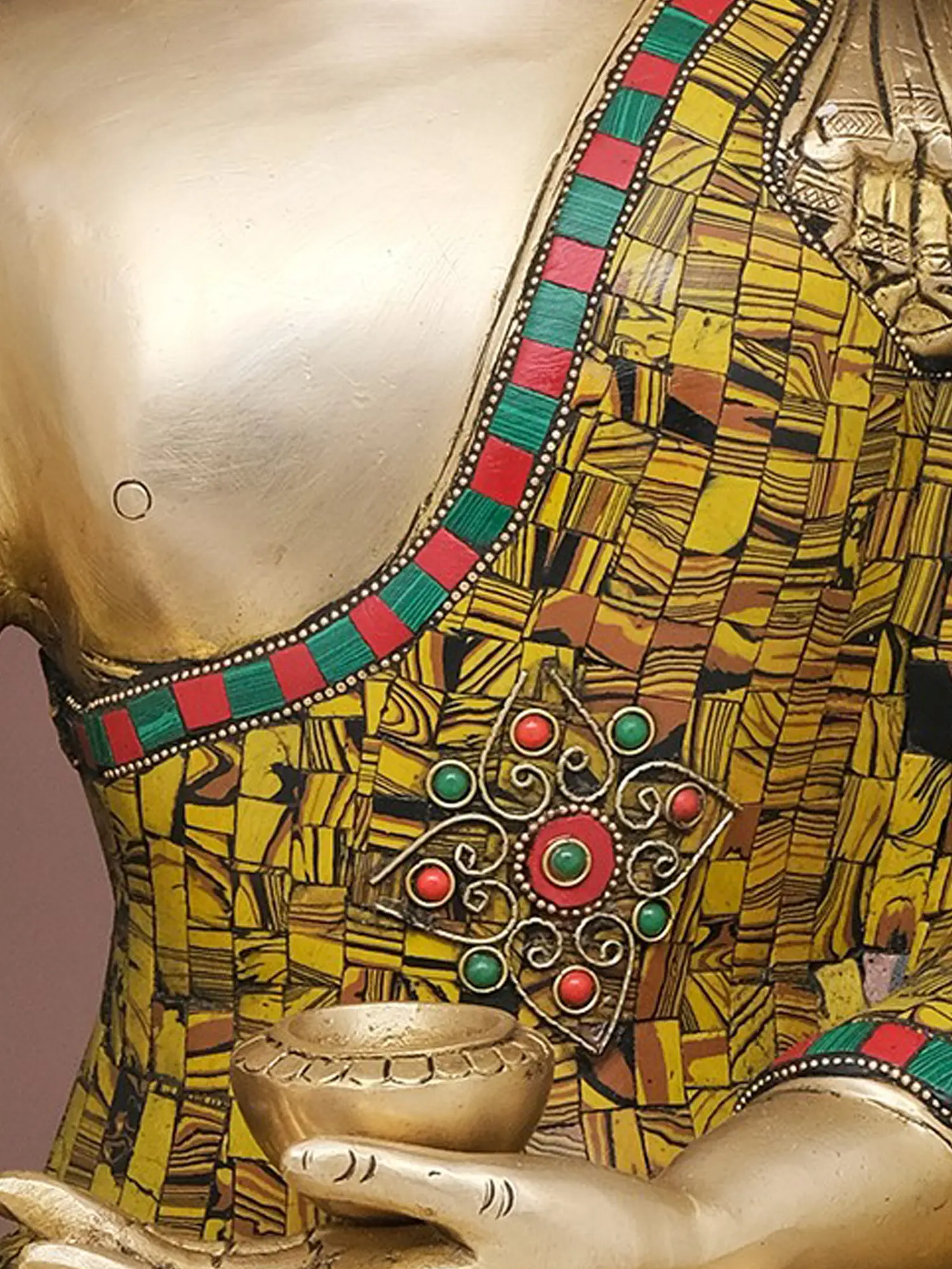 Crafted from lustrous brass, this statue stands as a testament to exceptional artistry. The robe of the Buddha is adorned with intricate inlay work, a technique that elevates this piece to an art form. Vibrant tessellations of various materials create a mosaic effect, imbuing the fabric with a sense of richness and spiritual depth. The meticulously placed stones, featuring shades of yellow, red, and green, evoke the auspicious colors often associated with Buddhist iconography. The subtle interplay of light and shadow across the brass, combined with the detailed inlay, creates a captivating visual experience, making this sculpture not just an object of devotion but a striking decorative piece. The serene expression on the Buddha's face, coupled with the symbolic gesture, radiates a palpable sense of peace and inner harmony.