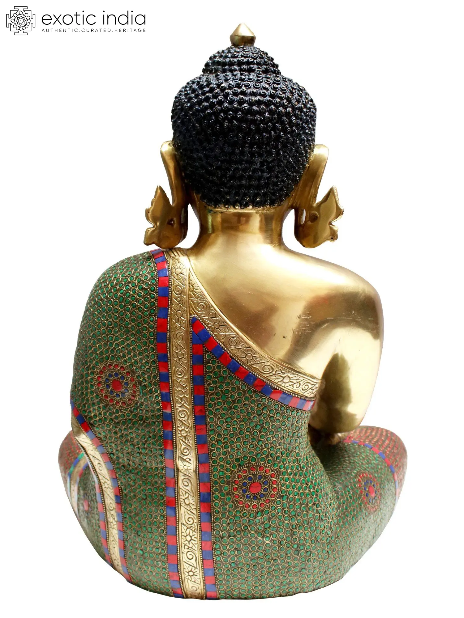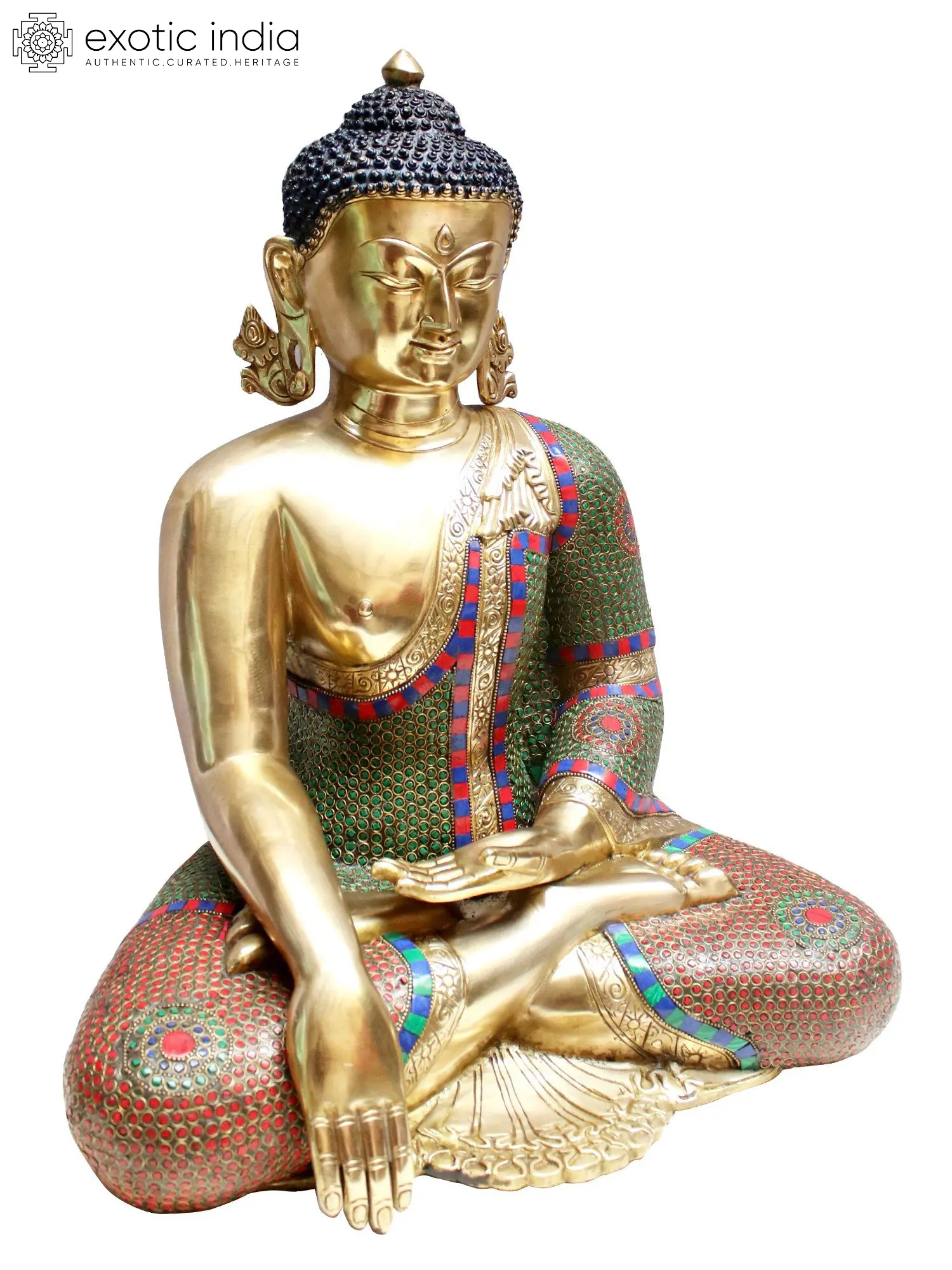 This magnificent brass statue captures the profound moment of enlightenment, embodied in the Bhumisparsha Mudra, or "earth-touching gesture." The serene countenance of the Buddha, rendered in lustrous brass, conveys an unparalleled sense of peace and spiritual awakening. The meticulously crafted features, from the gentle curve of the lips to the thoughtful gaze of the eyes, invite contemplation and a connection with the Buddha's wisdom. The intricate inlay work, adorning the robe and seated posture with vibrant hues of red, green, and blue, adds a layer of richness and visual depth, symbolizing the manifold blessings and auspiciousness that accompany spiritual realization.