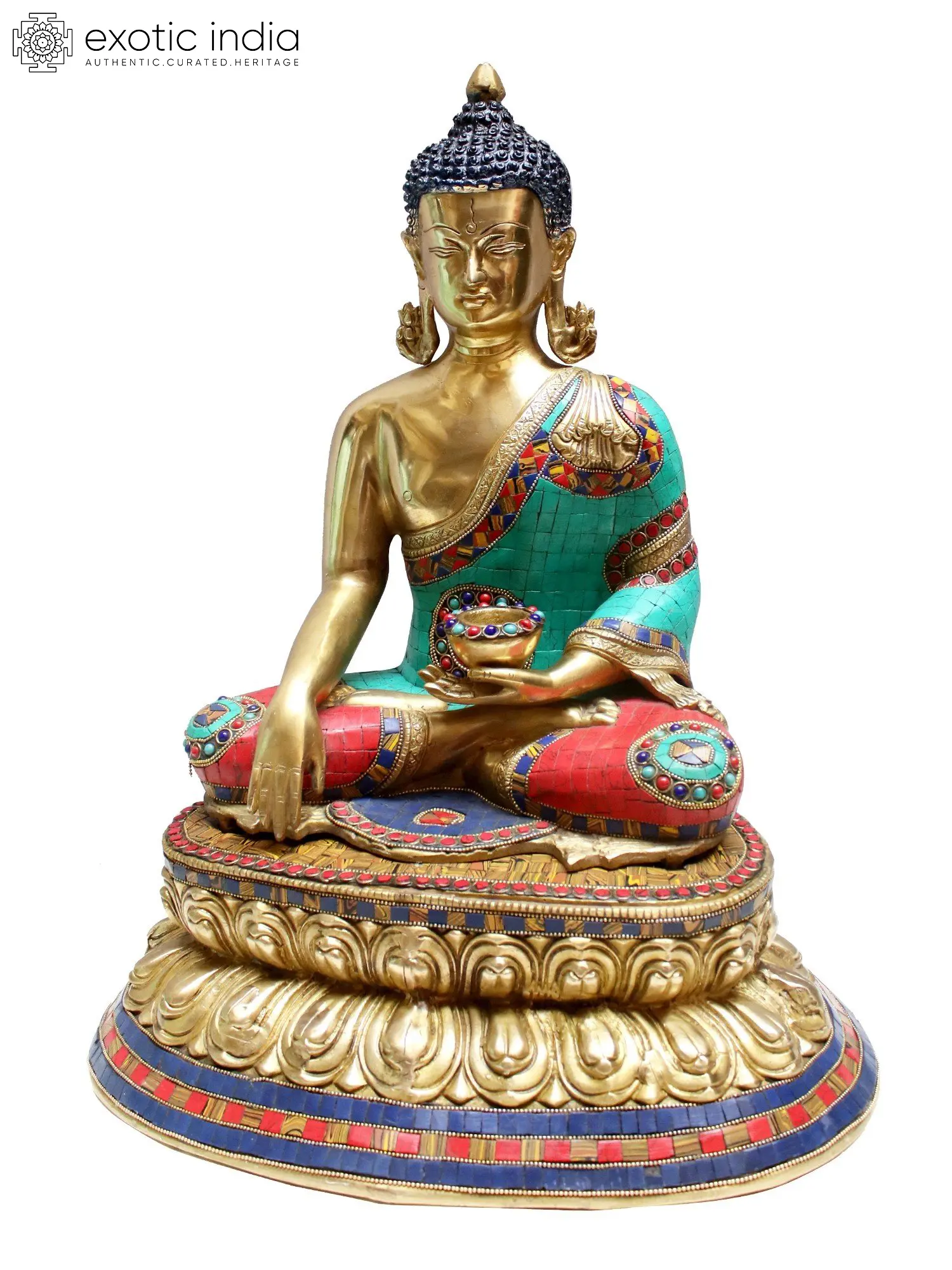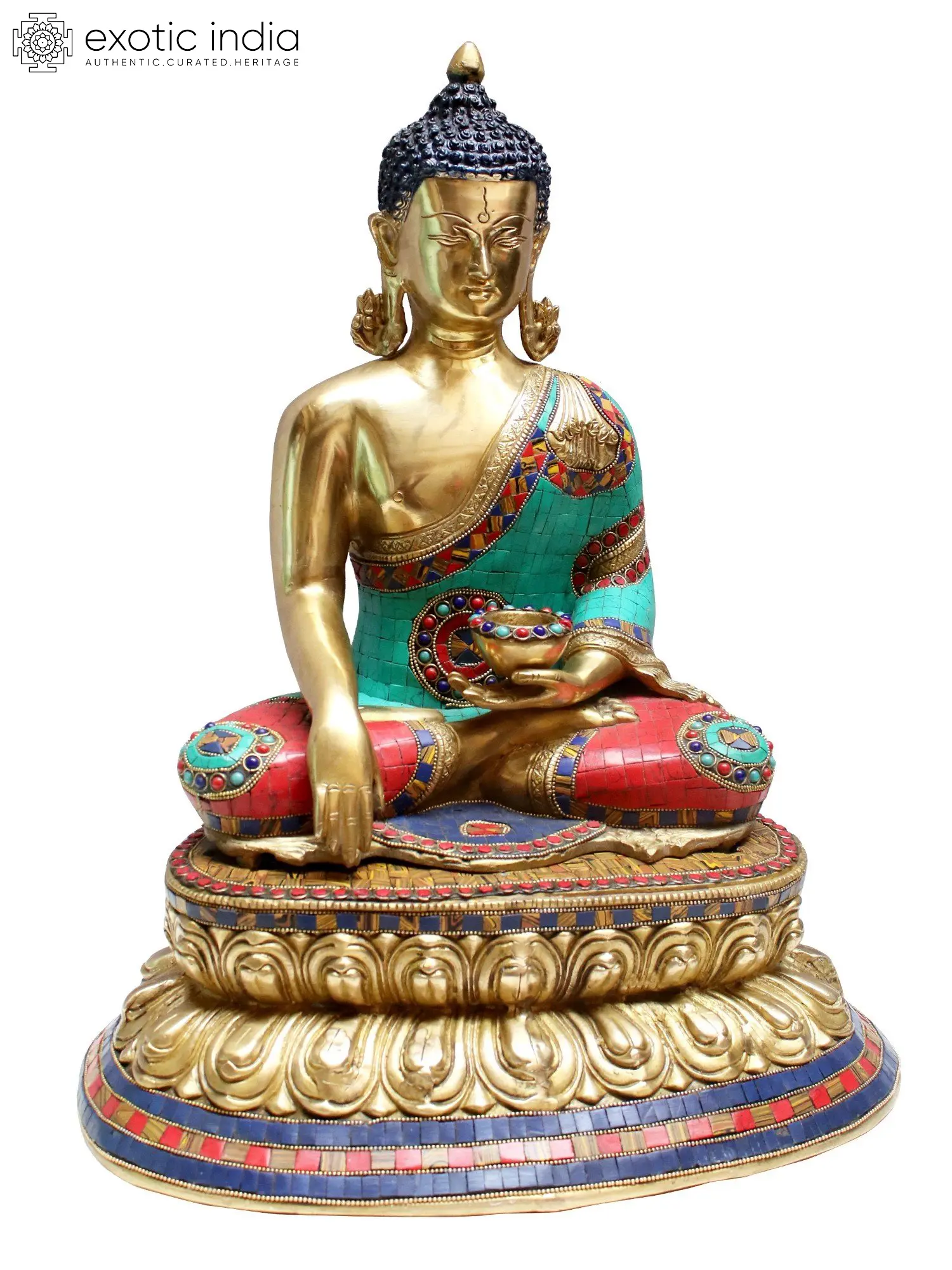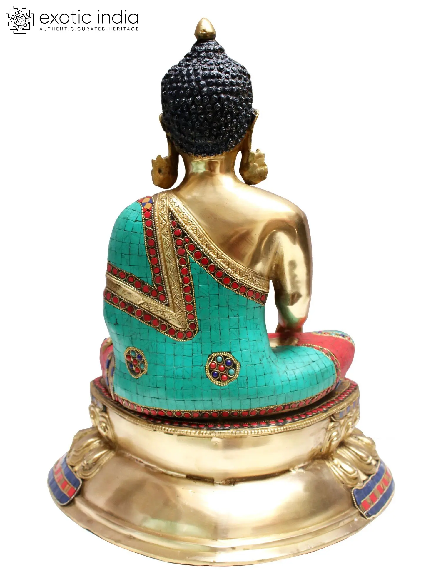 Crafted from high-quality brass, this statue exhibits a radiant sheen that speaks to its enduring nature and the reverence it embodies. The intricate details of the Buddha's serene countenance, the subtle folds of his monastic robes, and the delicate curls of his hair are all rendered with masterful skill. What elevates this piece to exceptional artistry is the exquisite inlay work adorning the robes and the base. Vibrant turquoise, rich red stones, and deep blue lapis lazuli are meticulously set, creating a mosaic of color and texture that enhances the spiritual aura of the sculpture. This fusion of metalwork and gemstone inlay is a testament to the traditional craftsmanship passed down through generations.