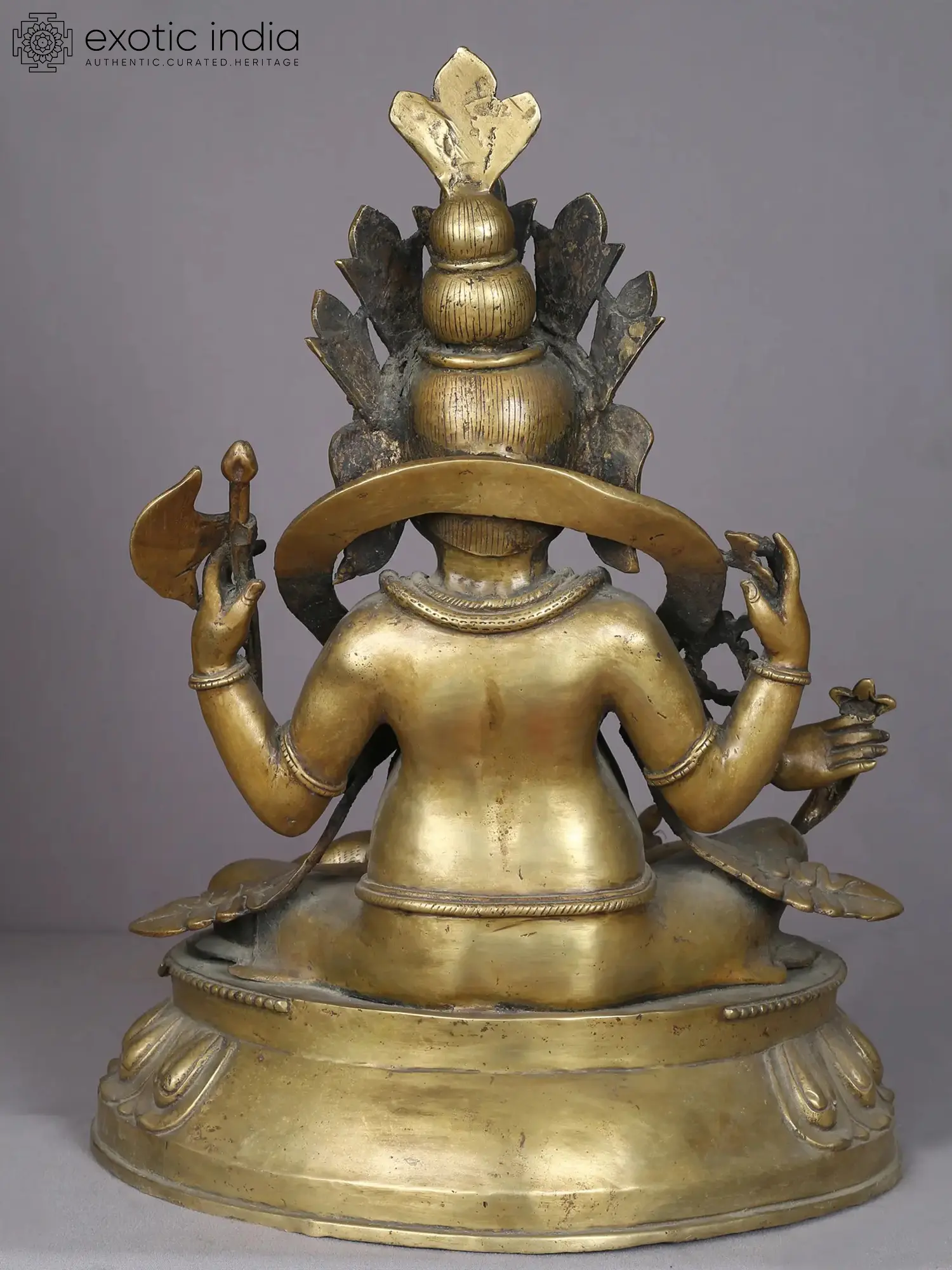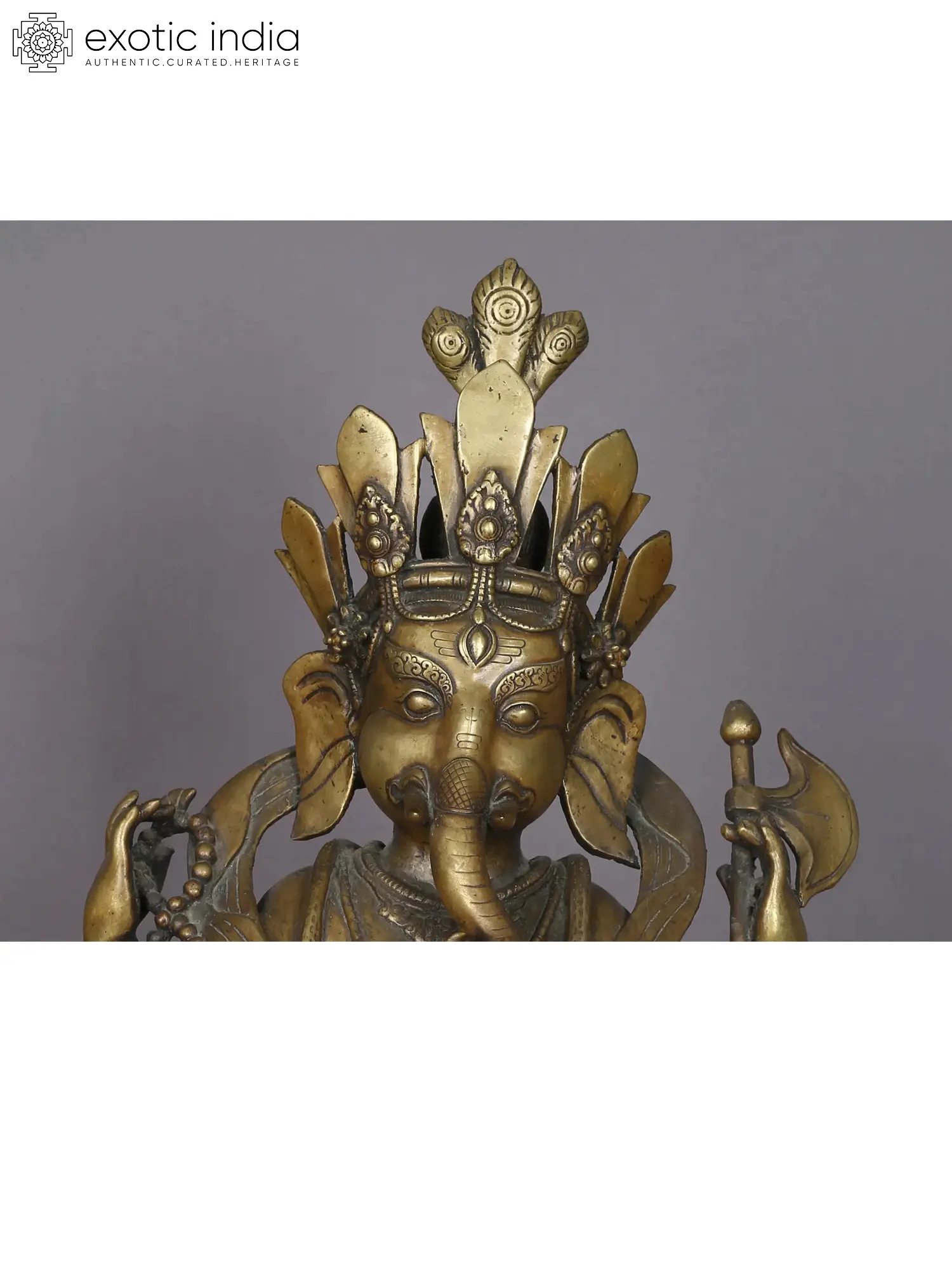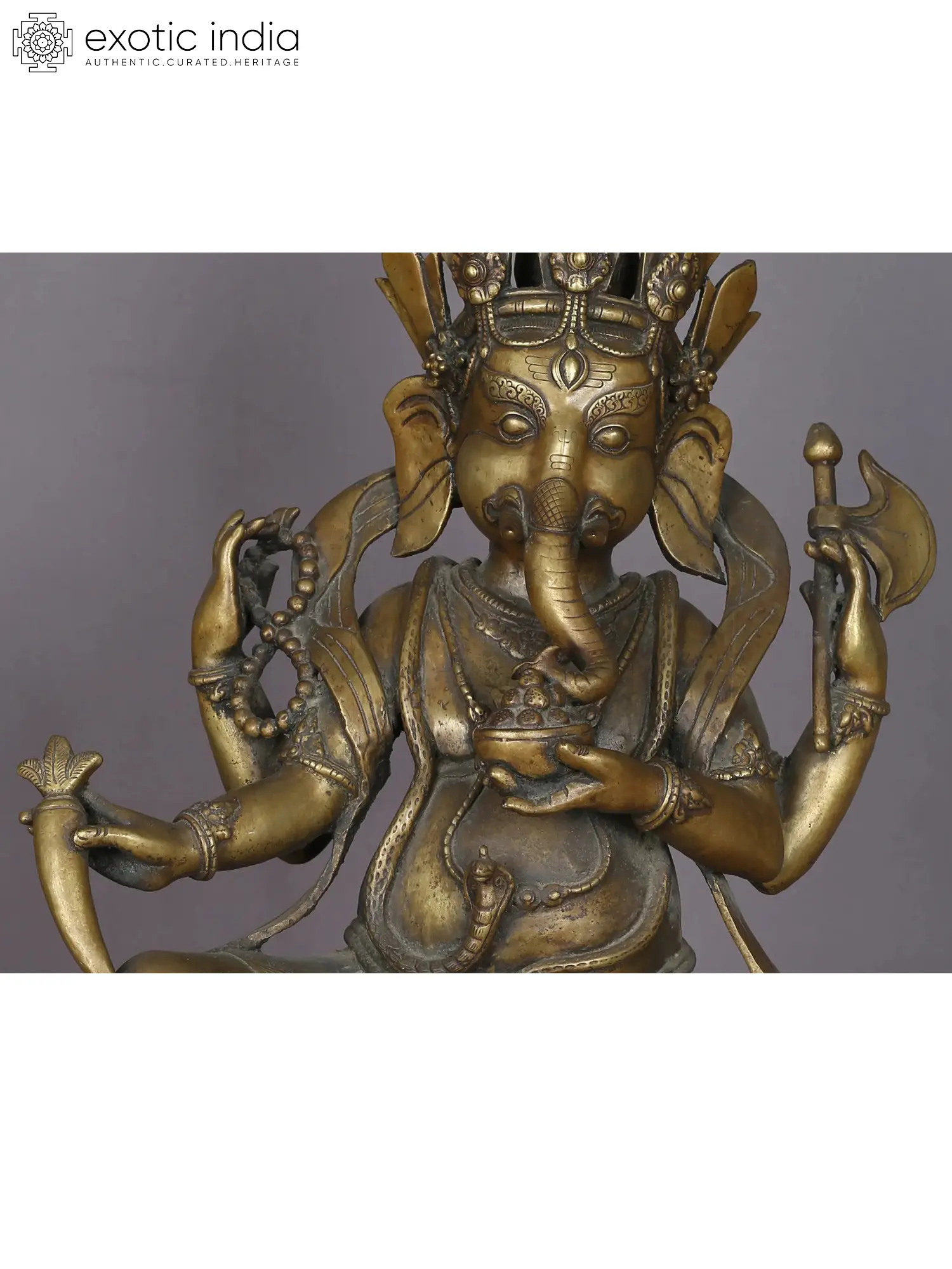 The son of Shiva and Shakti, Lord Ganesha in Newari culture is the symbol of supreme wisdom and the source of cosmic power. He is presented in the Nepalese statue in his usual four-armed form with several unusual attributes. The rosary in his hand represents the infinity of wisdom and the carrot in his hand is a symbol of agricultural richness, which is achieved by his benevolent protectiveness. On the lotus throne of Ganesha, his Mushaka offering a modaka to the elephant-faced Lord creates a devoted vision within the composition.