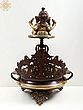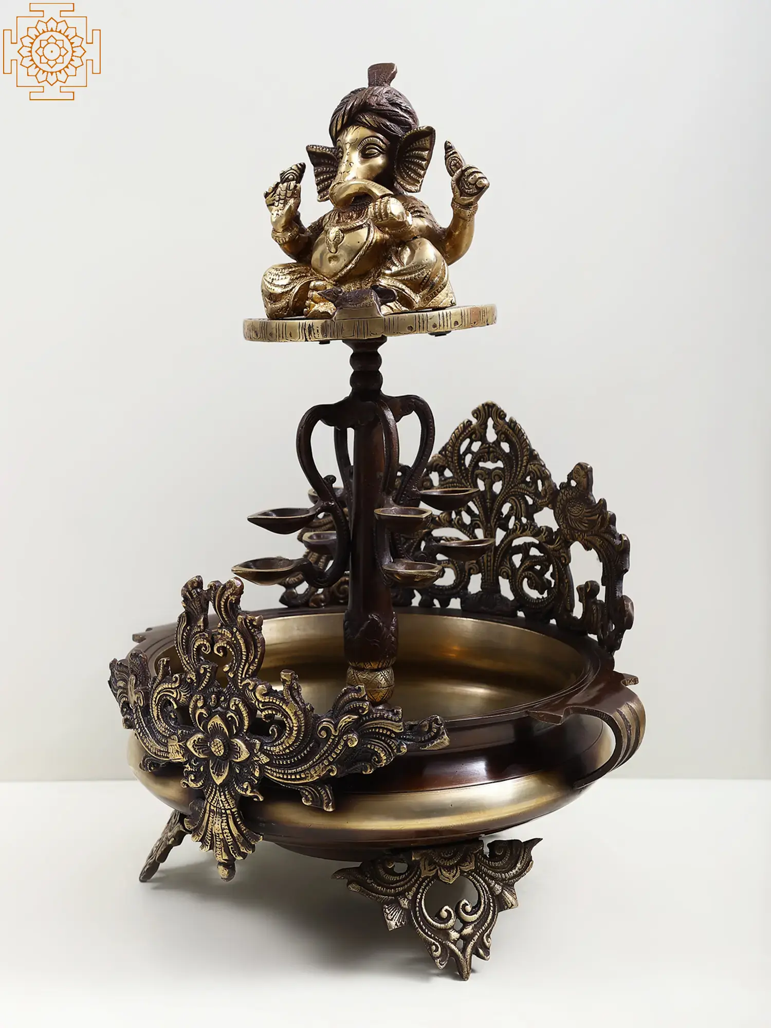 From the very centre of the urli rises a moderately long stem. At its zenith is a figurine of the seated chaturbhujadhari Lord Ganesha. Along this stem is a multitude of shapely, voluminous dias which, when filled with ghee and lit up in the evenings, would add to the auspiciousness of your space.