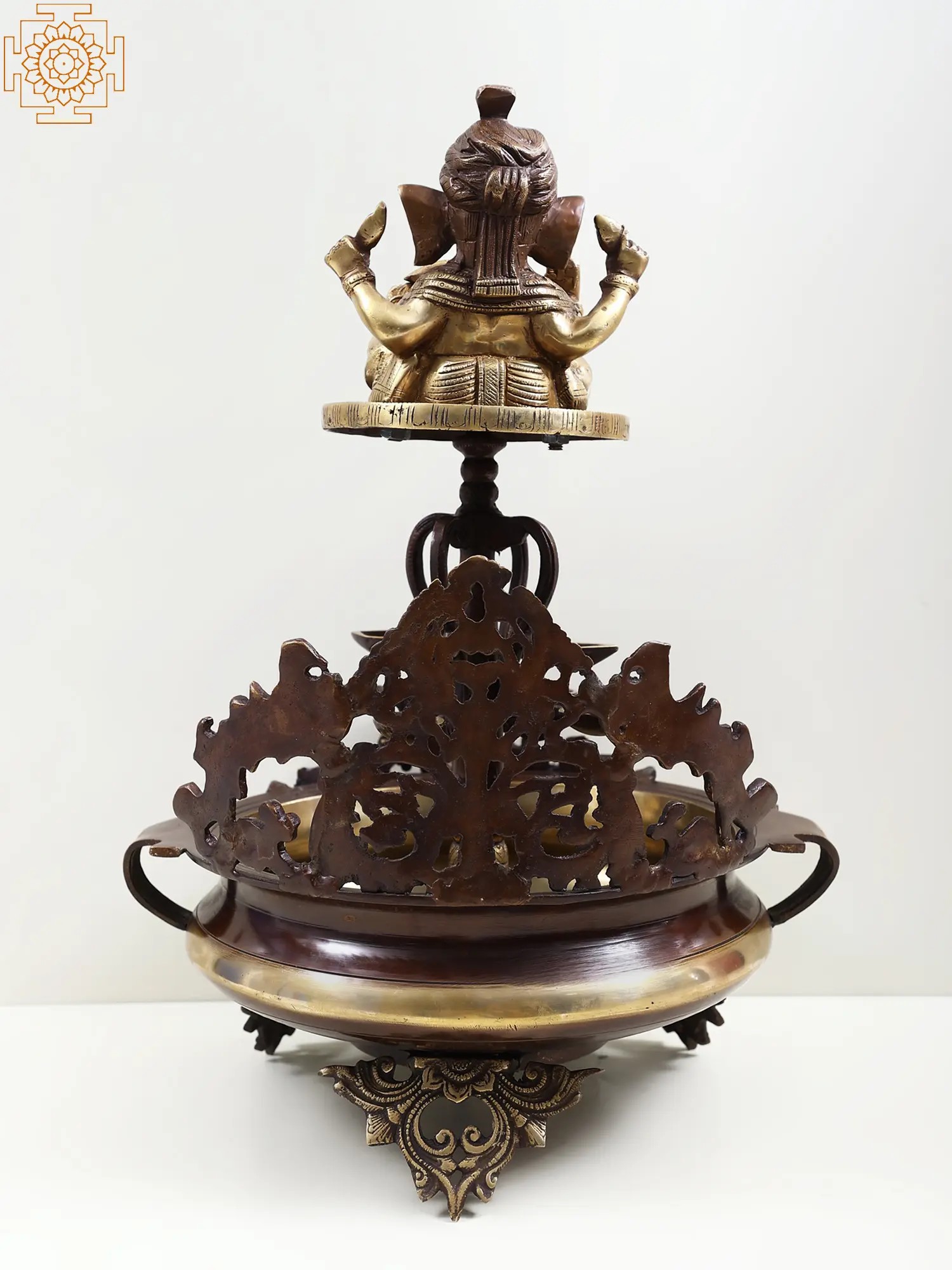 A gorgeous Ganesha metal urli to grace the home or office of the truly devoted. The urli is a traditional Indian home decor element. It is as auspicious as it is aesthetic. The decorative brass urli that you see on this page is a particularly beautiful sculpture, and an example of superb sculpting skill.