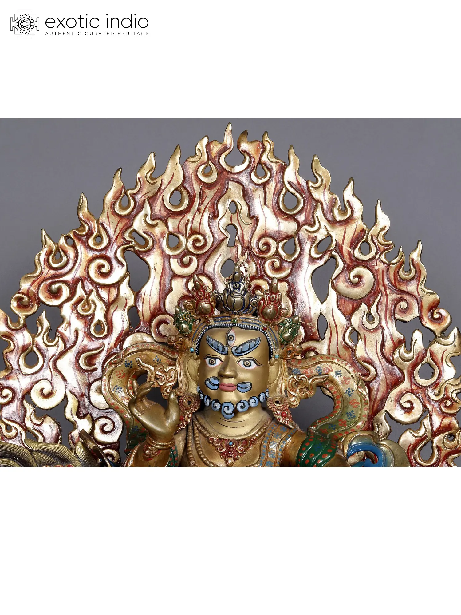 This magnificent sculpture captures the very essence of Jambhala, revered in Tibetan Buddhism as the deity of wealth and prosperity. Also known as Kubera, this powerful figure is an embodiment of material abundance and spiritual riches. Crafted with meticulous artistry from copper and adorned with intricate gold detailing, this statue hails from the hallowed grounds of Nepal, a land steeped in spiritual heritage and renowned for its exquisite craftsmanship. The vibrant hues and detailed embellishments speak volumes about the skill and devotion poured into its creation, making it a truly captivating masterpiece.