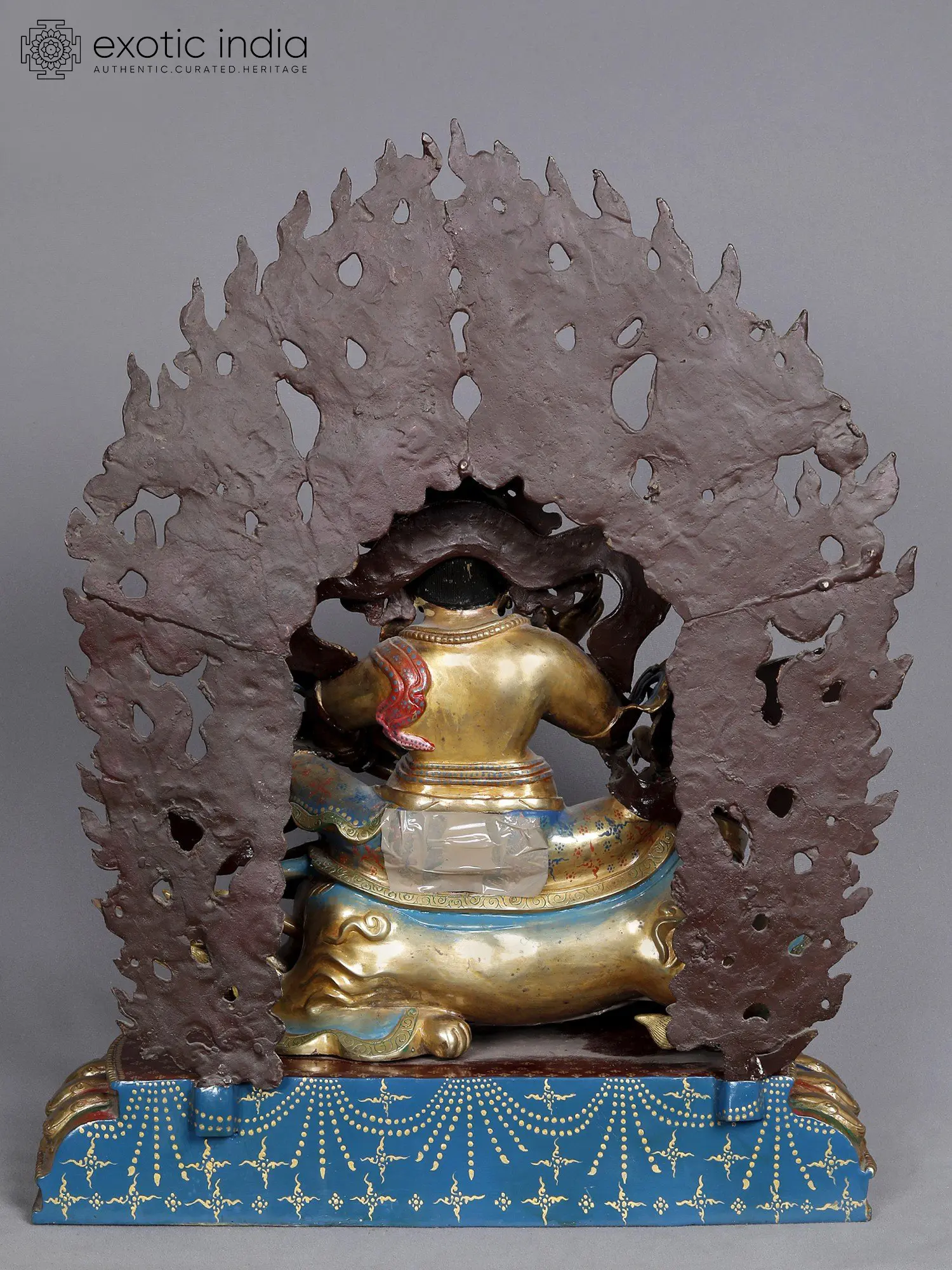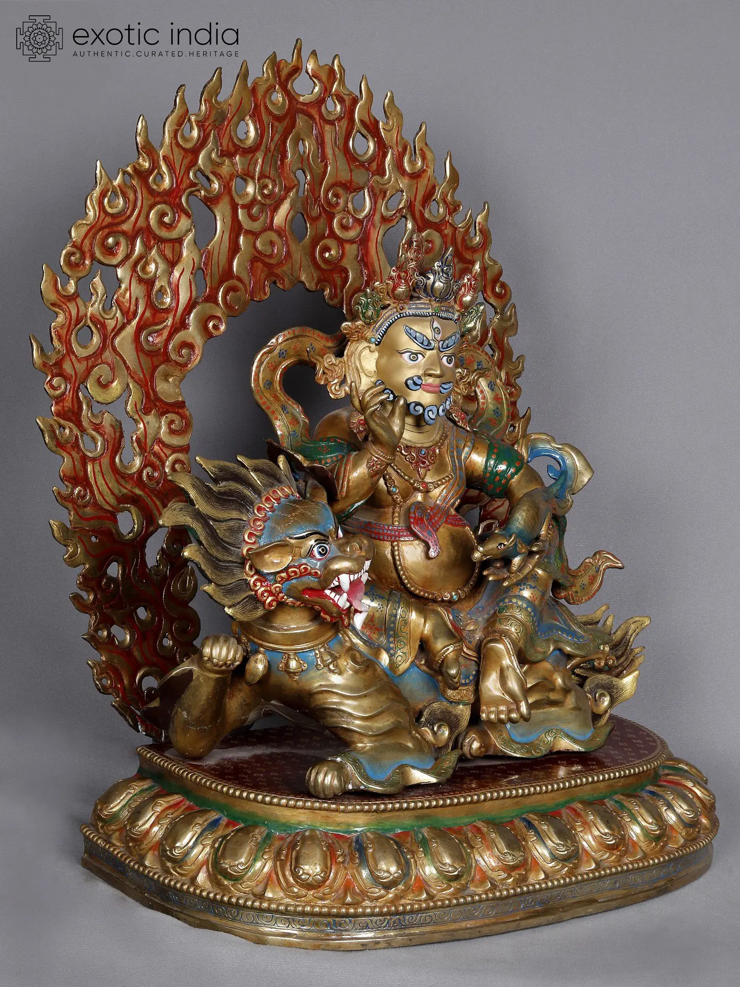 The fiery Kubera sits in a distinctive pose as riding access to the three realms of existence atop a Tibetan snow lion. Adorned in a resplendent golden dhoti that shimmers in the light, Kubera is bedecked with lavish gold jewels that embellish his form, harmonizing beautifully with his traditional Tibetan-style crown. With his characteristic plump figure and a commanding paunch, Kubera's realistic expression and fiery web exude authority. This sculpture captures Kubera's essence in its undistinguished Tibetan form, featuring two arms. The one hand cradles a mongoose, a representation of wealth and fortune, or Nakula.