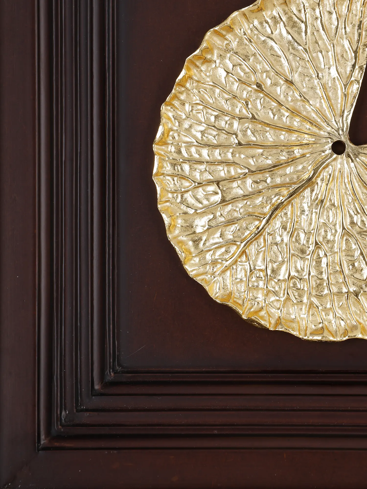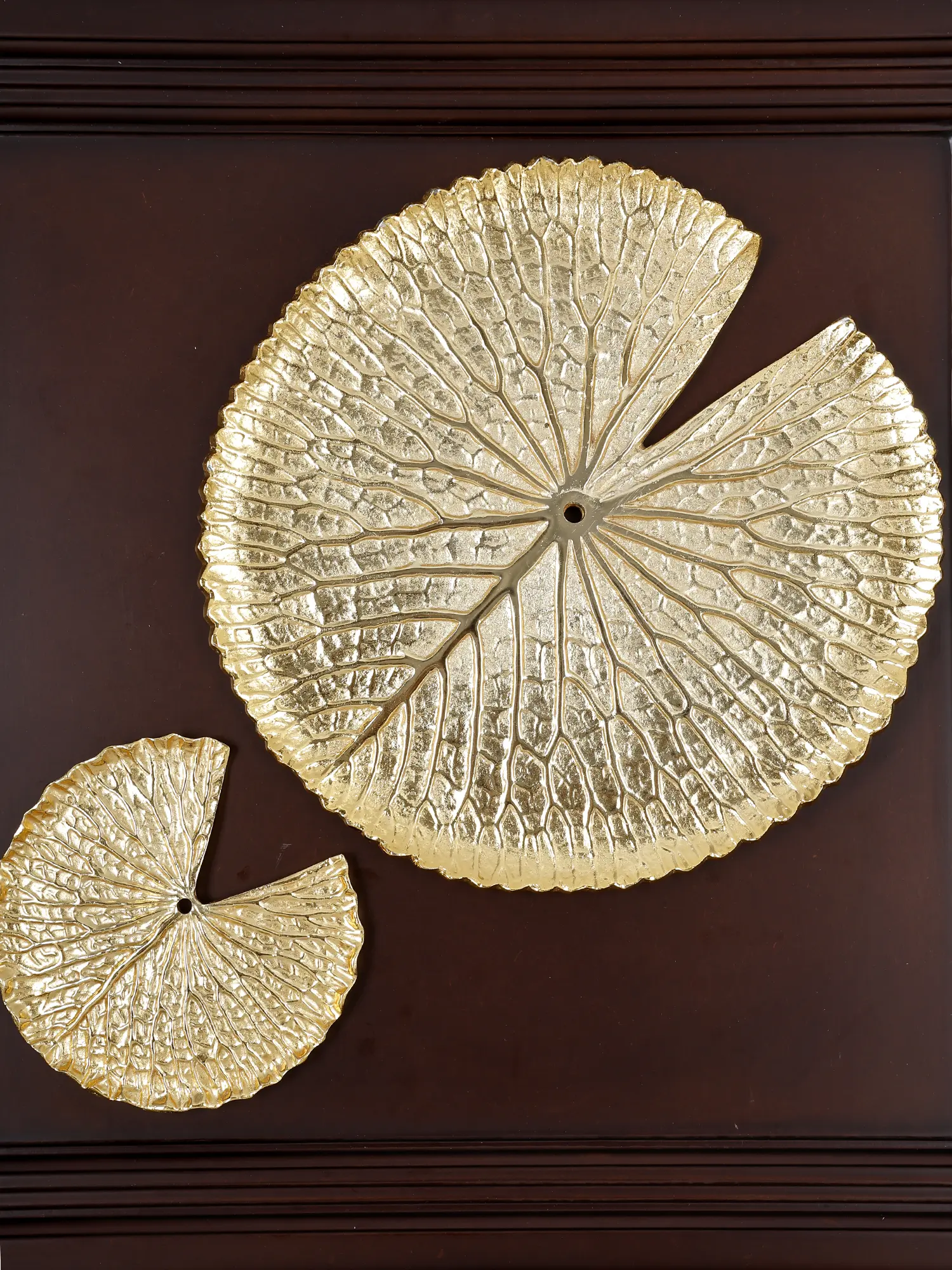 This stunning brass and wood decor depicting golden lotus leaves transforms nature's beauty into a refined work of art.