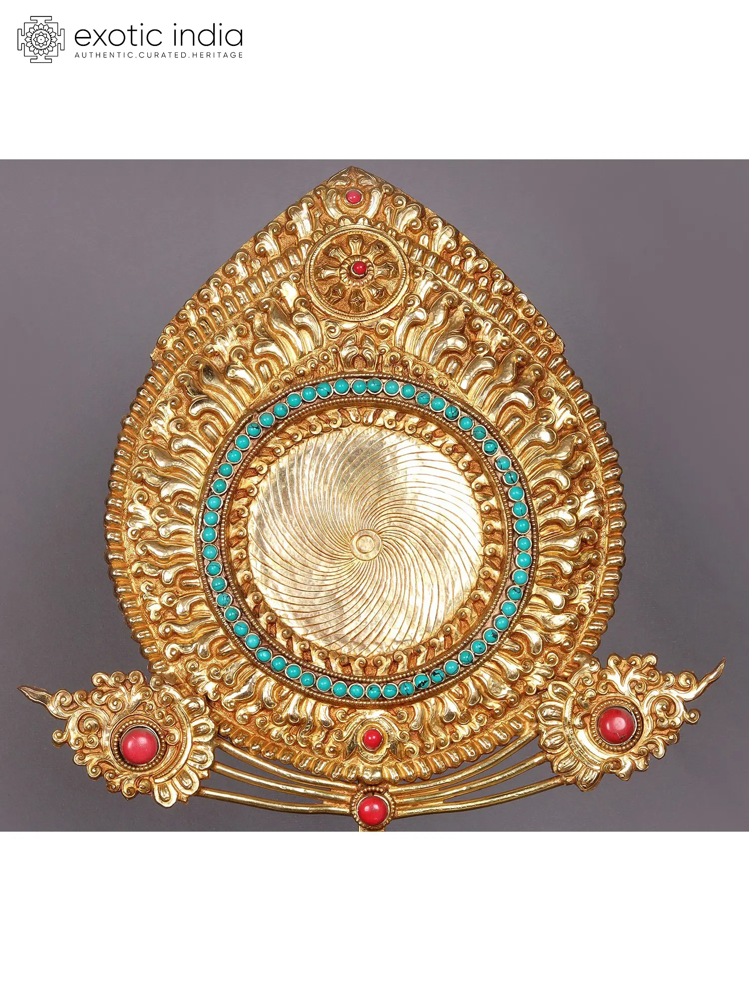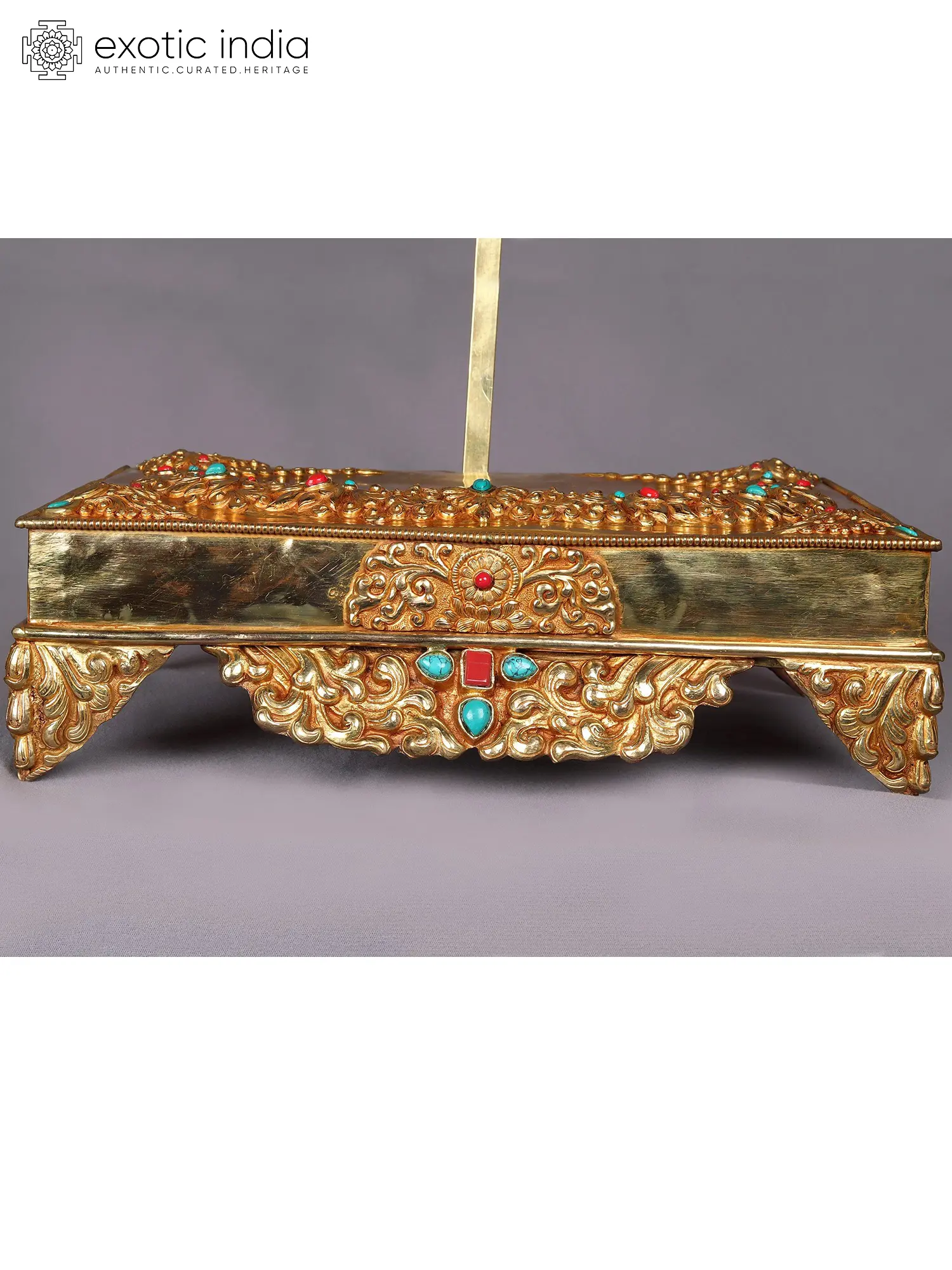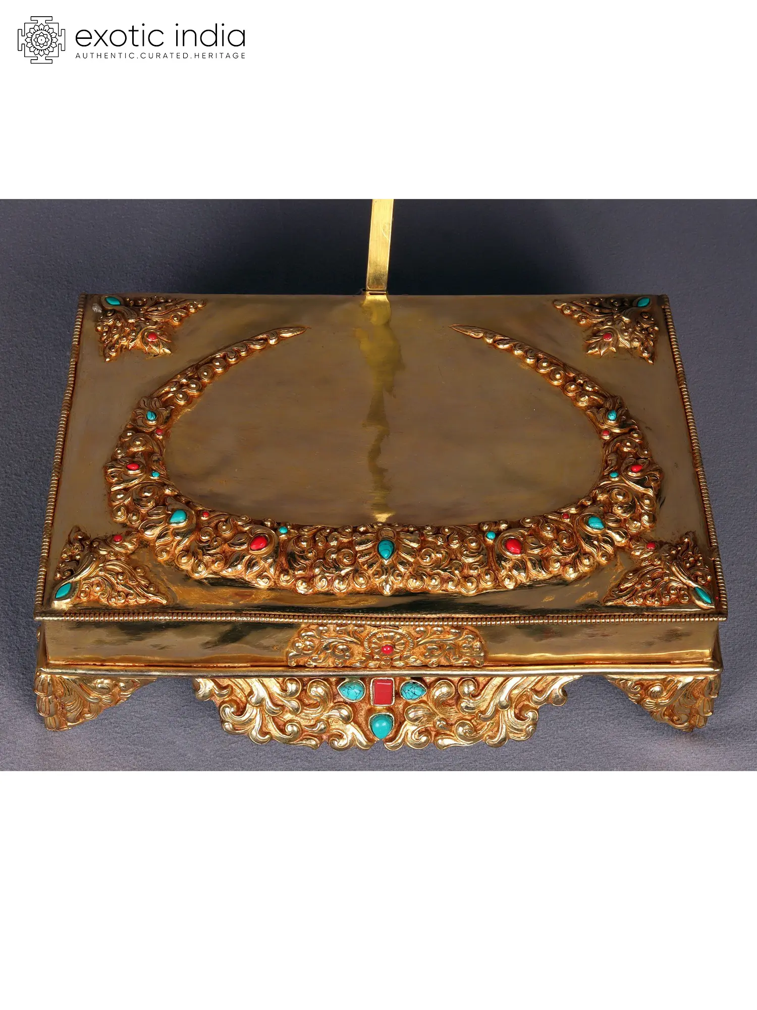 He is shown seated on a Golden Singhasan. This singhasan is decorated with blue and red stones. The chowki represents the royal supremacy that the Buddha left behind to attain enlightenment.