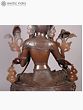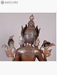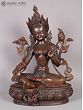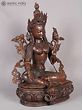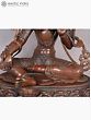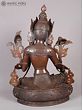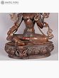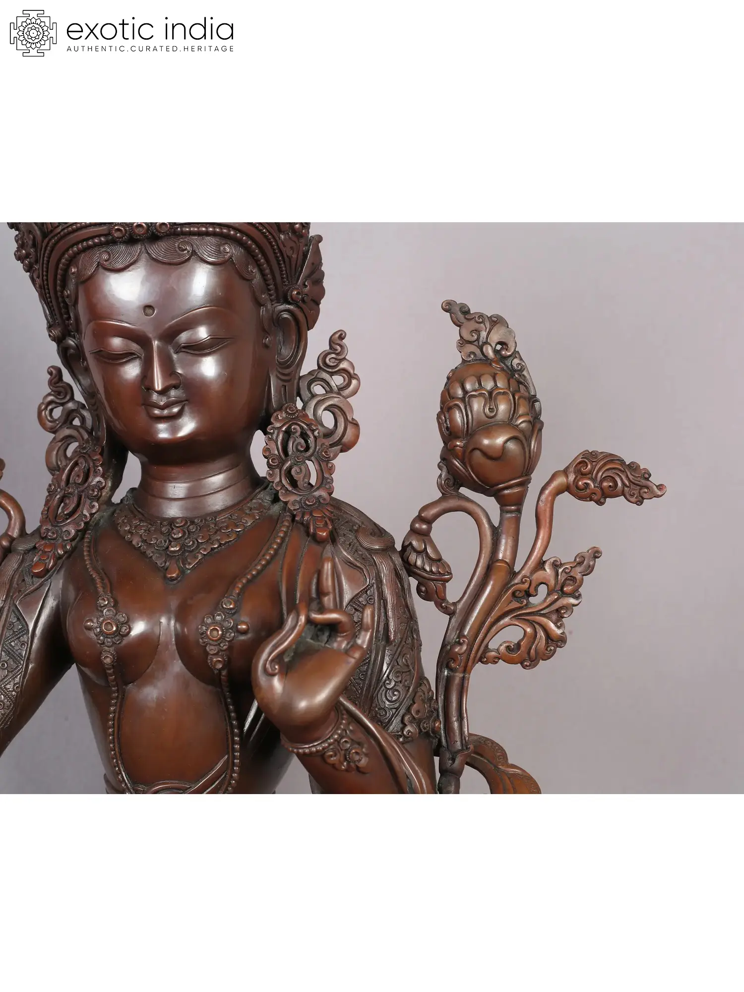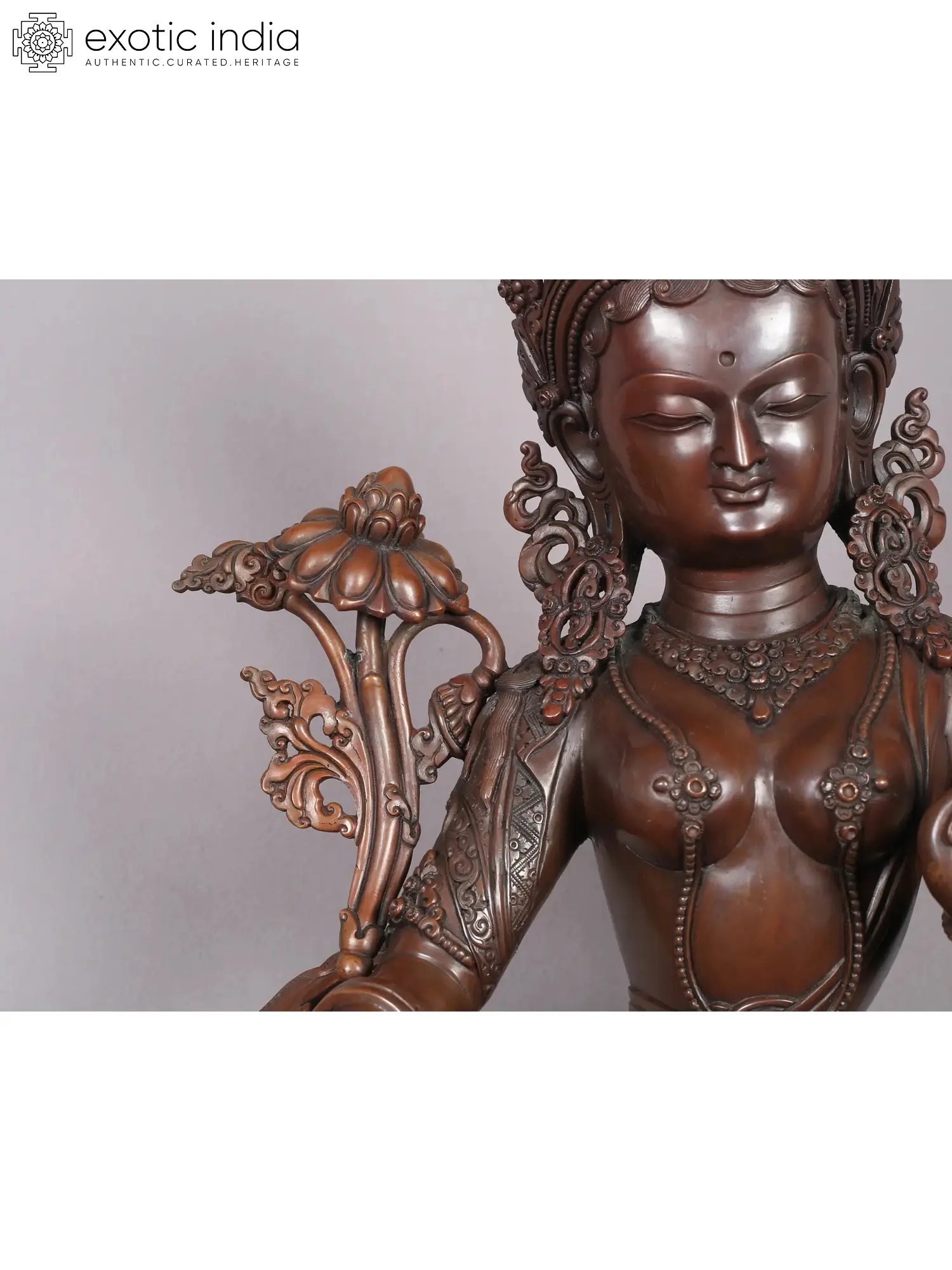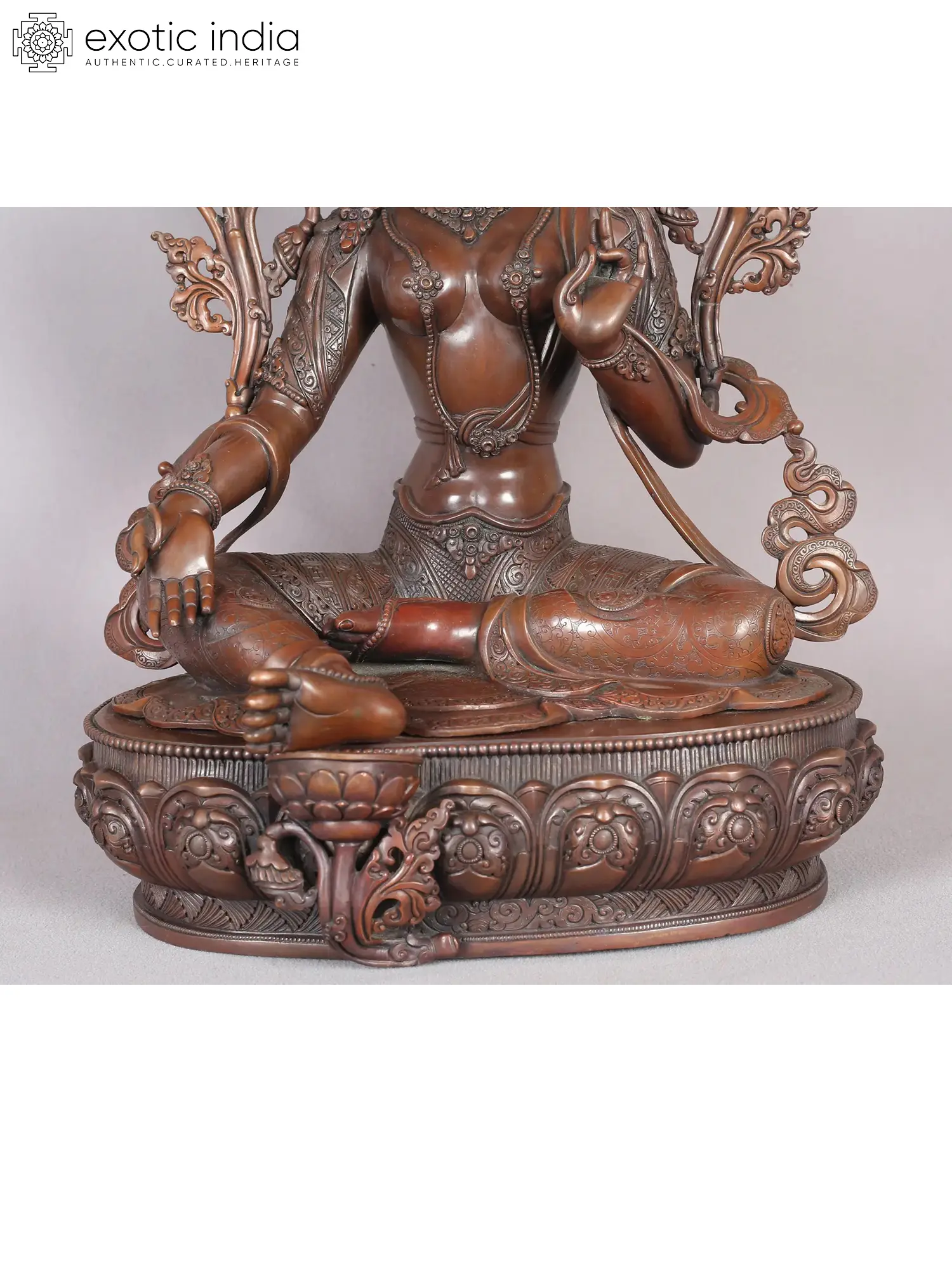 Compassion and enlightenment incarnate, Green Tara in this monochrome copper statue from Nepal appears blissfully divine. The goddess is seated on a beautiful lotus seat, with her extended foot placed on a blooming lotus. She has an elaborate hairstyle and wears the five-pronged Buddhist crown and a multitude of traditional Nepalese jewelry.