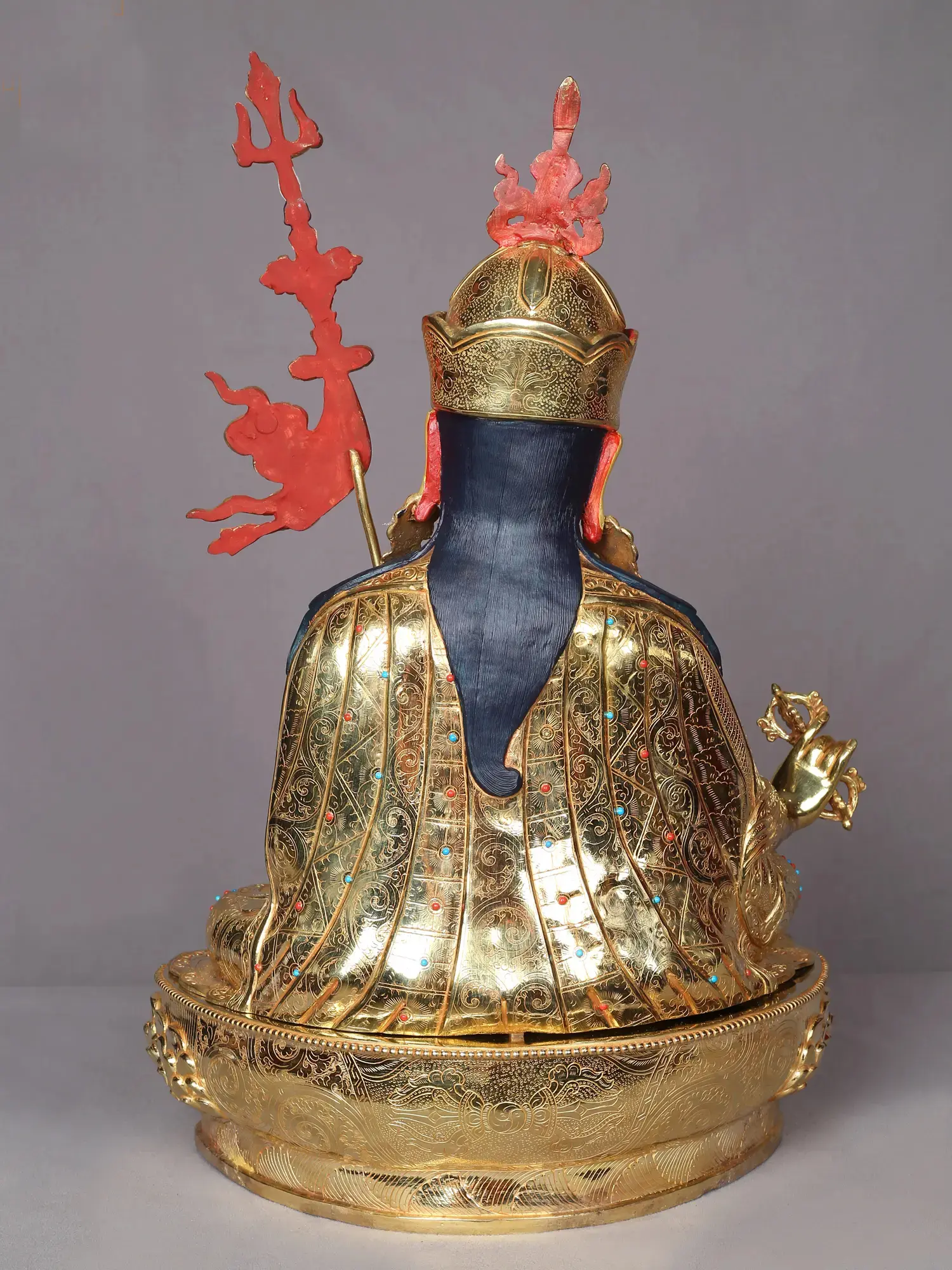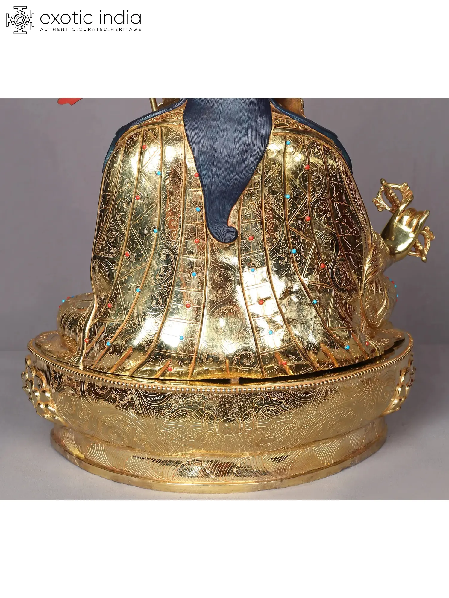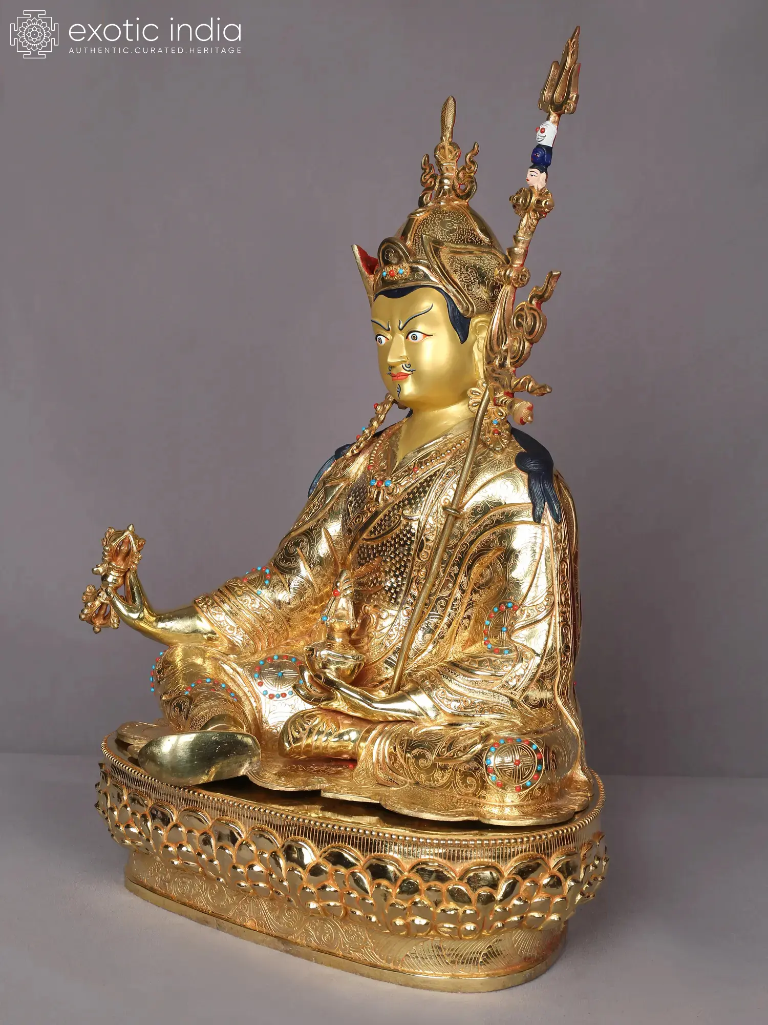 Padmasambhava- the lotus-born teacher in Himalayan Buddhism is the great master for innumerable students, who are guided by the enlightened light of the teacher on the difficult path of their life. The intricately adorned gilded copper Padmasambhava statue from Nepal depicts the powerful master in an emotive mood, wearing his characteristic qualities decorated with minute patterns and studded with stones. Vajra, a pot of ambrosia, and a staff with three heads form the attributes of Padmasambhava in this icon, on whose reverse is the thunderbolt and intricate detailing on the robes of the master.