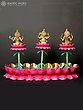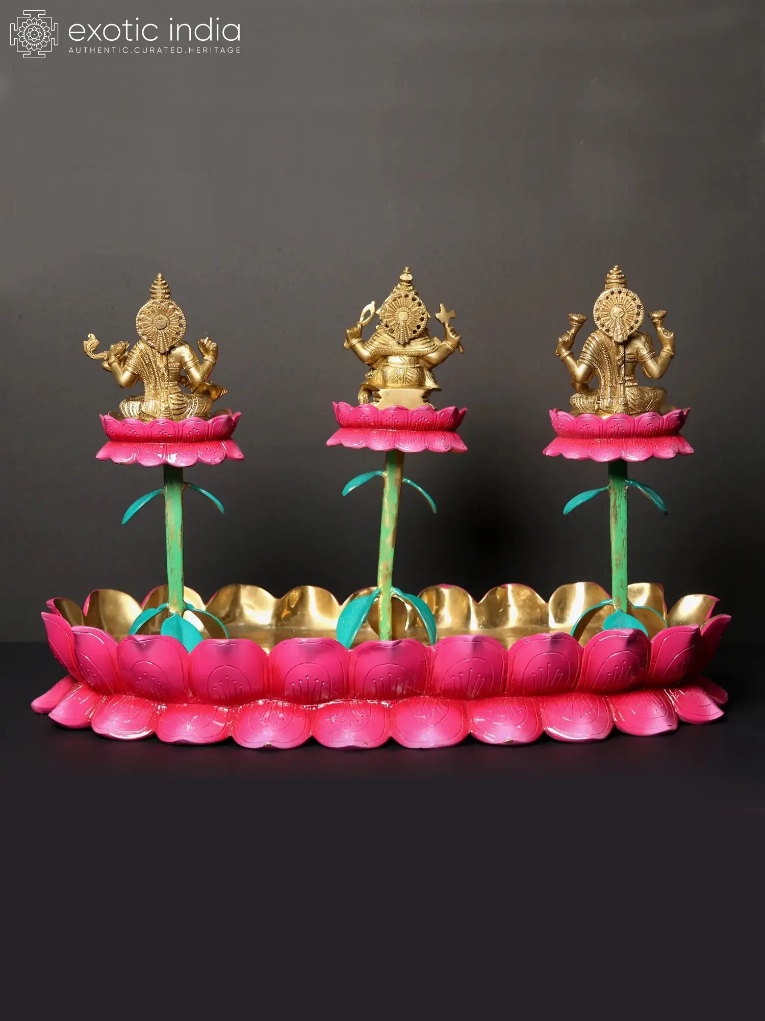 This brass statue features the divine trio of Goddess Lakshmi, Goddess Saraswati, and Lord Ganesha, each seated gracefully on beautiful pink lotuses with vibrant blue-green stalks and leaves. Their serene and majestic presence is perfectly captured, making this piece an exquisite addition to any space.