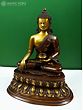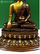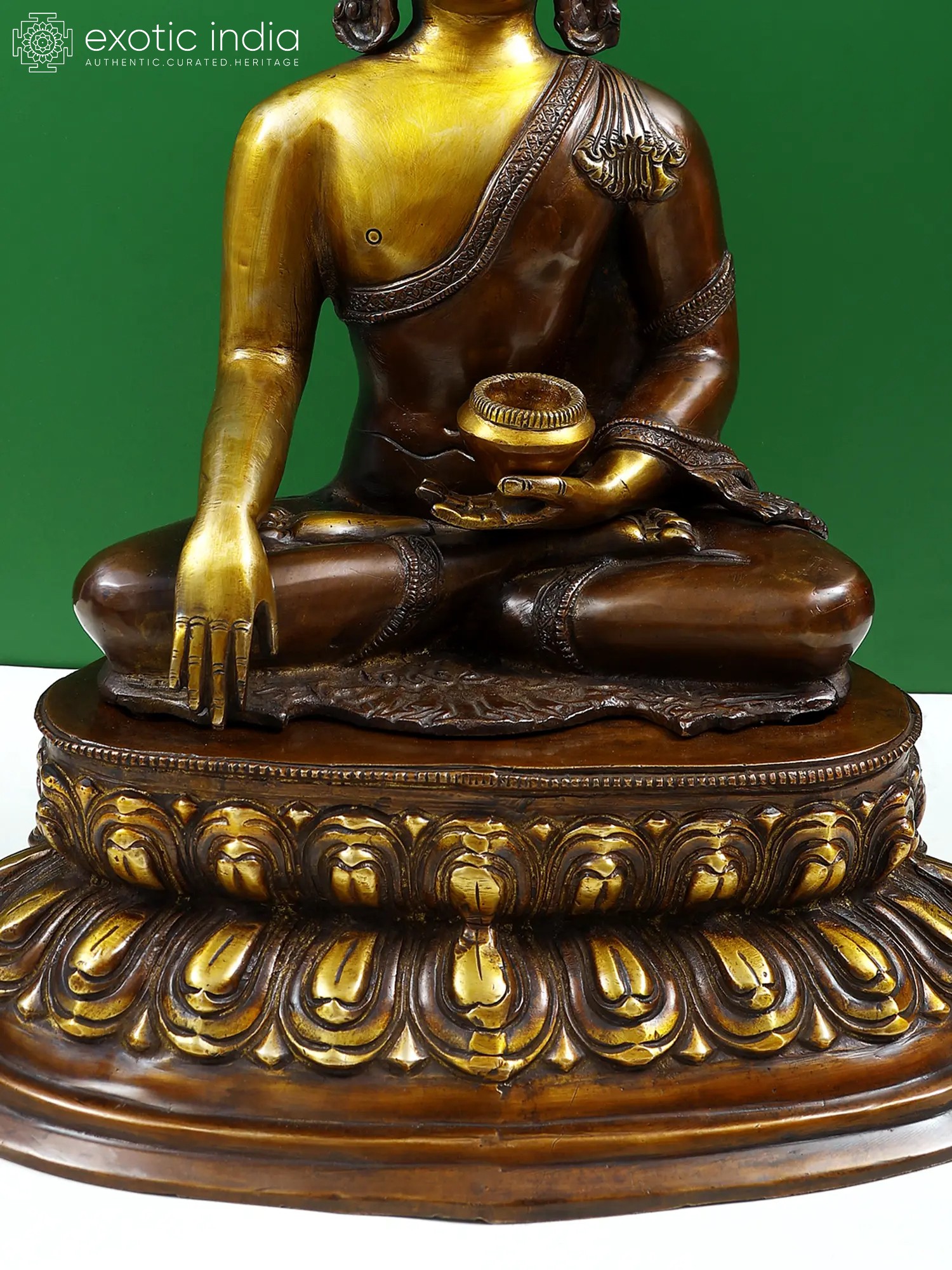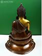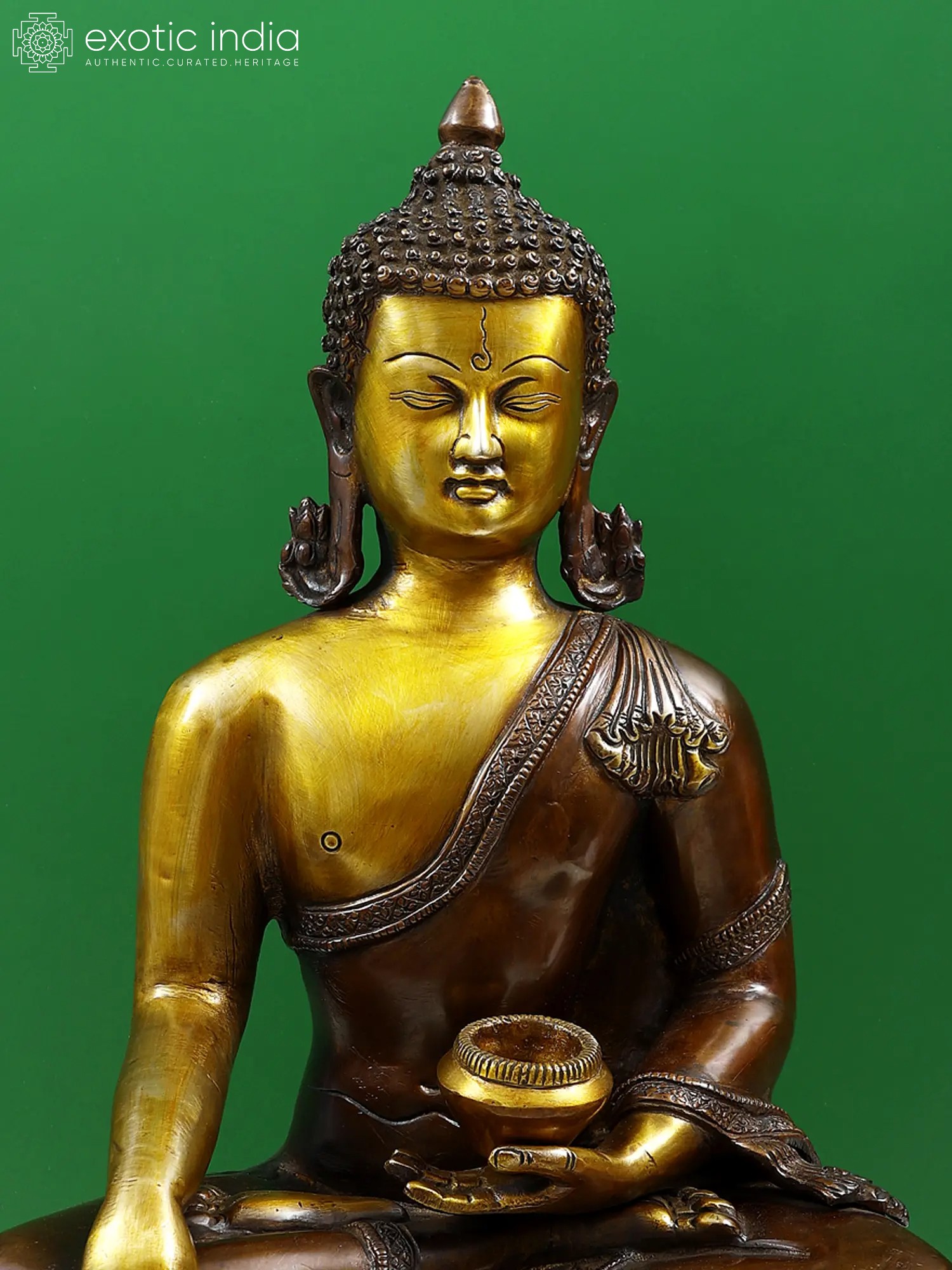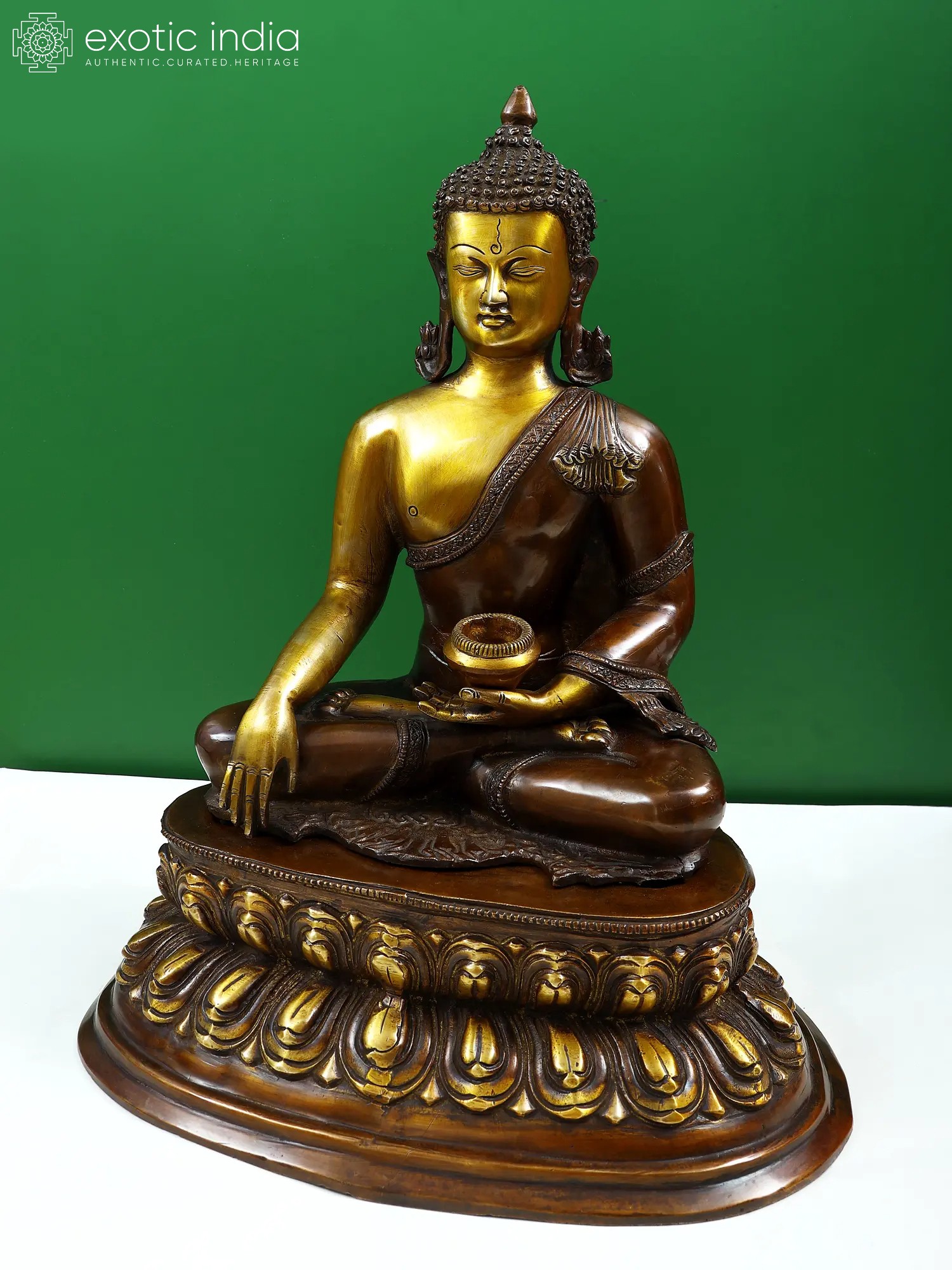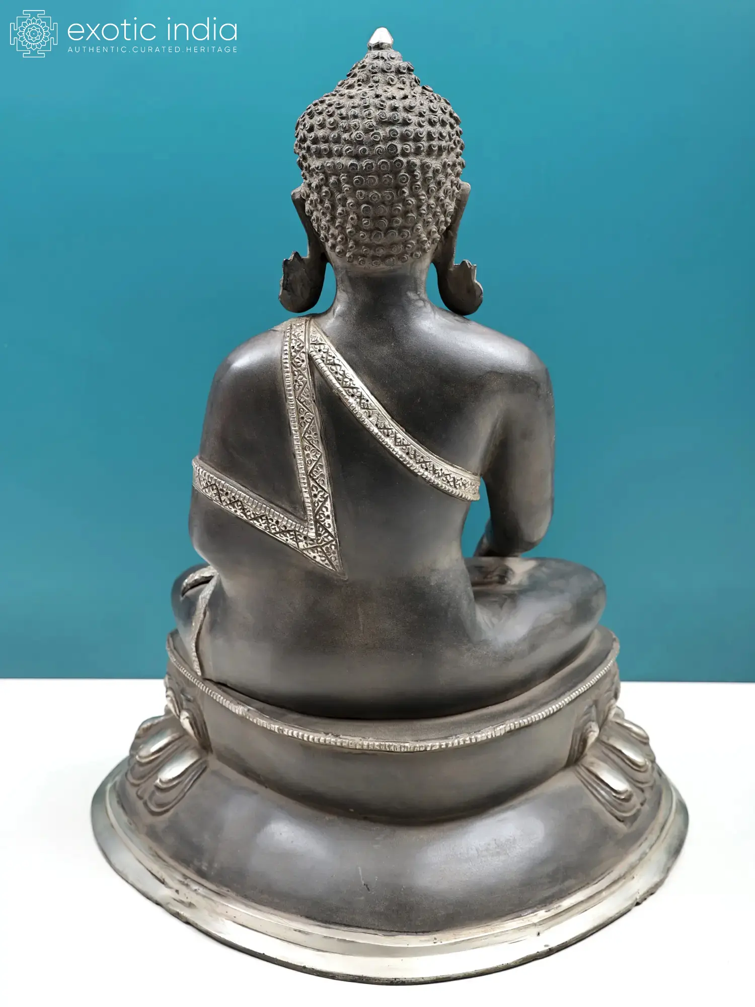 Crafted from high-quality brass, this statue is a testament to the skill and dedication of the artisan. The dark, rich tone of the brass provides a striking contrast to the intricately detailed silver accents that adorn the Buddha's robes and ornamentation. The delicate band around his neck and shoulders, as well as the trim on his monastic garment, are rendered with remarkable precision, adding a regal and spiritual aura to the piece. His serene facial expression, with downcast eyes and a gentle, knowing smile, embodies the tranquility and wisdom that comes with complete liberation. The meticulously sculpted curls of his hair and the urna on his forehead further enhance the lifelike quality and spiritual depth of this sacred representation.