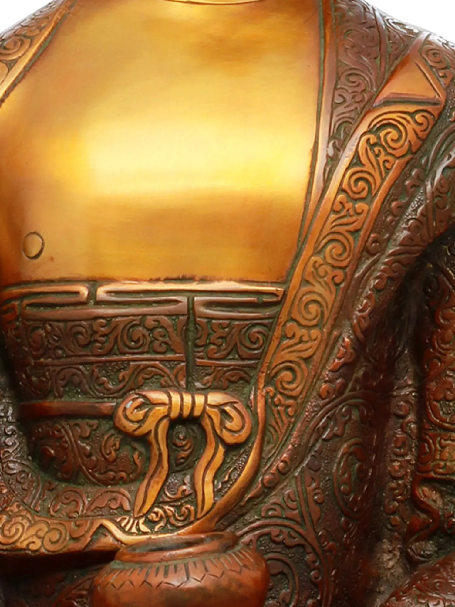 Crafted with meticulous attention to detail by skilled artisans in India, this statue is a testament to traditional craftsmanship. The lustrous brass material lends a timeless quality to the sculpture, its golden hue emanating warmth and spiritual radiance. The intricate carving of the Buddha's robe is particularly striking, adorned with elaborate patterns that speak to the rich artistic heritage of Tibetan Buddhism. The flowing folds of the sanghati, the monastic robe, are rendered with a realism that suggests movement and grace, even in stillness. This detailed ornamentation not only enhances the aesthetic appeal but also imbues the sculpture with a sense of sacredness and reverence.