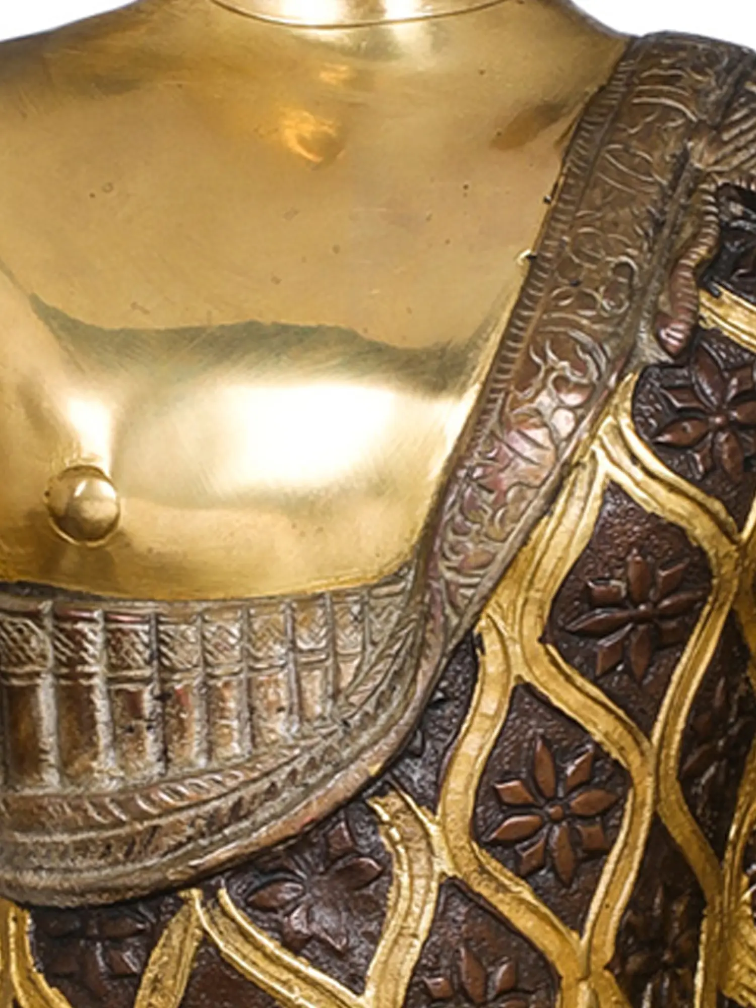 Handcrafted with meticulous attention to detail by skilled artisans in India, this statue is a testament to centuries of artistic heritage. The rich, lustrous brass is expertly molded and finished, showcasing the intricate folds of the Buddha's robes and the delicate features of his face. The darker patinated accents on the robes and the lotus base create a striking contrast, adding depth and visual richness to the piece. The lotus pedestal itself, a sacred symbol in many Eastern traditions, represents purity, spiritual awakening, and the unfolding of consciousness, further enhancing the spiritual significance of the sculpture.