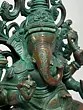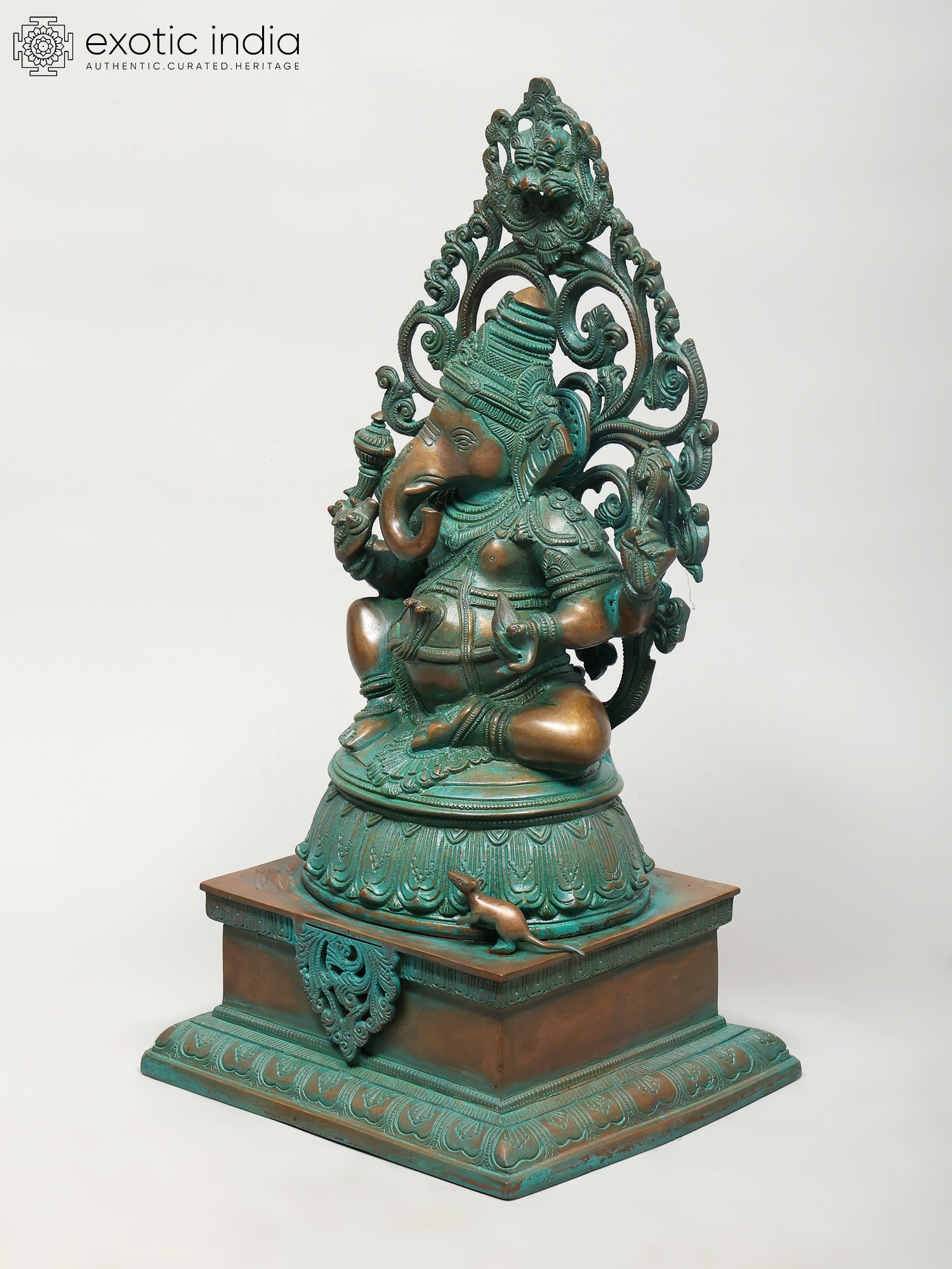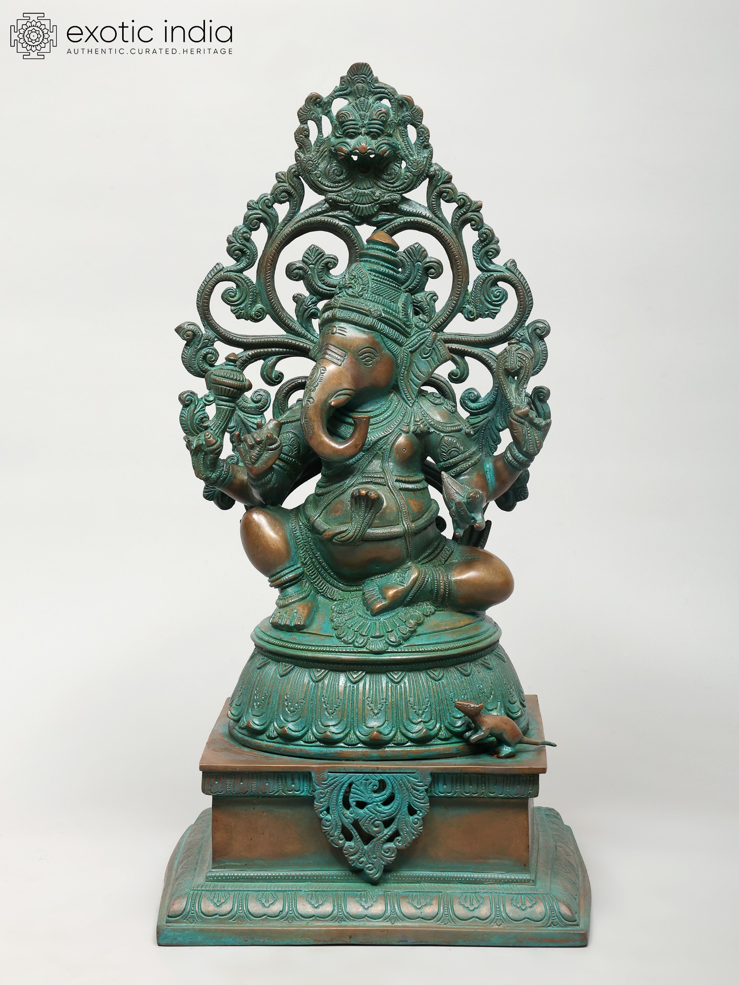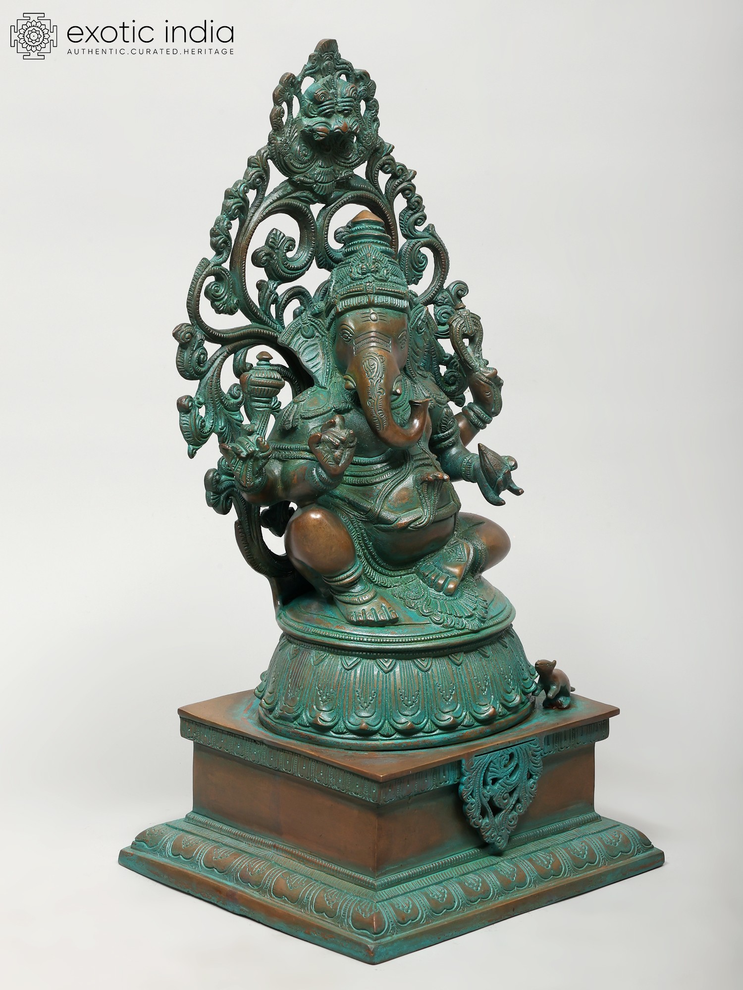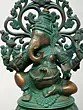 A neatly gathered Ganesha murti. Seated on an ornate, multi-tiered plinth. It is a compact, longline composition wherein the plinth is almost half the size of the overall composition. It would look great poised within the portable in-home or -office temple of the modern-day devotee.