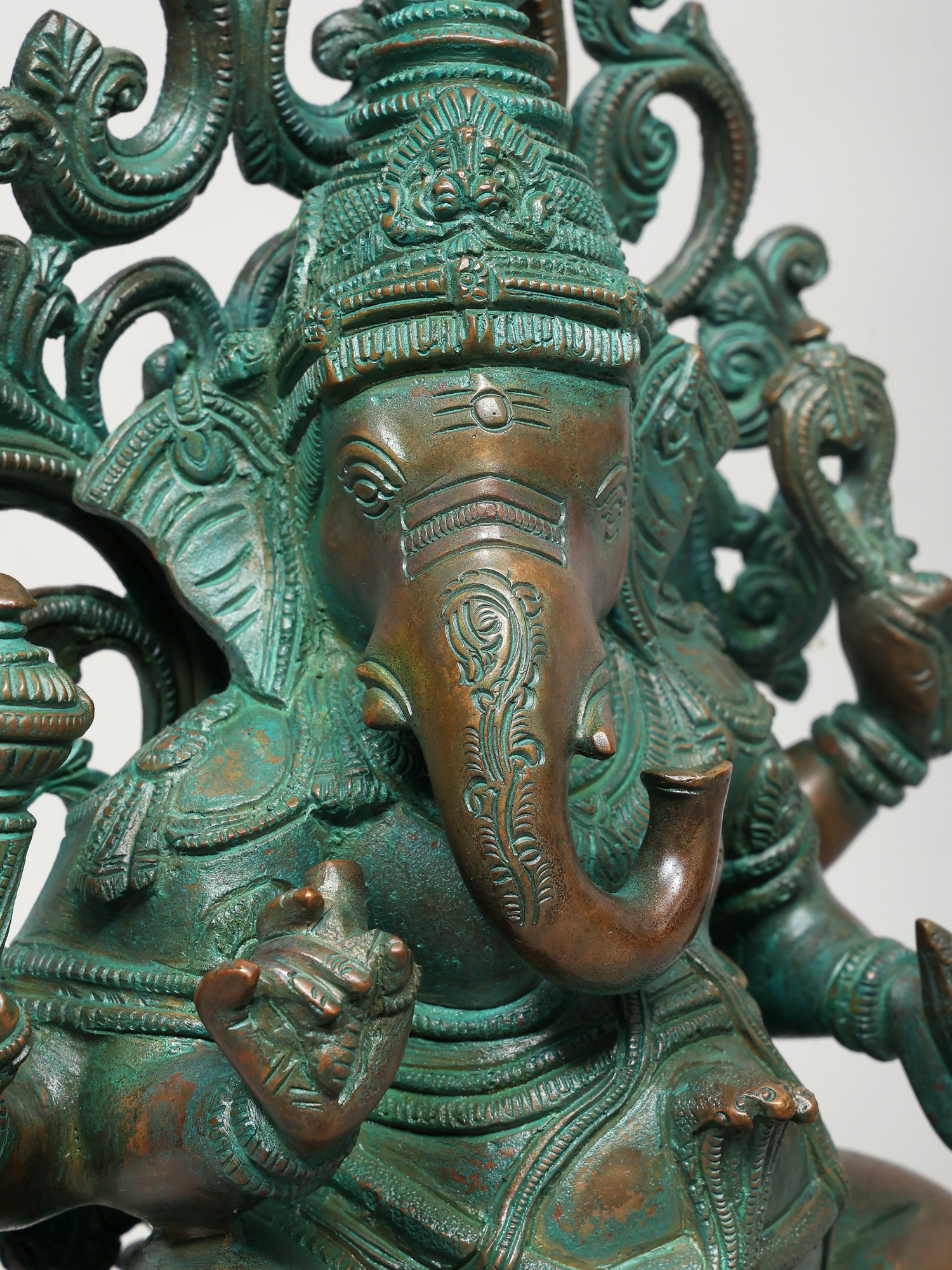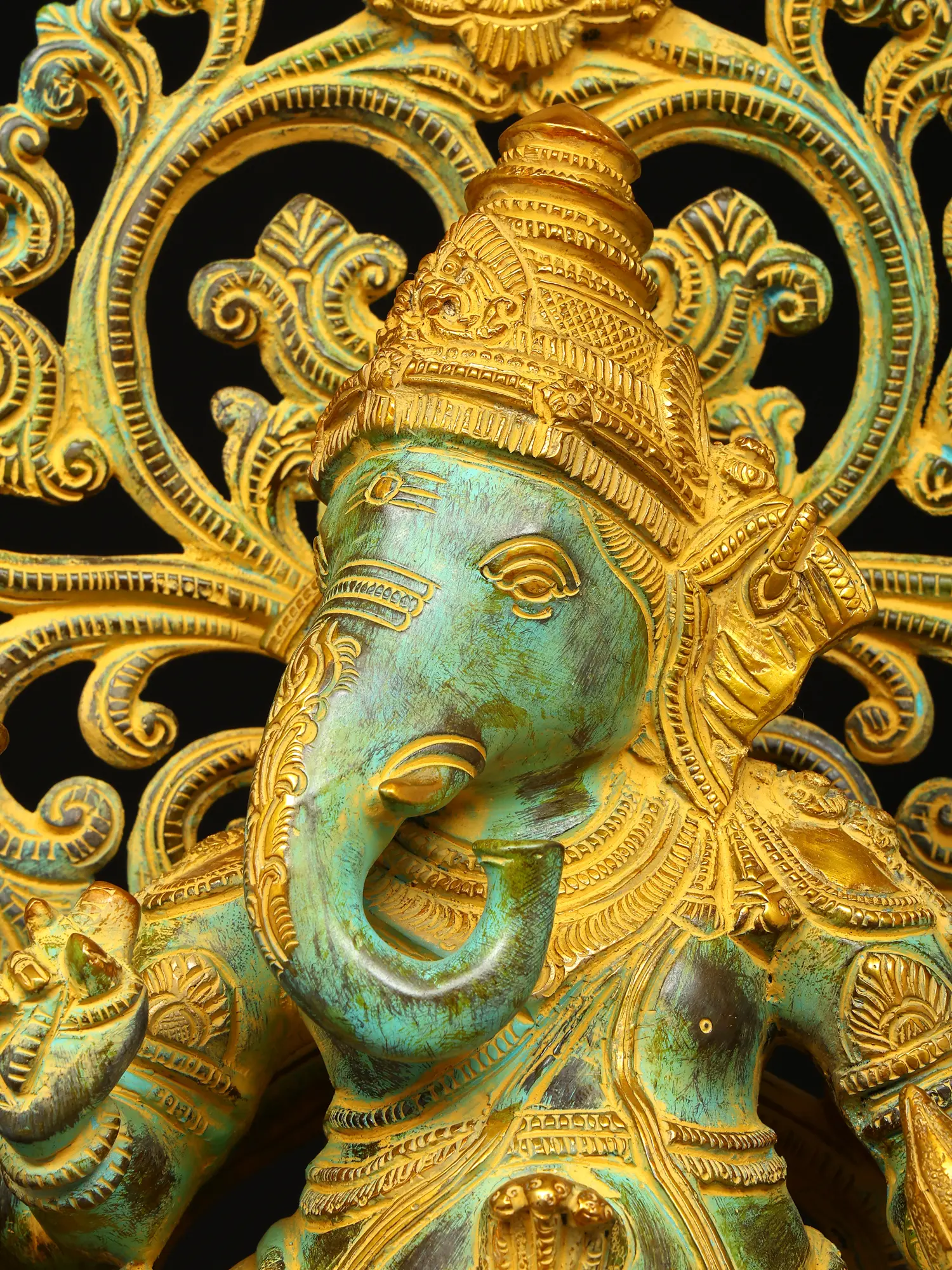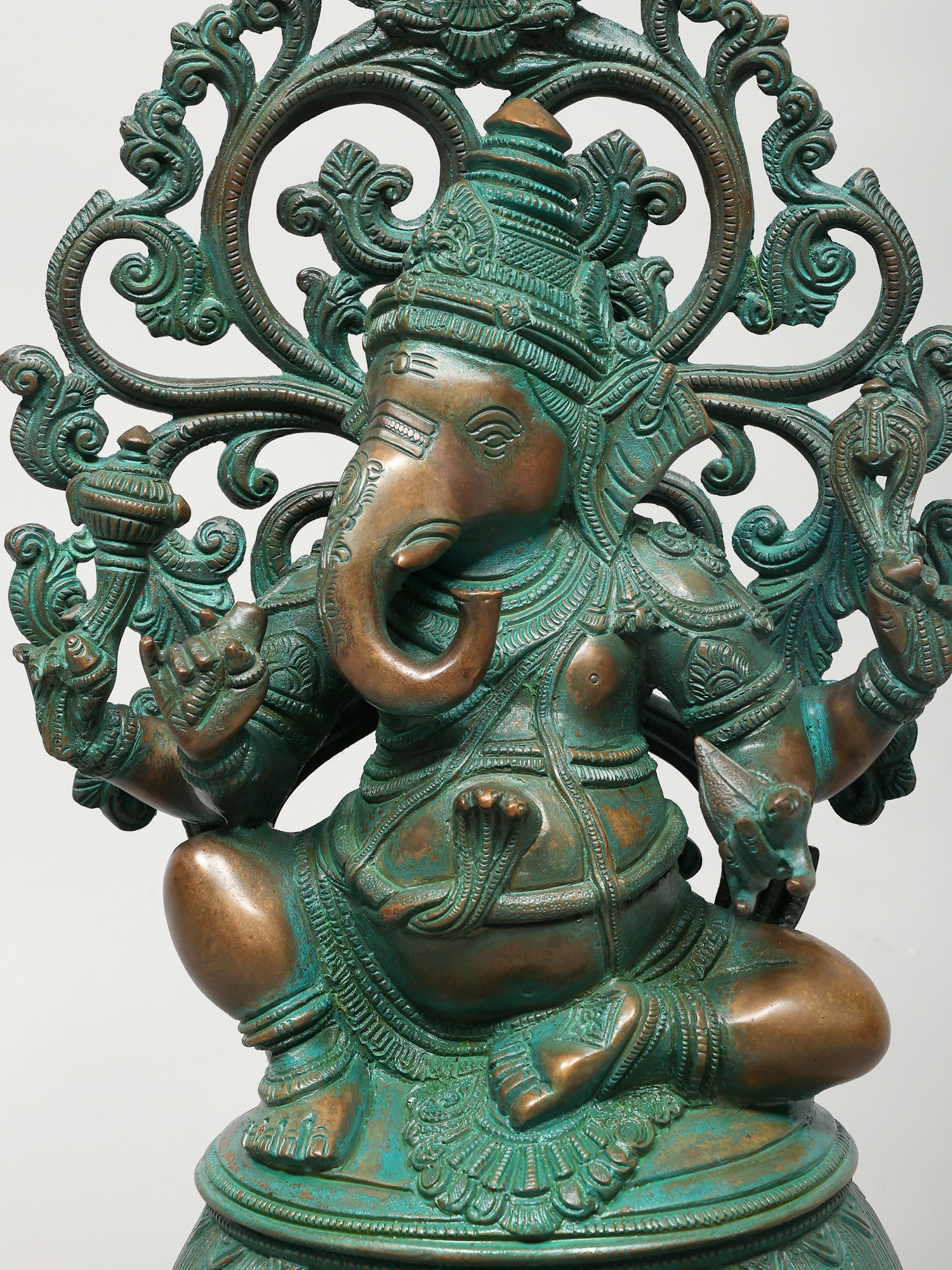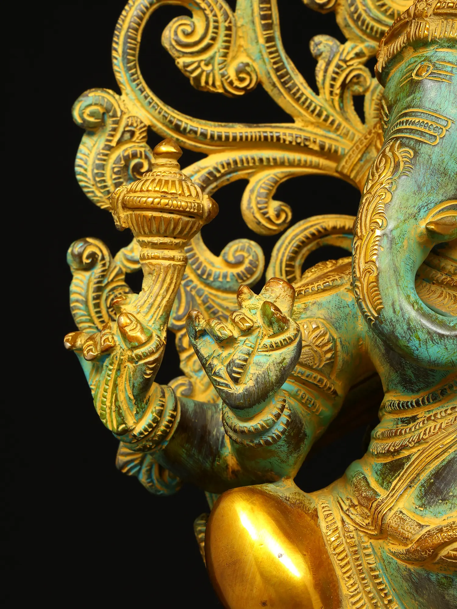The plinth on which this Ganesha sculpture is placed is exceptional. It has a thick, ornamental sprig of vine down the frontal midline. Lotus petal engravings along the edges. Finally an upturned lotus bloom with elongated petals, which directly cradles the seated divinity.