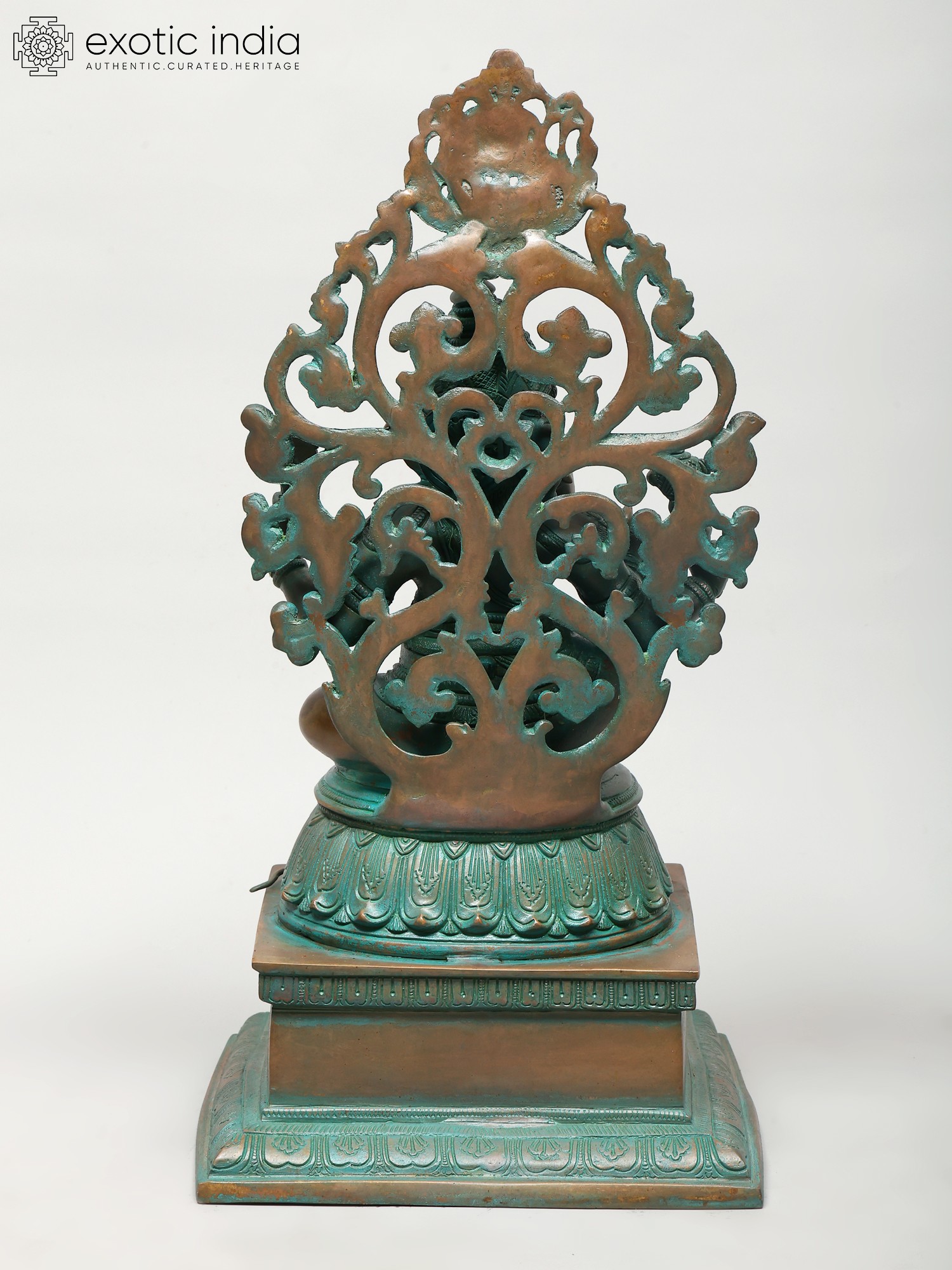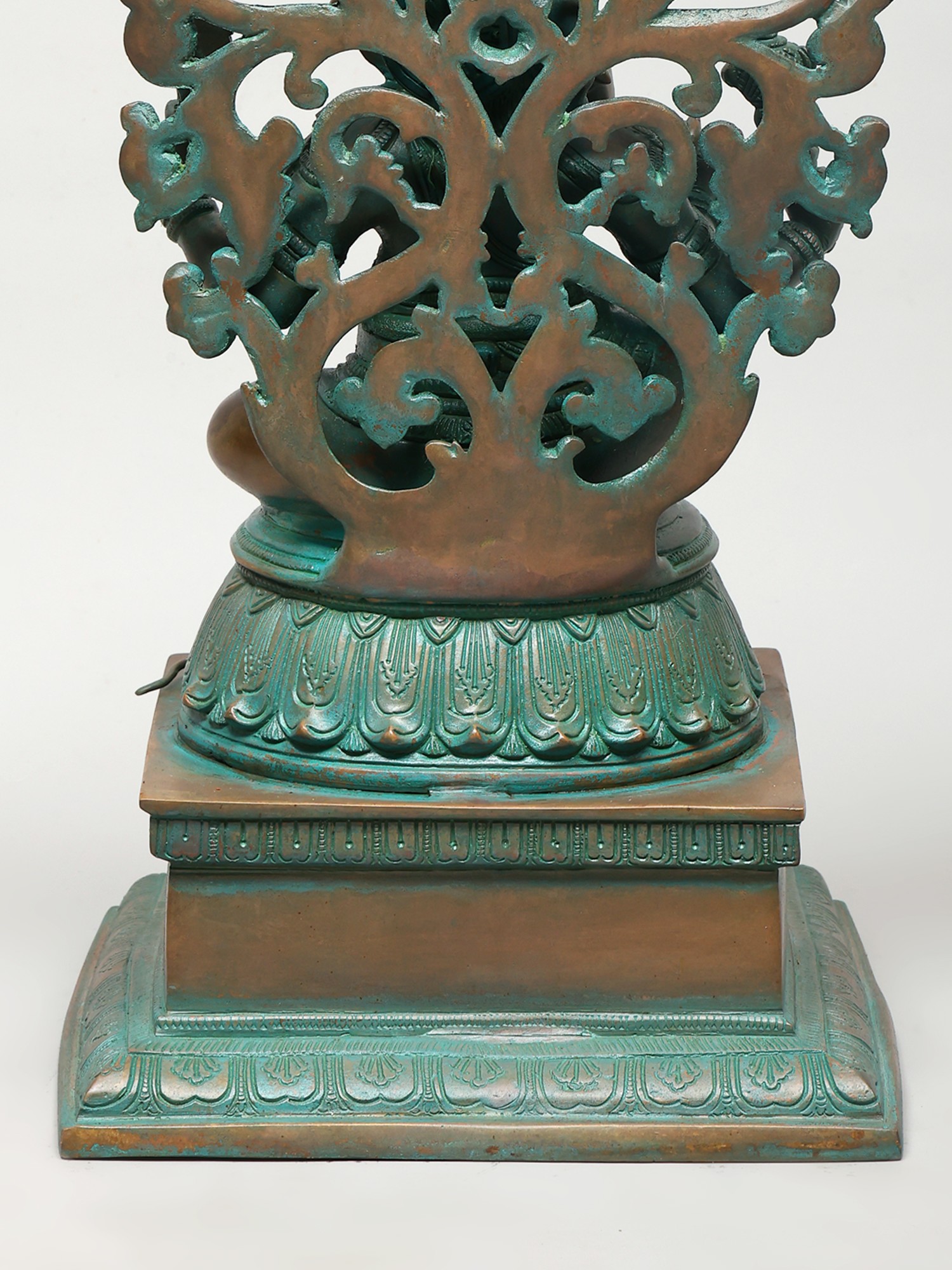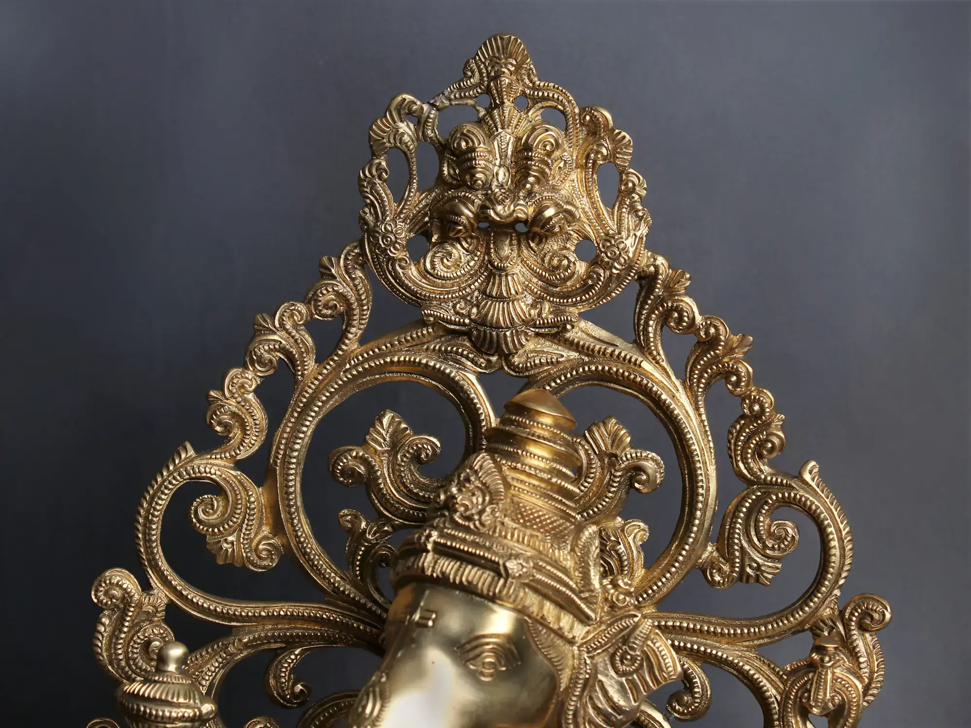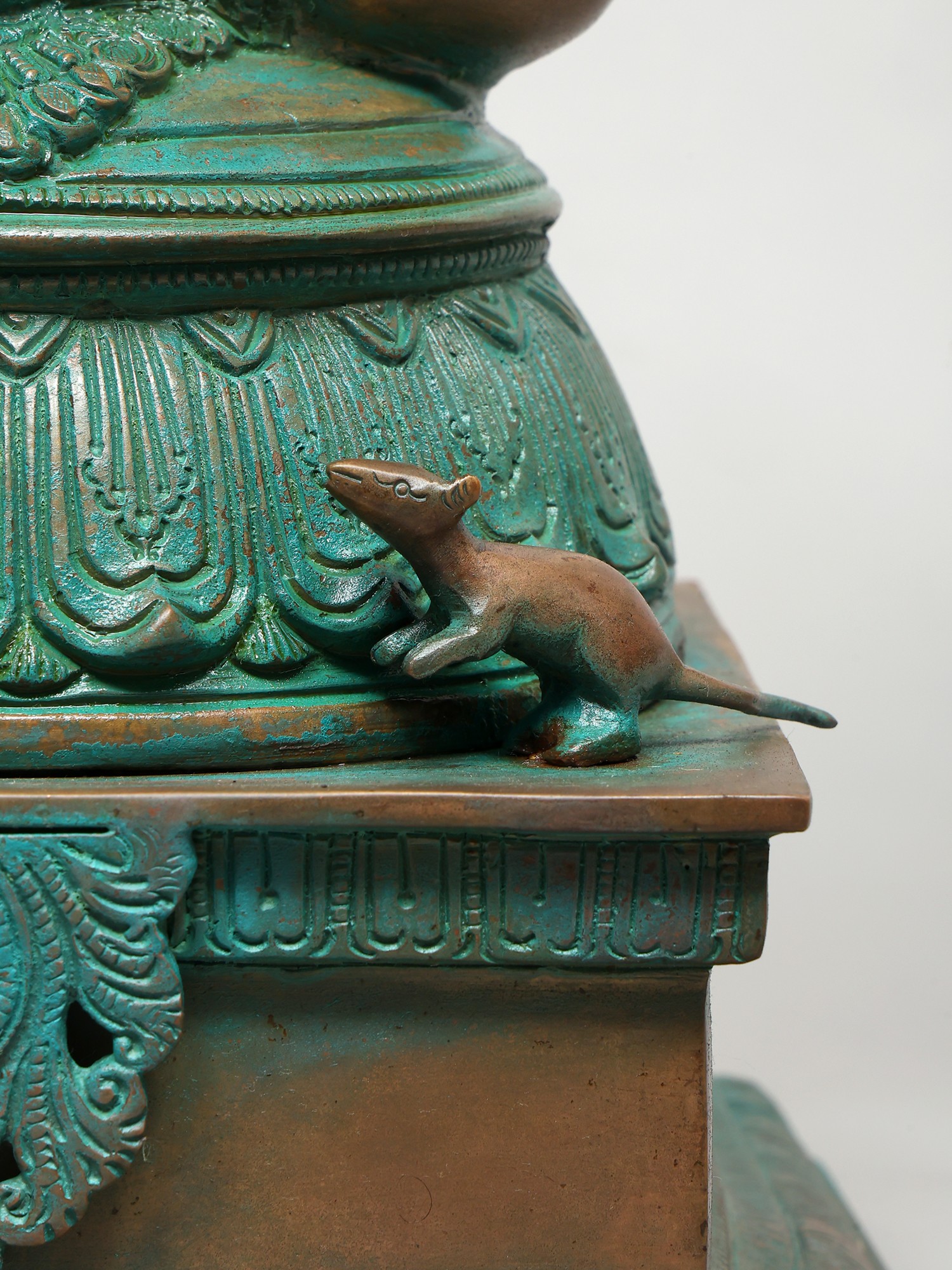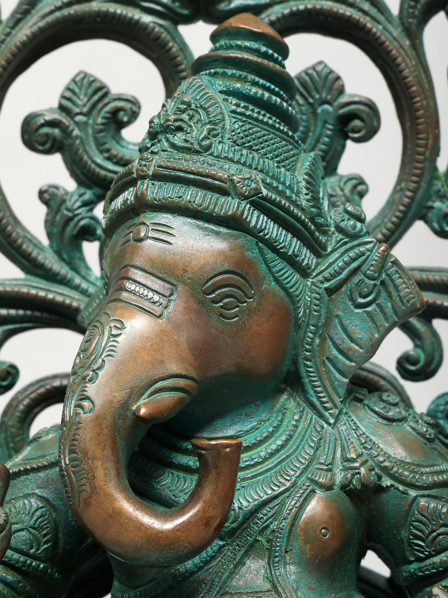 The plinth on which this Ganesha sculpture is placed is exceptional. It has a thick, ornamental sprig of vine down the frontal midline. Lotus petal engravings along the edges. Finally an upturned lotus bloom with elongated petals, which directly cradles the seated divinity.