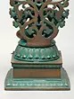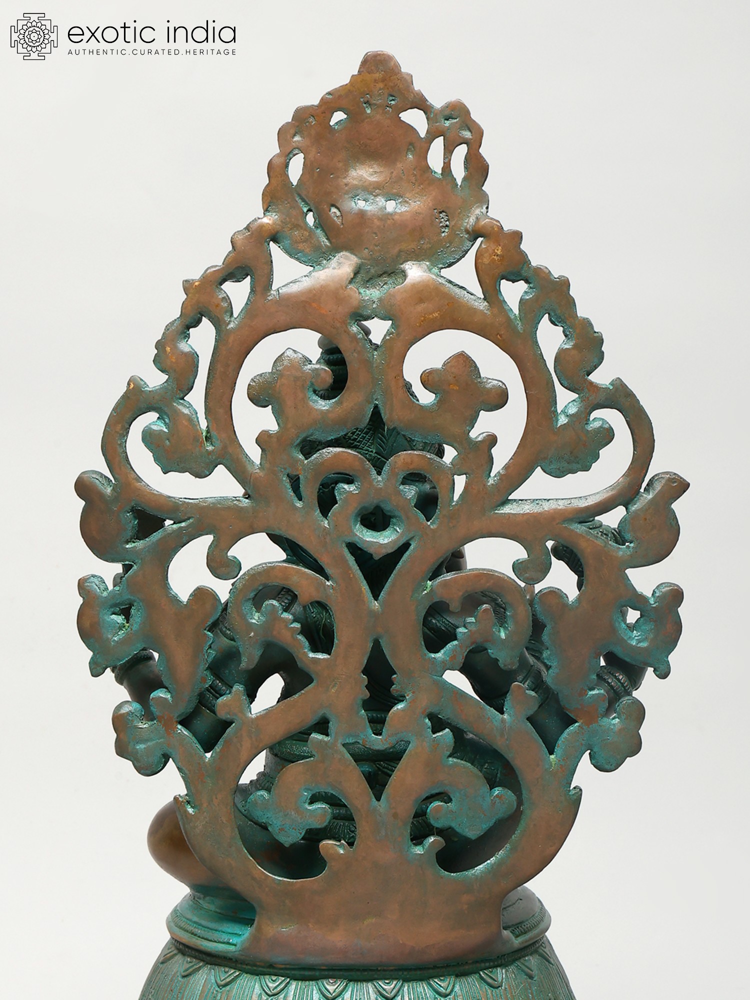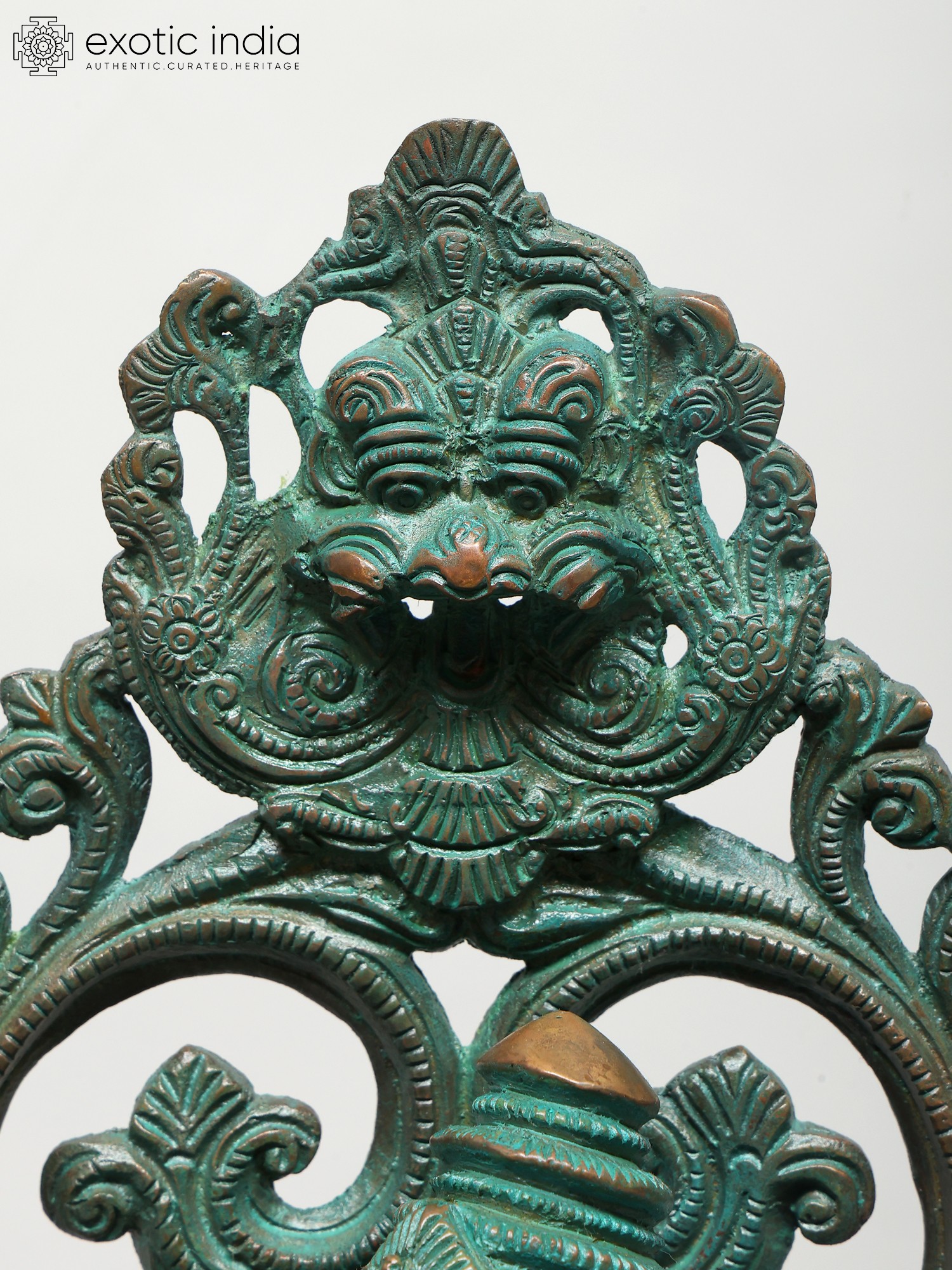 It is a glistening, smoothly sculpted composition. The iconography is typical - four arms, chubby child’s form constrained by the body of a snake - yet there is a hint of wrath on the brow of the side-turned face. Framing the subtly wrathful upper body is a network of vine. It is perfectly symmetrical and features the decidedly wrathful Kirtimukham at the zenith.