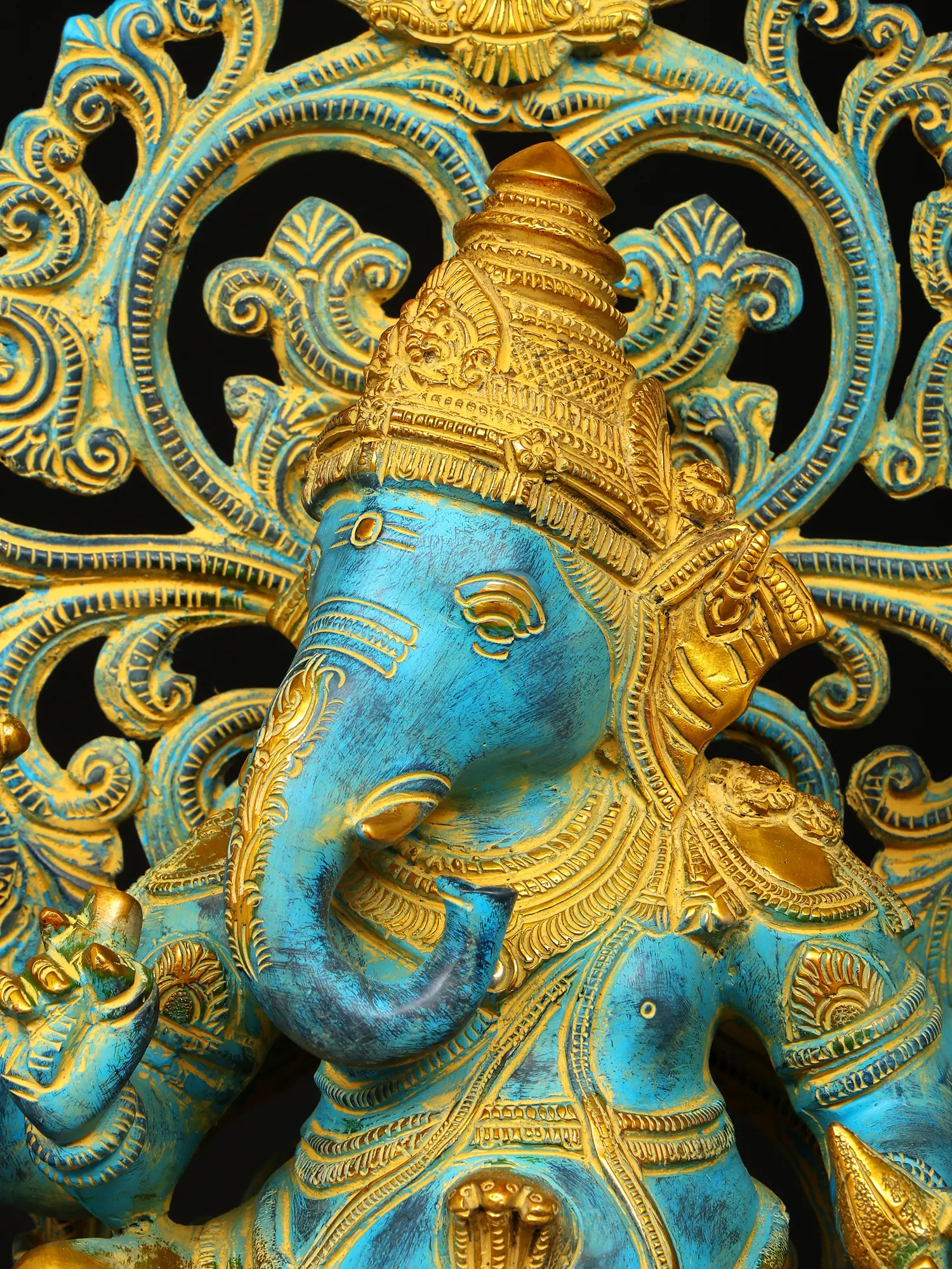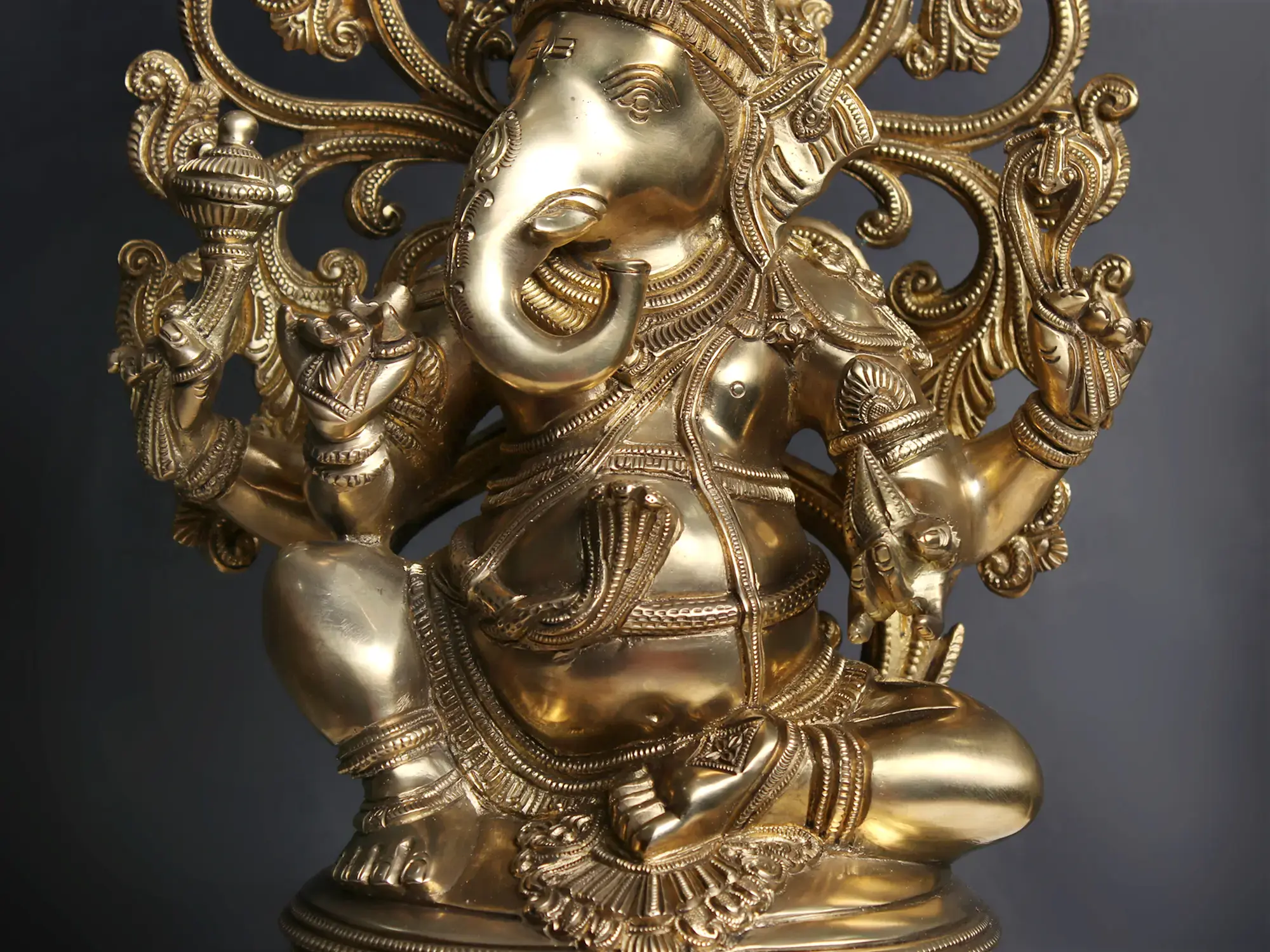 The plinth on which this Ganesha sculpture is placed is exceptional. It has a thick, ornamental sprig of vine down the frontal midline. Lotus petal engravings along the edges. Finally an upturned lotus bloom with elongated petals, which directly cradles the seated divinity.