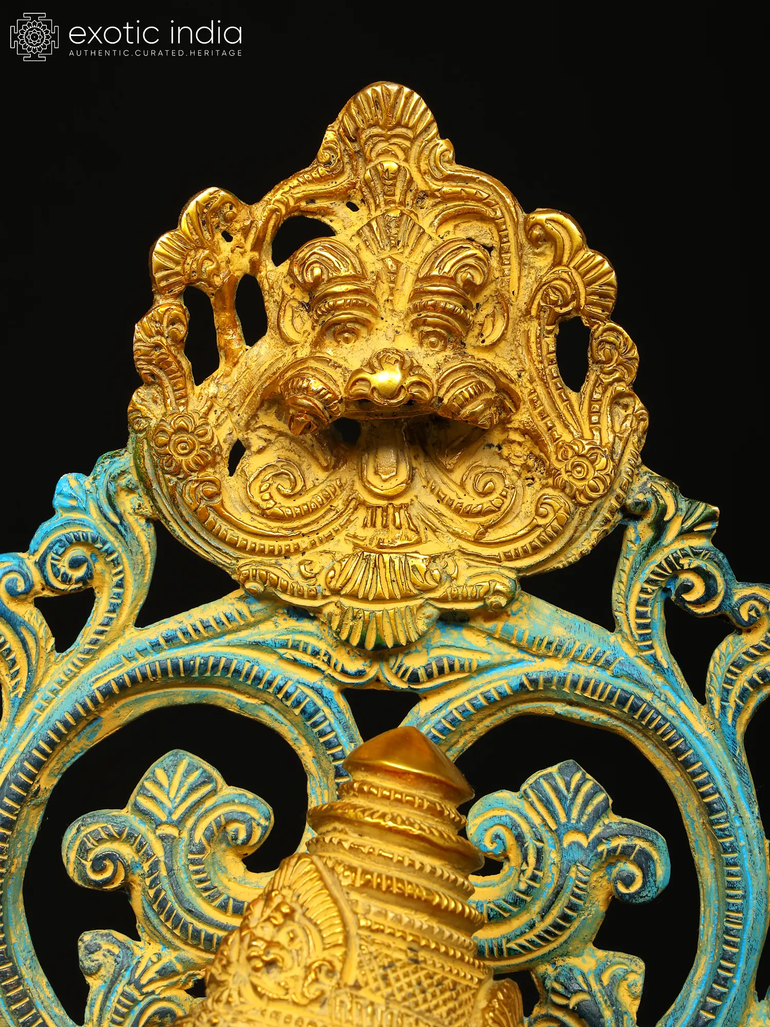 It is a glistening, smoothly sculpted composition. The iconography is typical - four arms, chubby child’s form constrained by the body of a snake - yet there is a hint of wrath on the brow of the side-turned face. Framing the subtly wrathful upper body is a network of vine. It is perfectly symmetrical and features the decidedly wrathful Kirtimukham at the zenith.