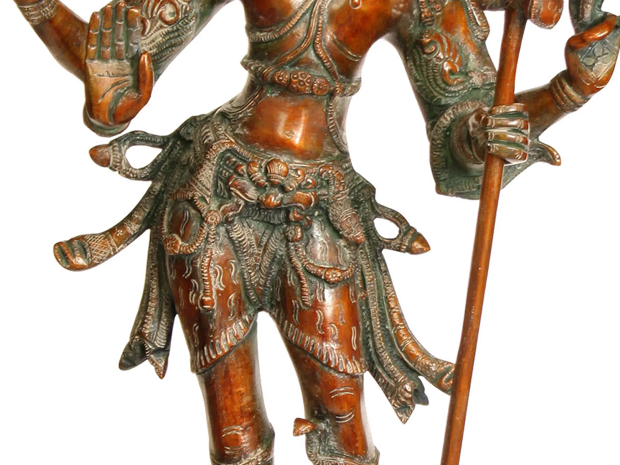 This statue is a testament to the skill and devotion of its artisans. Cast in brass, every line, curve, and detail has been meticulously rendered. The statue is an enduring testament to the rich artistic traditions associated with depictions of Lord Shiva. Notice the posture of the deity. With four arms, each holds symbolic items. One hand offers a blessing (Abhaya Mudra). Another holds a trident or 'Trishul', symbolizing his control over the three fundamental aspects of existence: creation, preservation, and destruction. A small deer is also held, symbolizing his connection to the animal kingdom and the forest, and a war hammer signifying protection and power. He stands upon a lotus pedestal, a symbol of purity and spiritual awakening. A halo surrounds his head symbolizing the light of knowledge that dispels ignorance. The clothing is also intricately detailed, and reflects Shiva's dual nature, at once an ascetic renunciate and the Lord of the Universe. This representation of Pashupatinath serves not just as a decorative piece, but as a profound reminder of the divine presence in all living things and the interconnectedness of the universe. It is an ideal addition to any home or sacred space, fostering an atmosphere of peace, protection, and spiritual awareness.