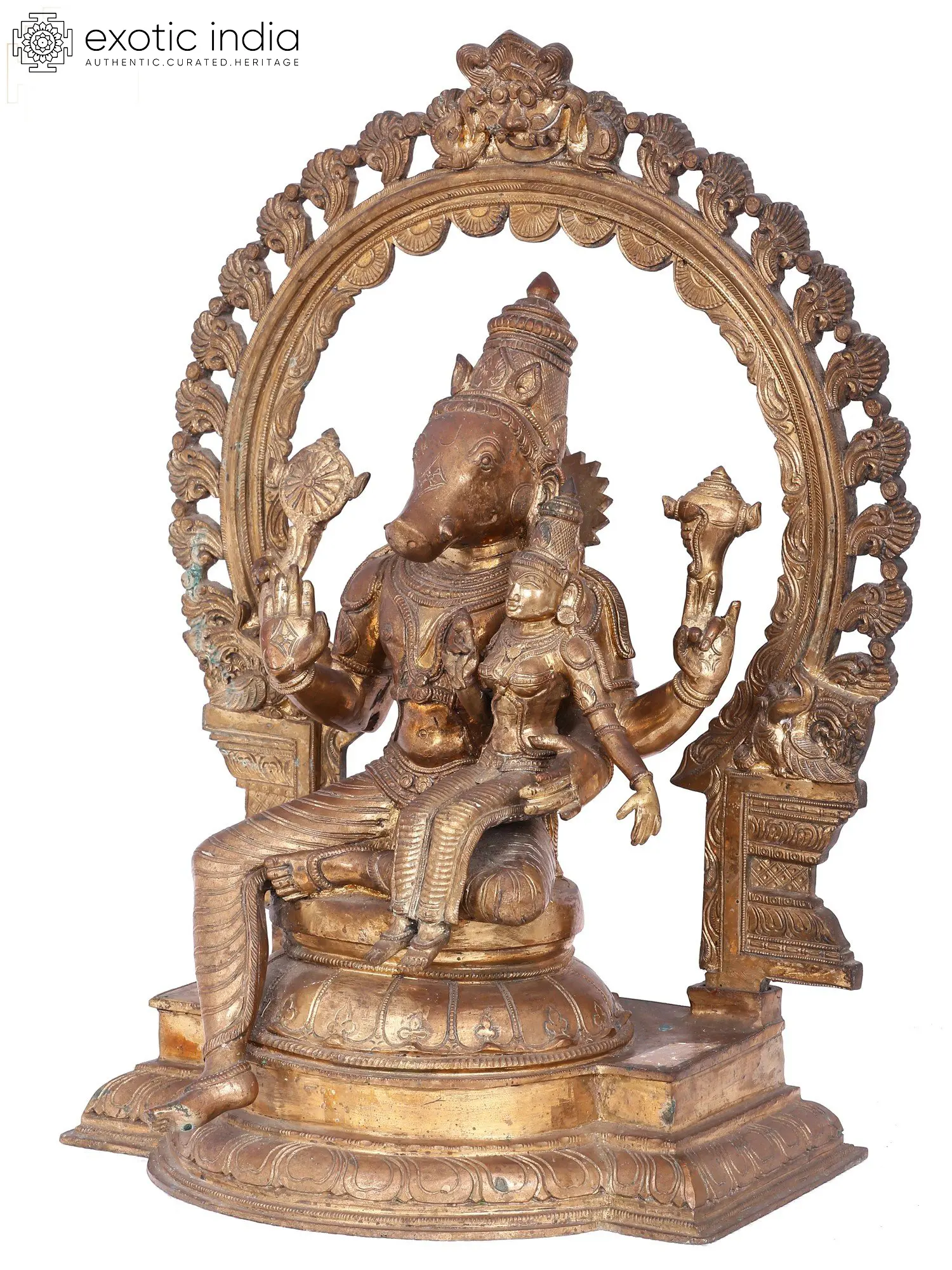 Varaha, the boar shown in this sculpture is considered to be the third avatar of Lord Vishnu. In this incarnation, Lord Vishnu destroyed the demon Hiranyaksha who was pushing the earth into the water and thus saved the earth from getting submerged in the river. In this sculpture, Lord Vraha is depicted with Lakshmi who is Vishnu’s wife and the goddess of wealth, seated on Varaha’s lap. Varaha is carrying two objects that Vishnu often carries i.e., a conch and a discus. Swamimalai Kumbakonam Bronze is considered to be authentic bronze which is used to create idols out of the five metals known as Panchaloha. For home temple prayers, Panchaloha is the recommended material for spiritual or religious idols.