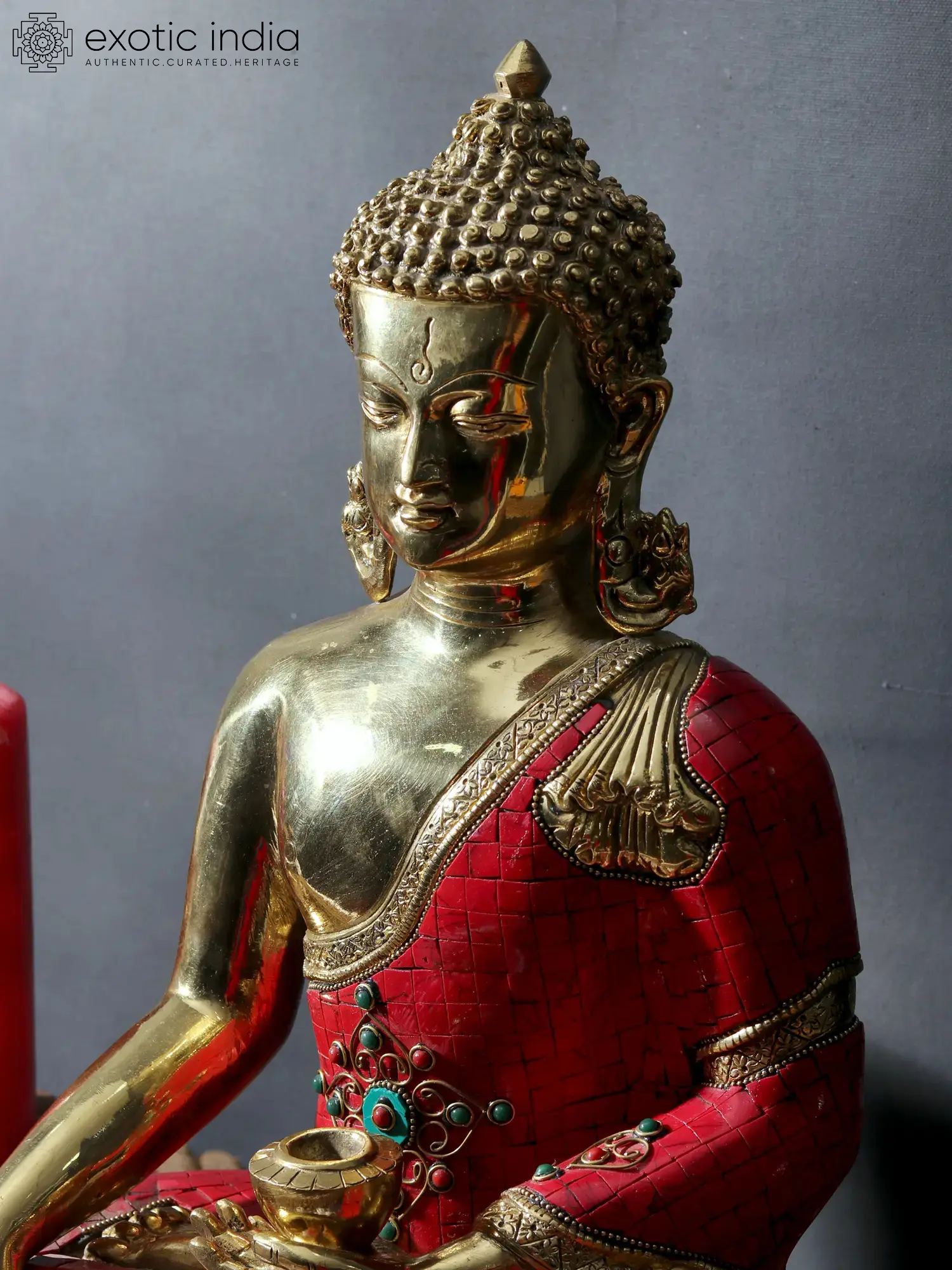 The Buddha is seated upon a double lotus pedestal, a powerful symbol in Buddhist iconography. The lotus, with its roots in the mud but its bloom reaching towards the sky, represents purity, enlightenment, and the transcendence of suffering. It signifies that even from the depths of worldly challenges, one can achieve spiritual awakening. The use of brass, a metal associated with longevity and prosperity, further enhances the statue's auspicious qualities. The intricate inlay work, featuring vibrant red and striking turquoise accents, adds a visual richness that speaks to the opulence and devotional artistry of traditional Indian craftsmanship. ––––––––––