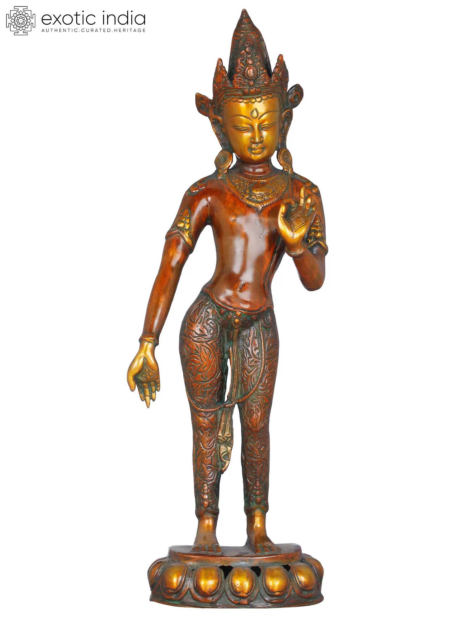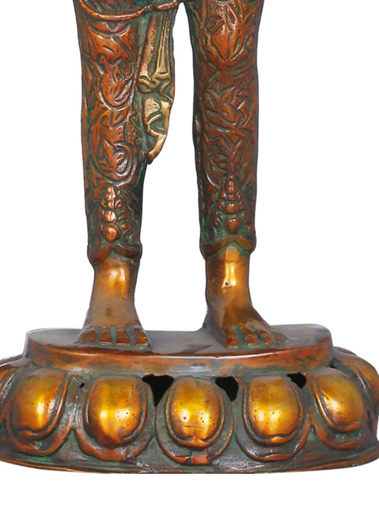 This magnificent brass statue portrays Avalokiteshvara, the Bodhisattva of Compassion, in a graceful and serene stance. Revered across Mahayana Buddhism, Avalokiteshvara is the embodiment of mercy and wisdom, a divine being who has vowed to postpone their own entry into Nirvana until all sentient beings are liberated from suffering. The figure stands tall, exuding an aura of peaceful contemplation and boundless empathy. The craftsmanship of this piece is evident in every detail. The brass medium lends a warm, lustrous glow to the deity, enhancing the fluidity of the sculpted form. Avalokiteshvara's attire is richly ornamented, with intricate patterns adorning the lower garments, suggesting royal or divine status. The Bodhisattva’s jewelry, including armbands and earrings, is finely wrought, adding to the overall sense of opulence and sacredness. The serene expression on the face, with downcast eyes and a gentle smile, invites introspection and a sense of calm. The deity's posture, with one hand raised in a gesture of blessing or reassurance and the other extended downward, symbolizes the dual action of offering solace and reaching out to those in need. The elaborate headdress further accentuates the divine nature of the figure, adorned with symbolic elements that speak to the rich iconography of Buddhist art.