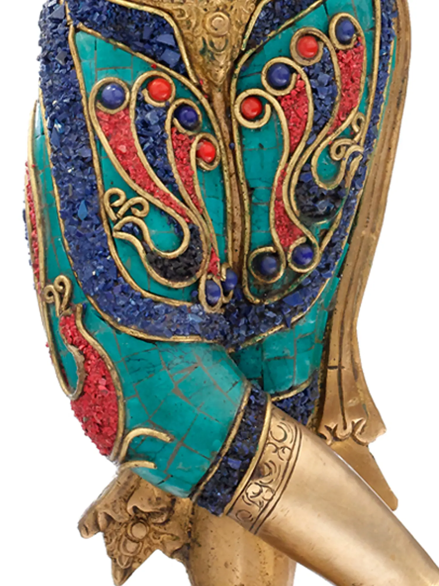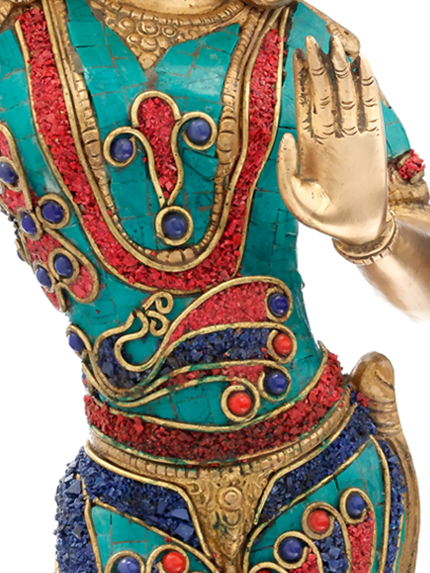 The artistry of this sculpture is evident in every detail. The brass, imbued with a warm golden sheen, serves as the perfect medium to convey divinity and purity. What truly elevates this piece is the intricate inlay work that adorns Maya Devi's attire. Vibrant turquoise, deep lapis lazuli, and rich coral chips are meticulously set into the brass, forming captivating patterns that highlight the flowing robes and ornate jewelry. These precious stones are not merely decorative; they hold deep symbolic significance in Buddhist traditions. Turquoise is often associated with the sky and the divine, lapis lazuli with wisdom and enlightenment, and coral with vitality and protection. Together, they create a visual symphony that celebrates the sacred lineage of the Buddha. The craftsmanship involved in such precise inlay work speaks to the dedication and skill of the artisans.