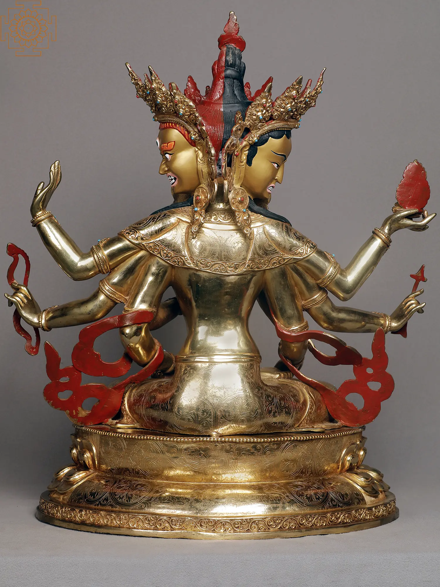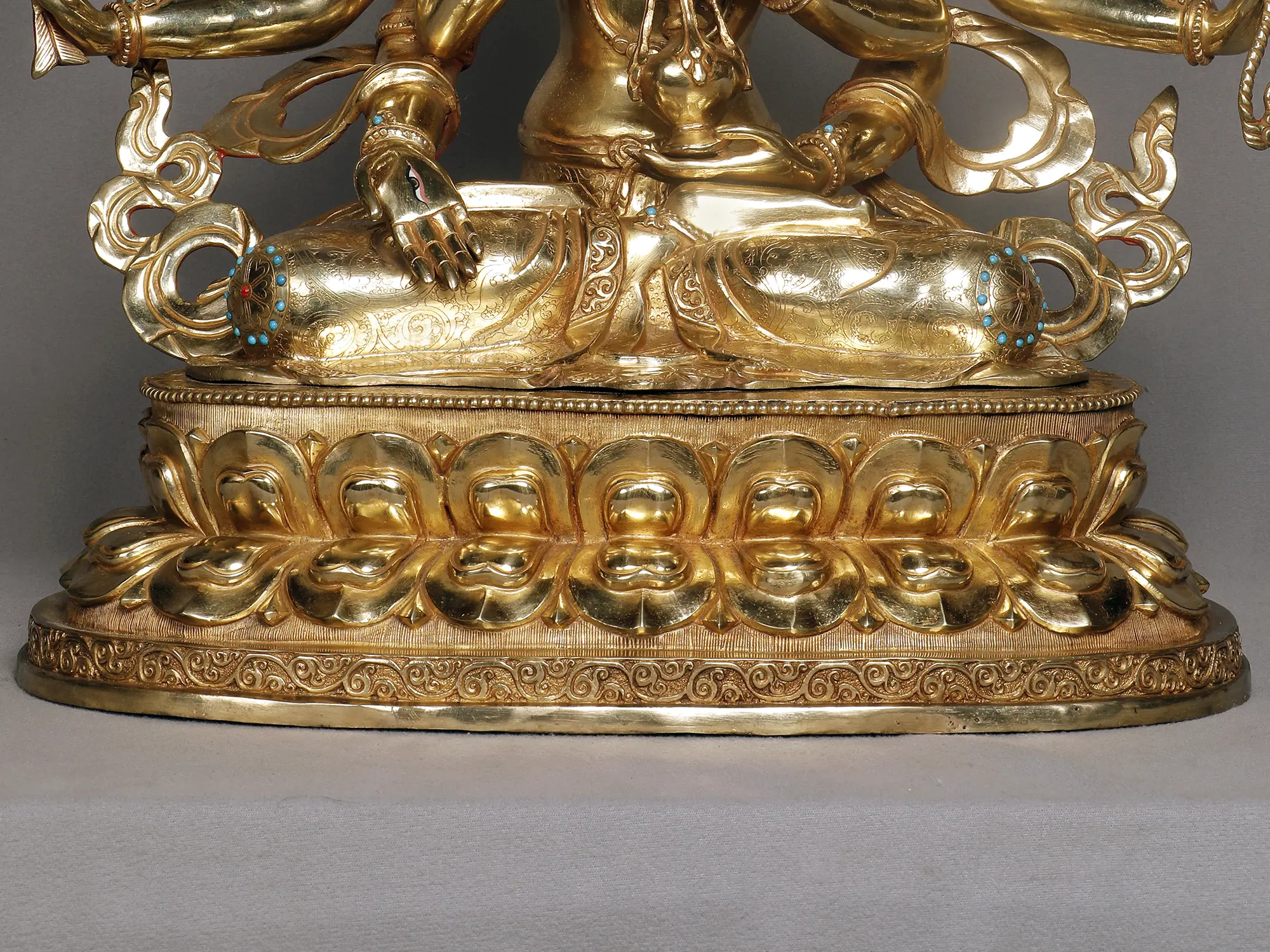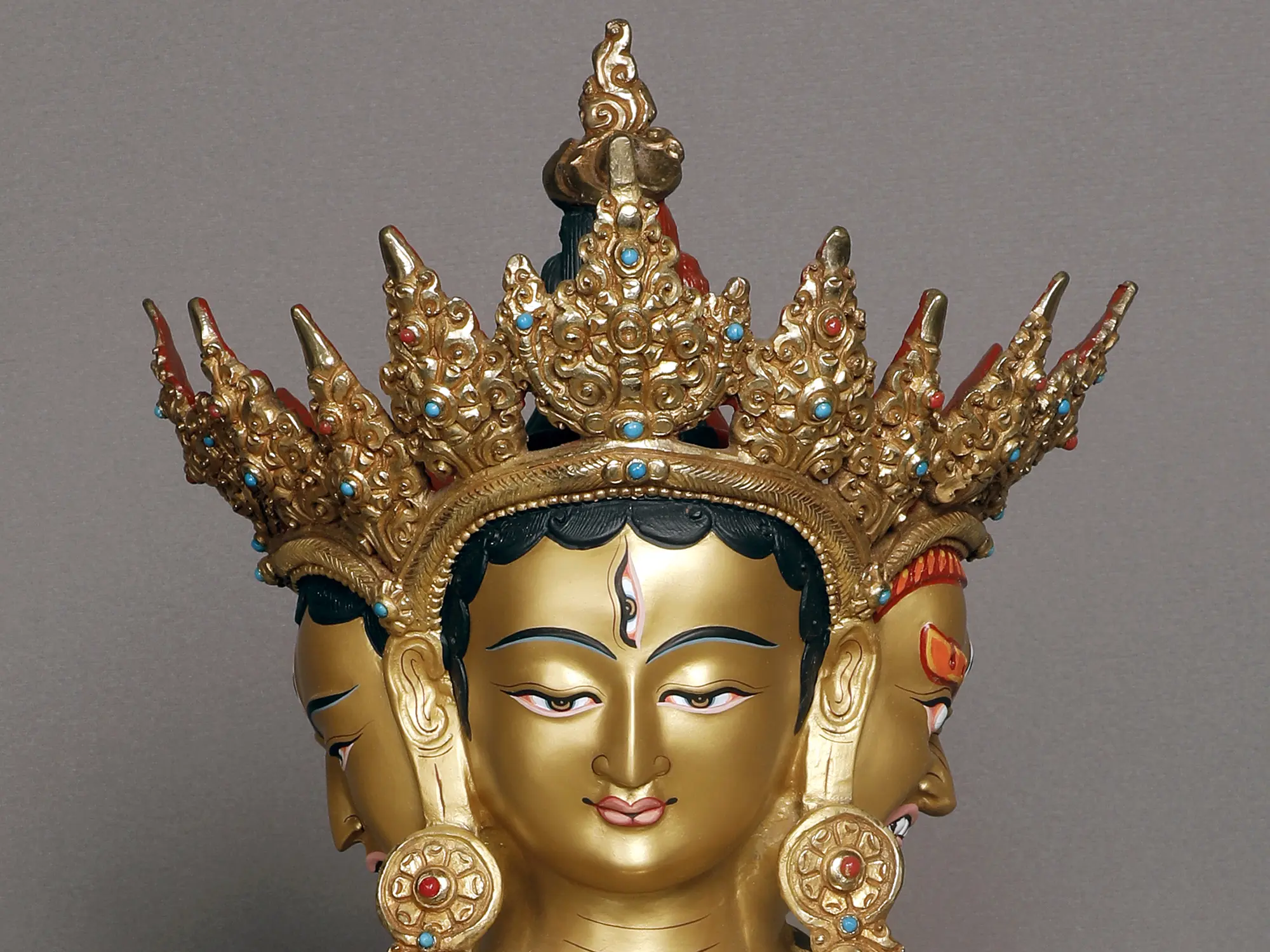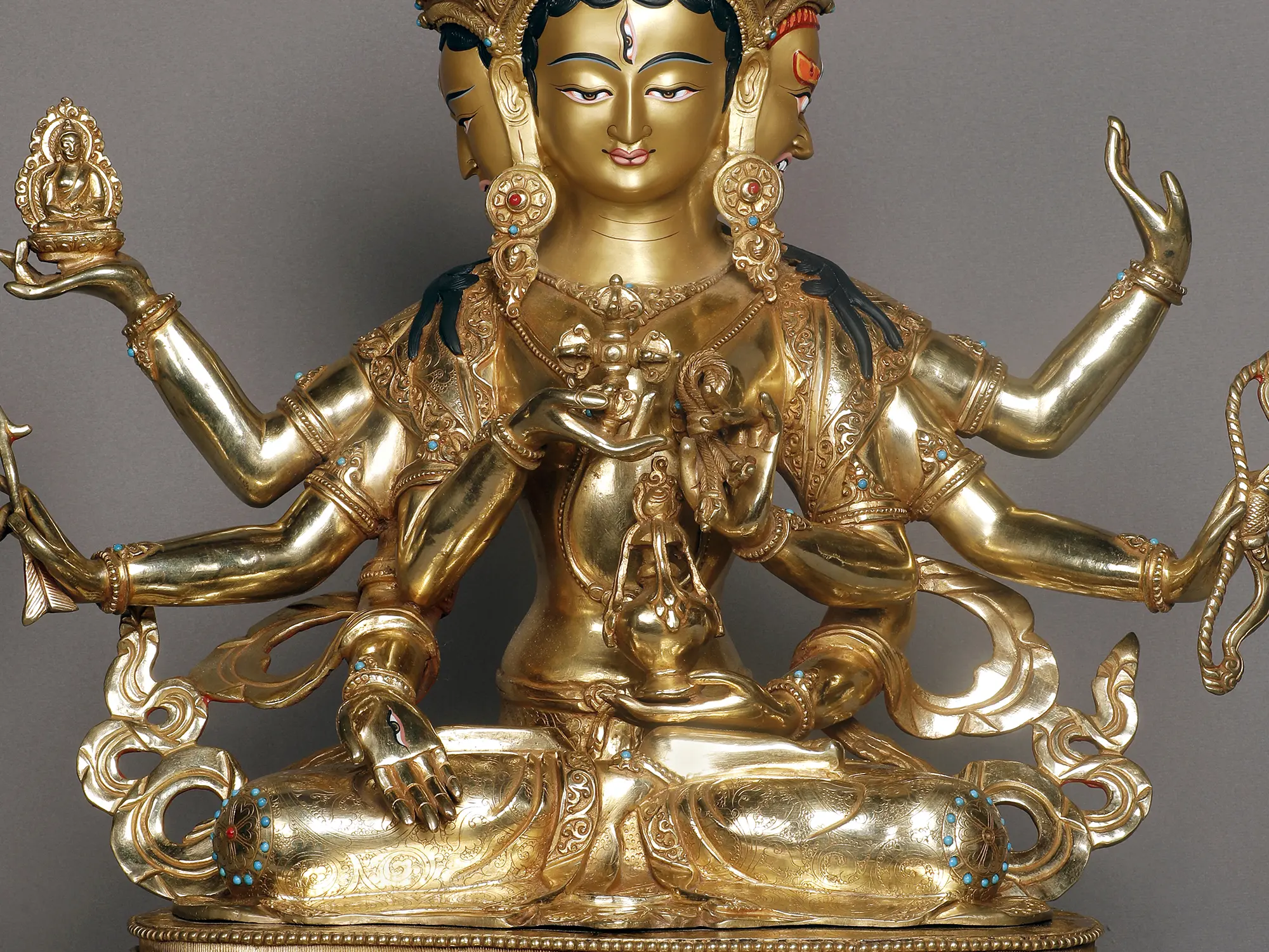 Eight-armed, three-faced, and emanating a mesmerizing divinity Namagyalme in this Nepalese statue is an inimitable Buddhist deity who has the power to remove hurdles in all three plains of existence. The gilded copper statue here shows poise and harmony among all the elements, which classifies it as a rare aesthetic masterpiece. Her three faces represent her ability to regulate three kinds of obstacles while her attributes which are connected to several potent Buddhist divinities and Bodhisattvas underline her status as a supreme revered one.