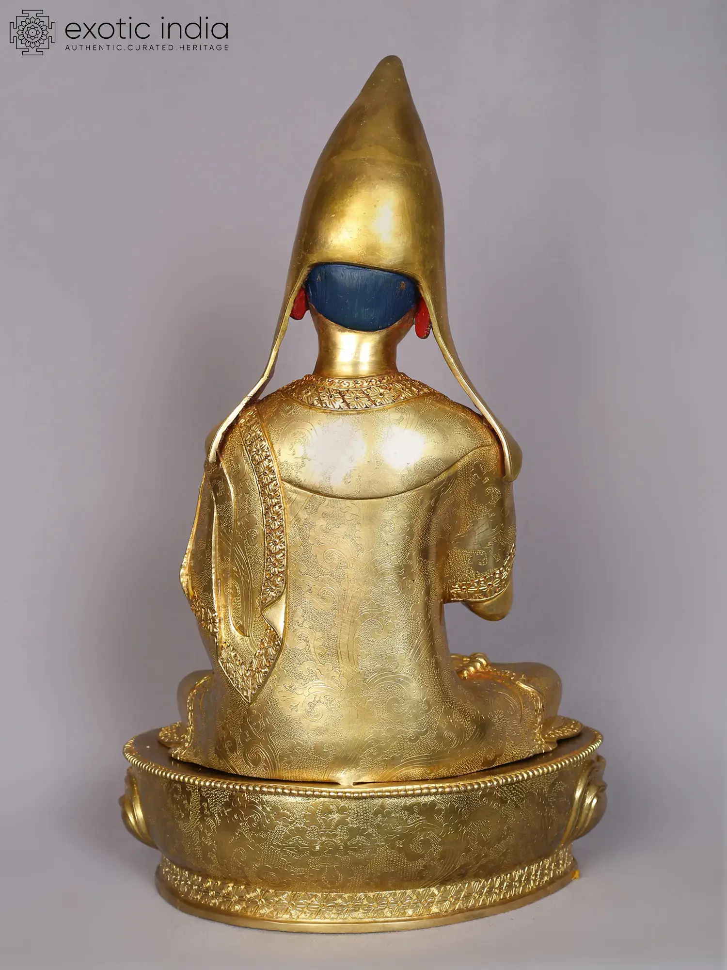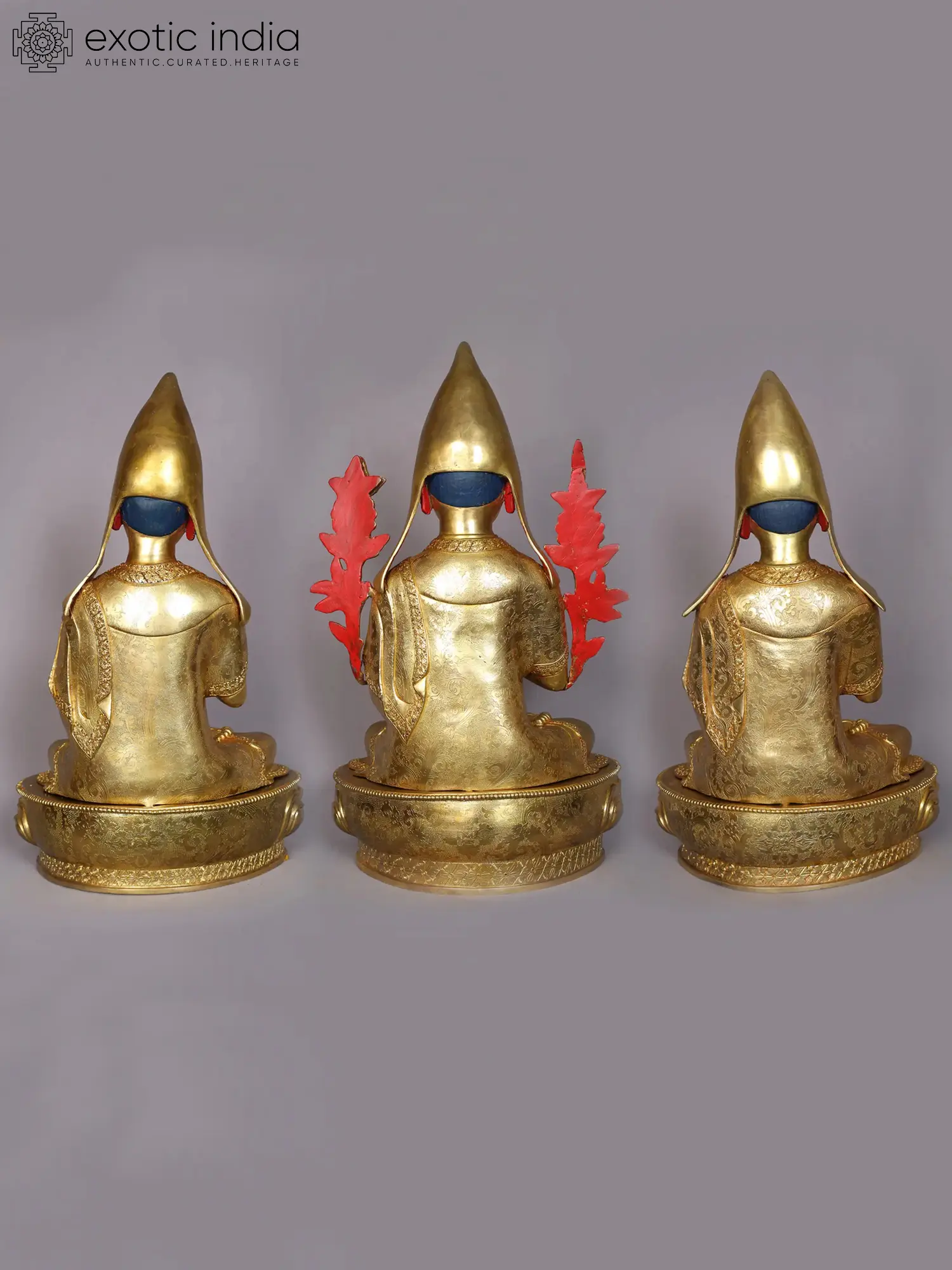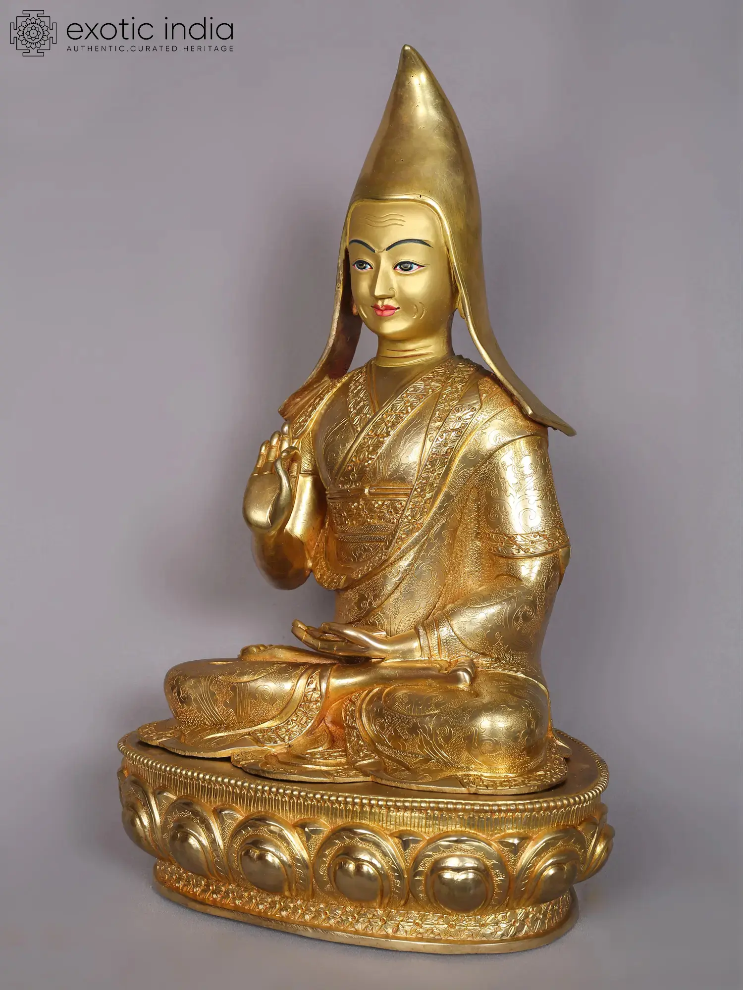 Tsongkhapa in Buddhist culture is the establisher of the Gelugpa sect, a prominent Vajrayana order to which belong the Dalai Lamas. The glistening golden cap of Tsongkhapa in these Nepalese gilded copper statues is symbolic of the order he founded, known as the Yellow Hats. The three statues from Nepal present the teacher in varied states of enlightened existence. One depicts him with the gesture of turning the wheel of Dhamma, while the other two, show him teaching the Dhamma, with the Vitarka Mudra and a book.