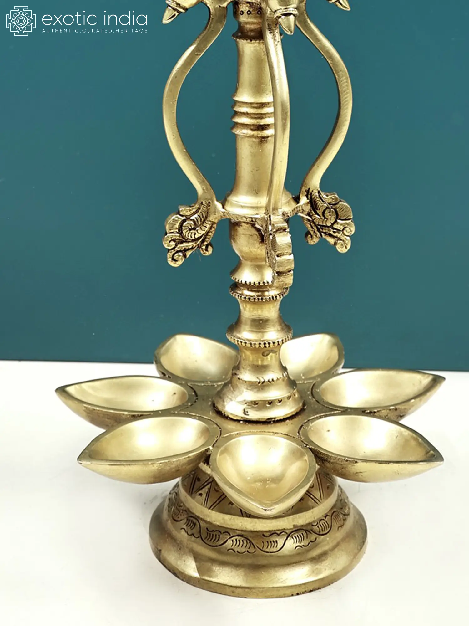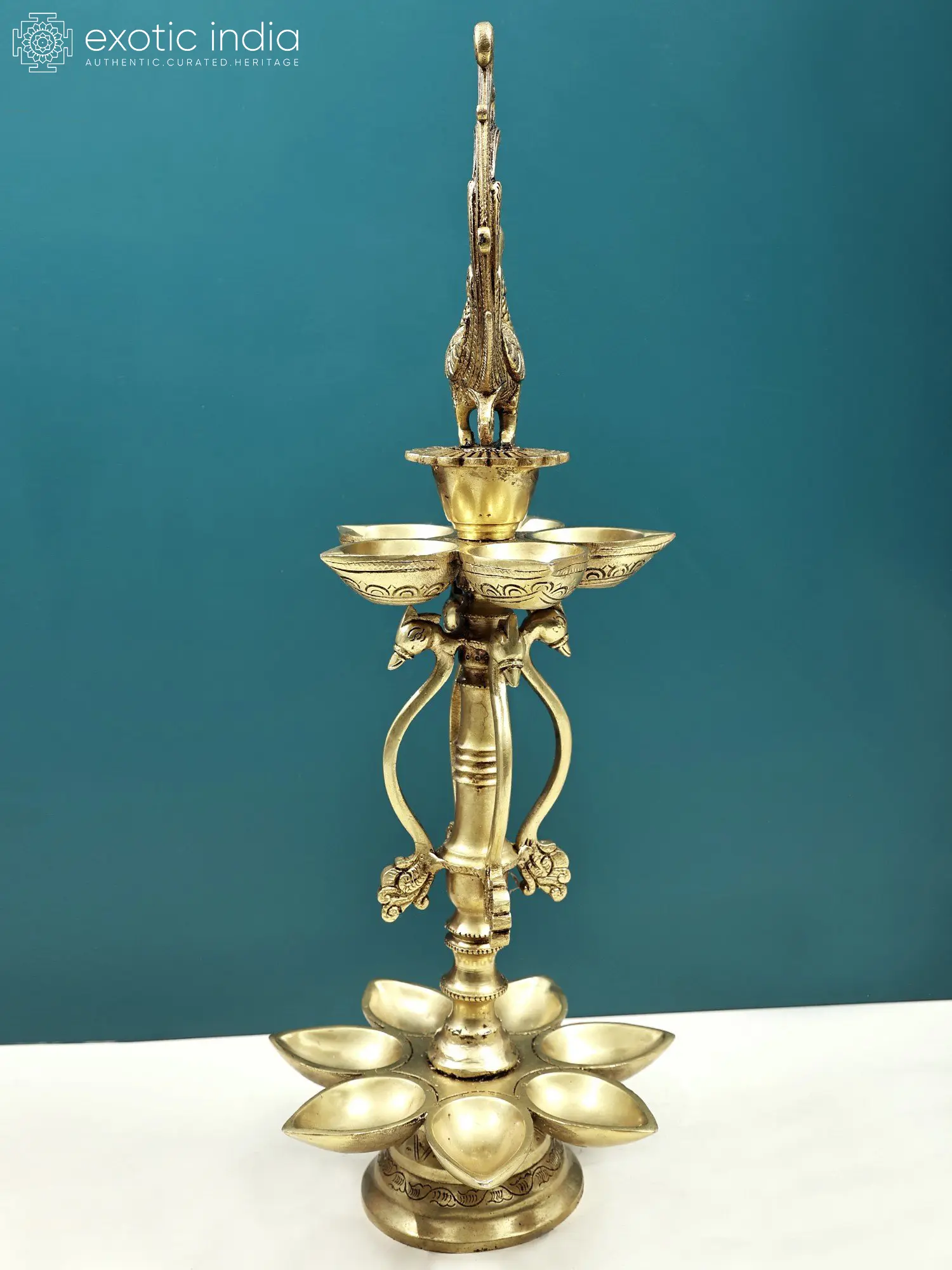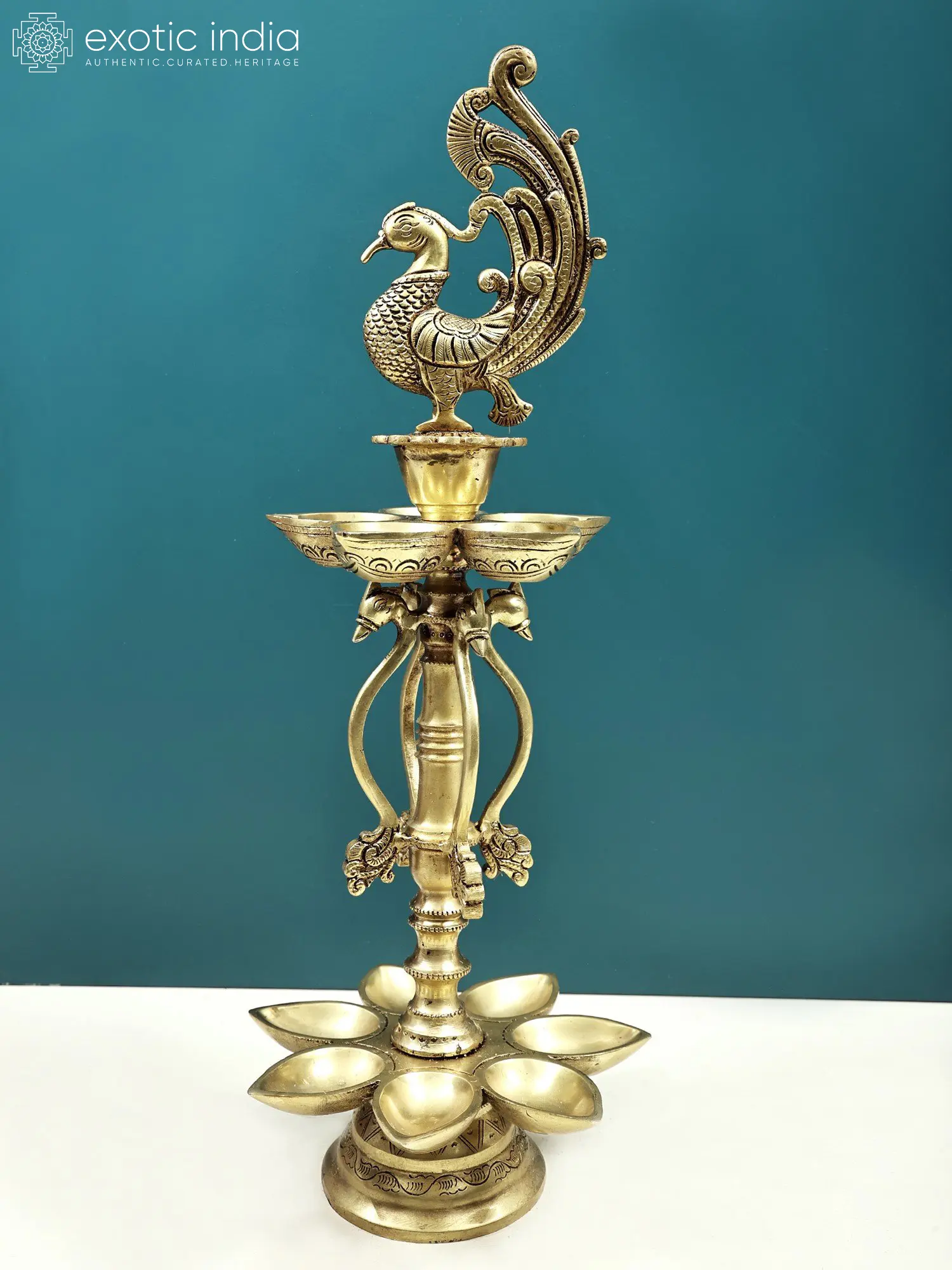 This beautifully crafted piece is a two-layered lamp projected as a symphony of artistry and myth. Atop the lamp, a mythical peacock is seated symbolizing grace and growth. Below, the first layer houses five lamps, each a constellation of light. The middle stem adorns itself with stylish parrots. As the story unfolds, seven more wicks grace the lower level, their glow harmonizing with the depths. The base, adorned in intricate designs, bears witness to this country's magnificent traditions of craftsmanship. A celestial narrative rendered in brass, this lamp beckons realms unseen, kindling wonder and casting an enchanting glow upon the heart's gaze.