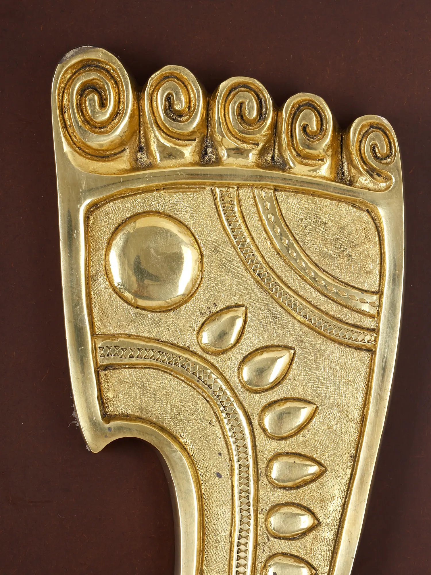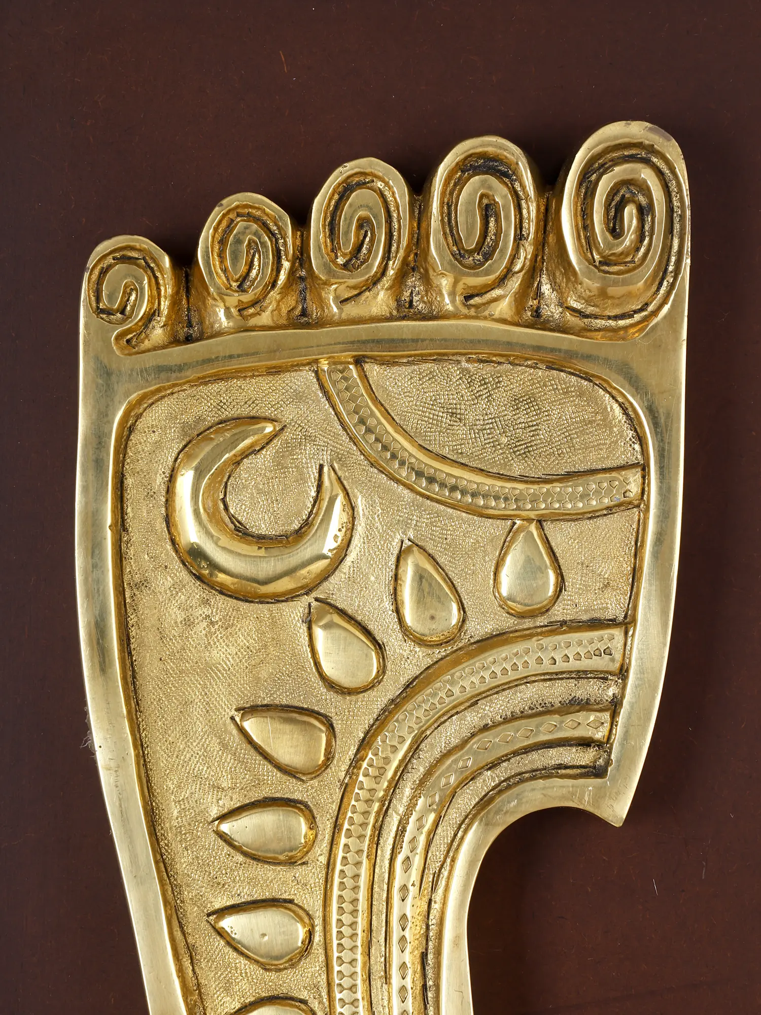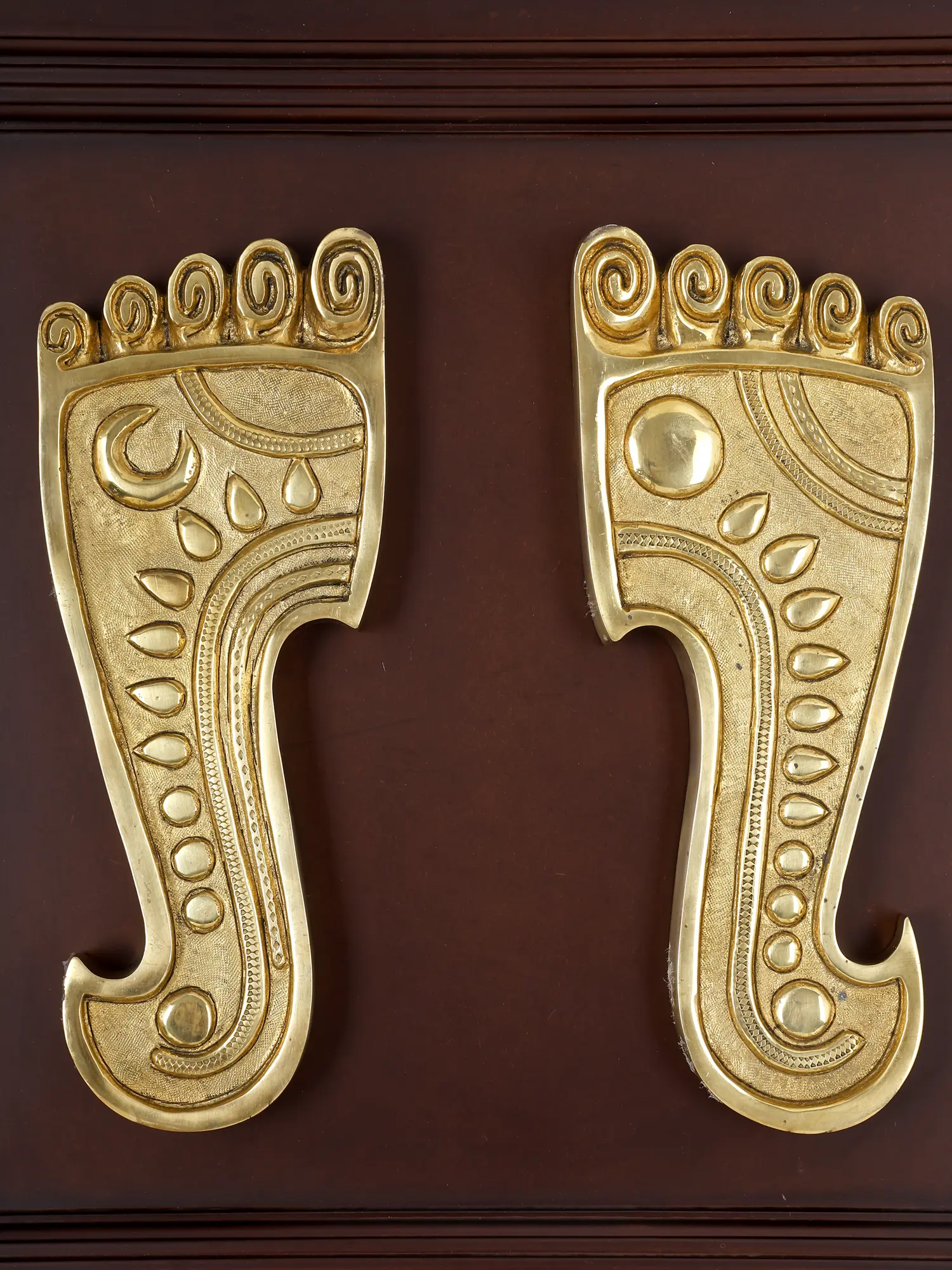 This wall hanging cradles the Charan-Paduka with Surya and Chandra (Sun and Moon) symbols. The footprints are stylistically made, with spirals (an auspicious attribute) marking the toes.