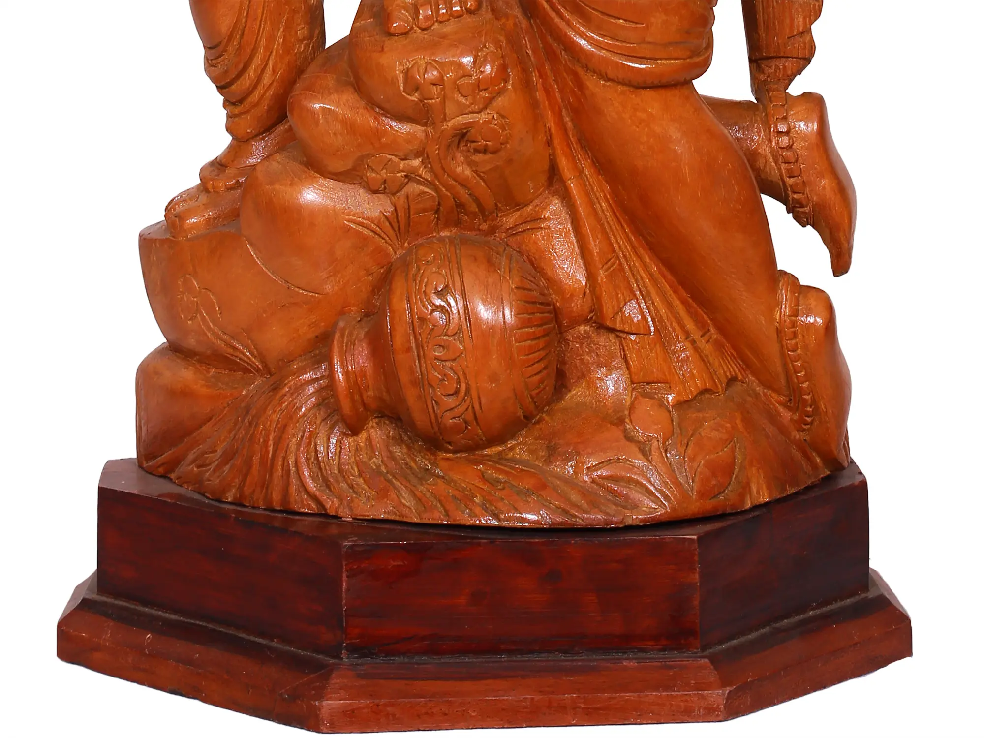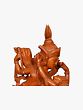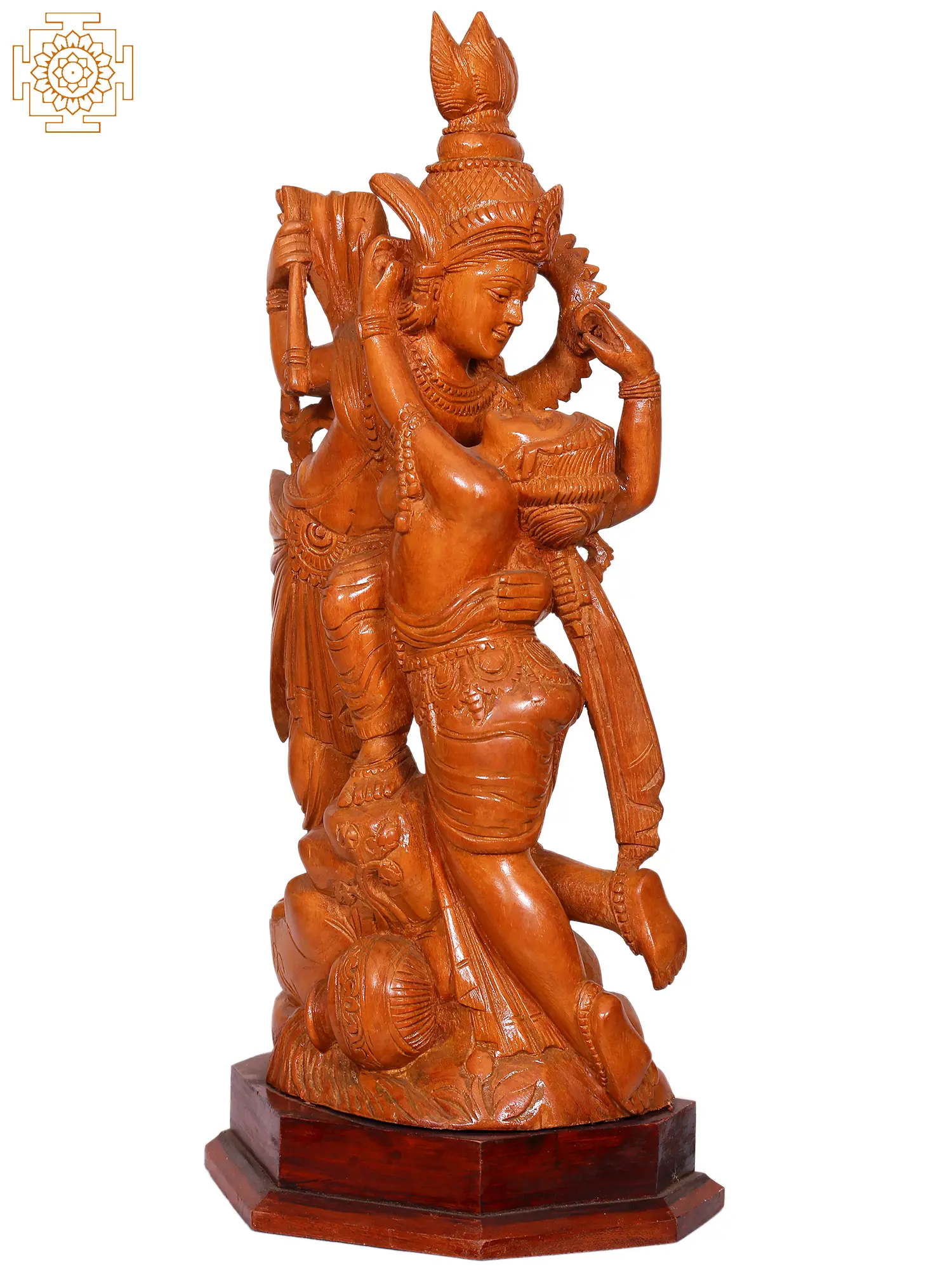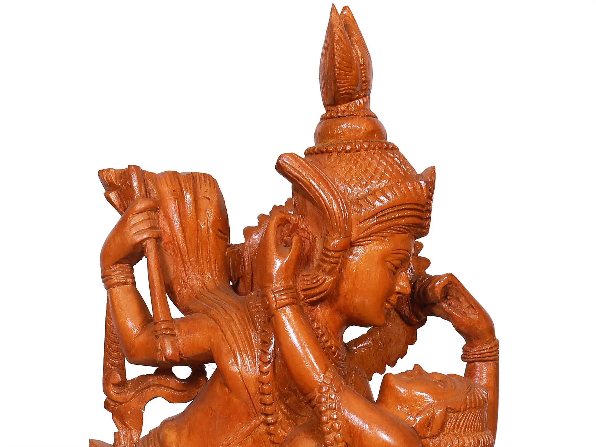 This magnificent carving is a celebration of wood as a medium. The warm, inviting tone of the teak wood is enhanced by the intricate details meticulously rendered by the artisan. From the delicate folds of their garments to the serene expressions on their faces and the traditional adornments, every element is sculpted with precision and care. The dynamic pose of the figures conveys a sense of movement and energy, inviting the viewer to become a participant in their eternal dance. The rich texture and natural beauty of the teak wood ensure that this sculpture is not only a religious artifact but also a stunning piece of decorative art, sure to be a focal point in any space.