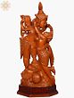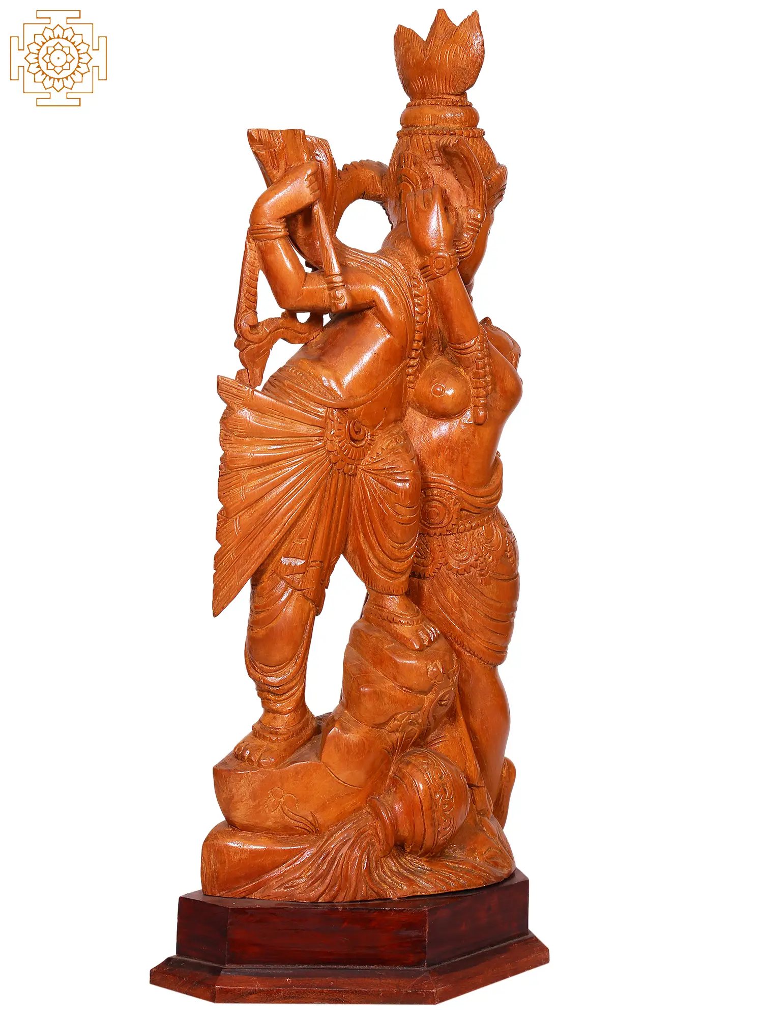 Immerse yourself in the timeless saga of divine love with this exquisitely carved wooden sculpture. Depicting Radha and Krishna in a moment of tender embrace and playful dance, this artwork captures the very essence of their eternal bond. Crafted from premium teak wood, renowned for its durability and rich grain, this piece is a testament to traditional artistry and spiritual devotion. The artist's skillful hands have brought to life the divine couple, their forms flowing with grace and emotion, as if caught in the midst of a joyous Ras Leela.