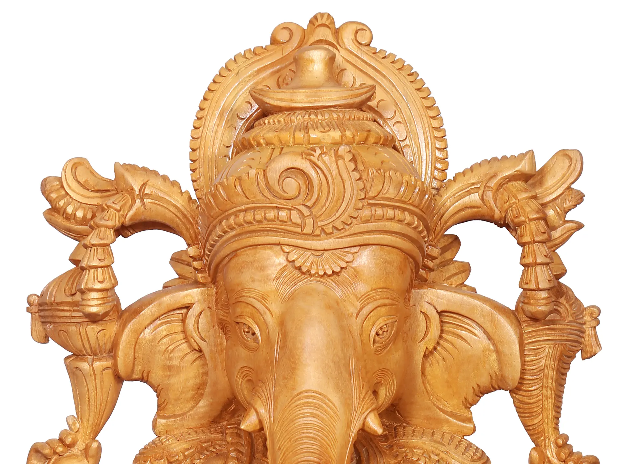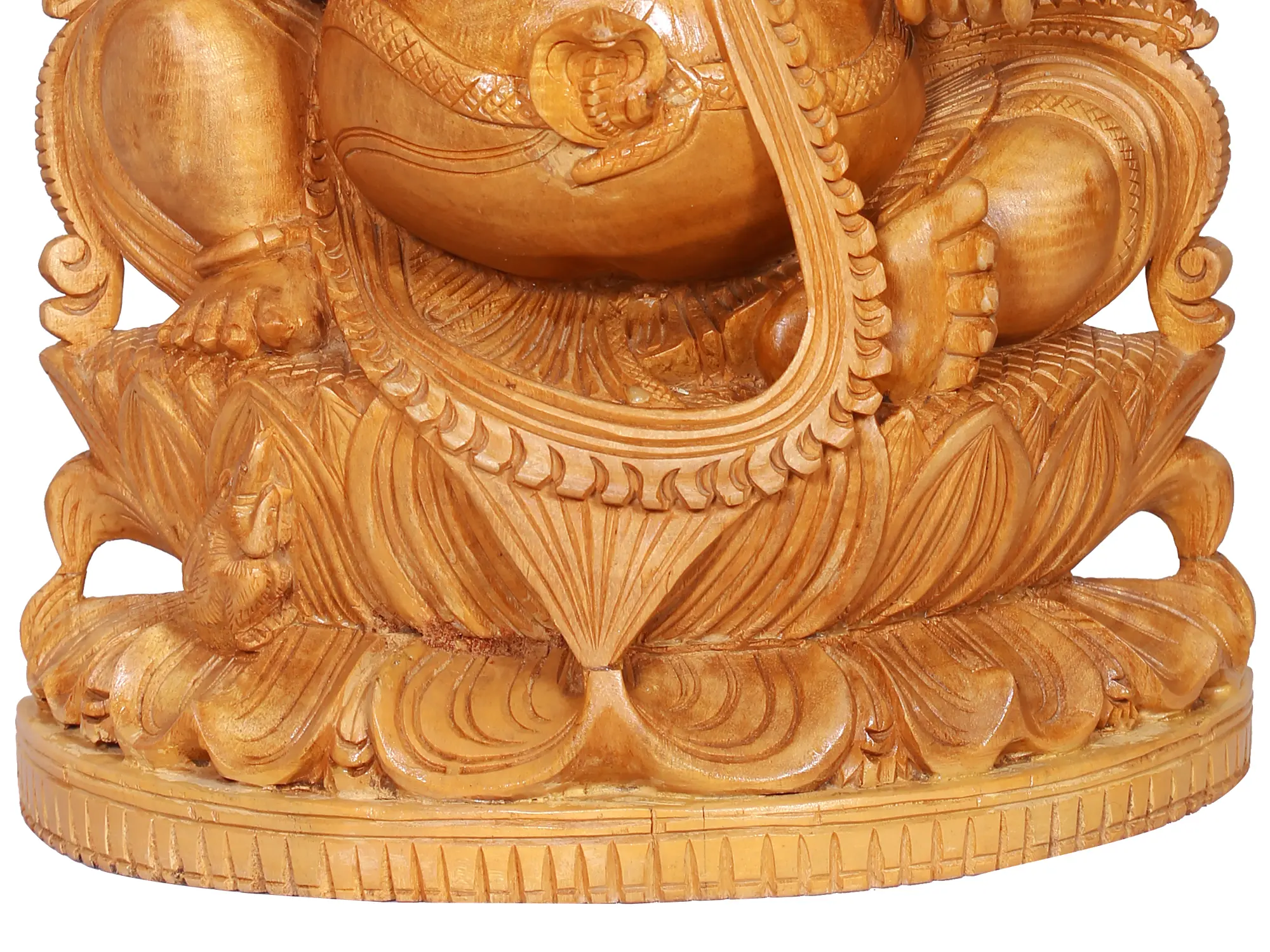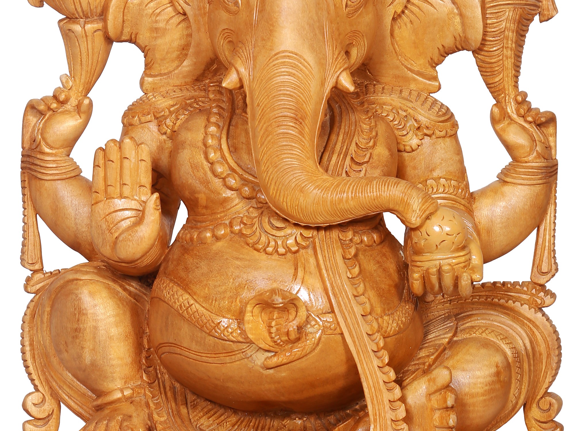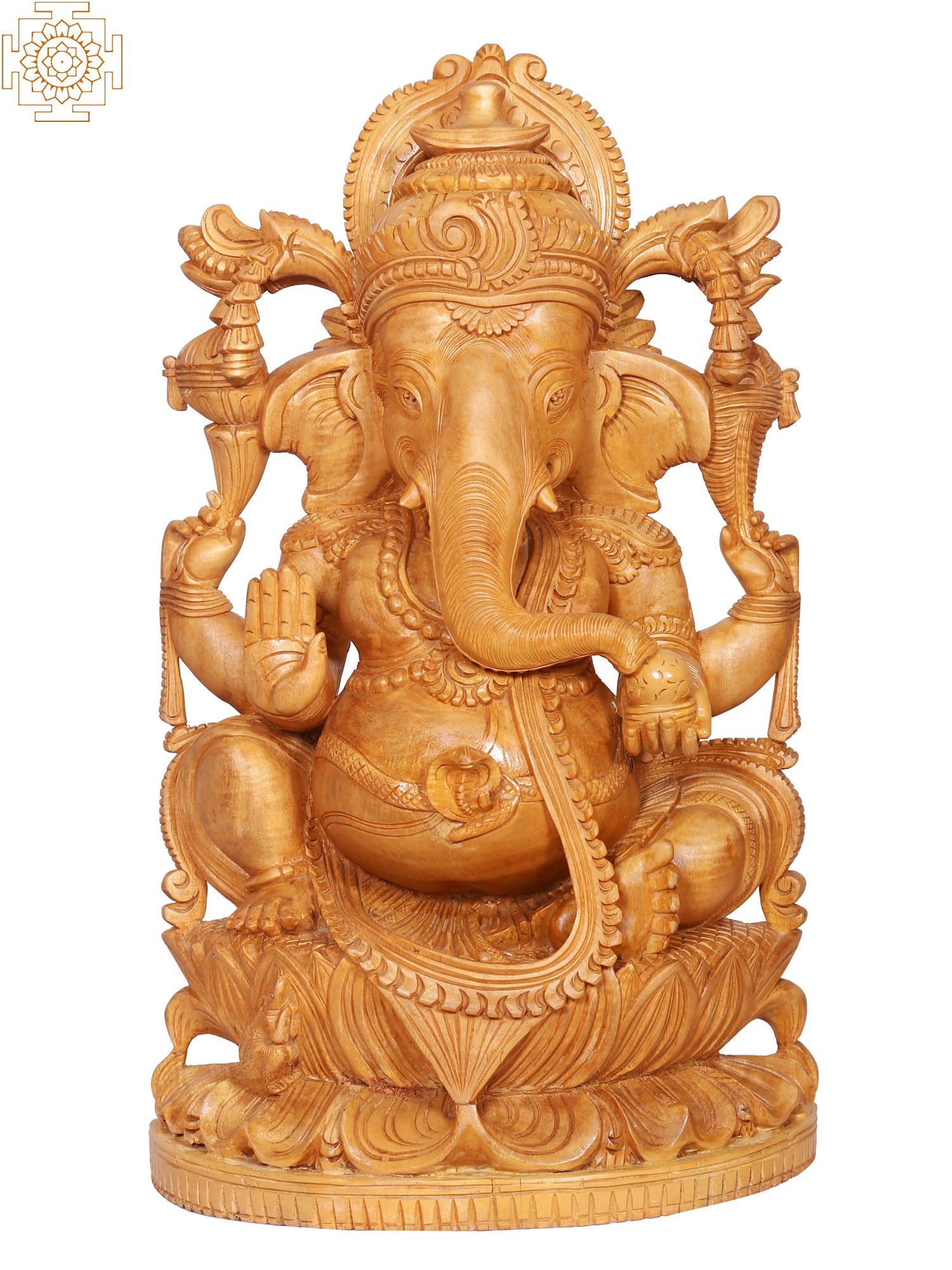 This exquisite wooden sculpture captures the divine essence of Lord Ganesha, the beloved elephant-headed deity revered as the remover of obstacles and the bestower of wisdom and prosperity. Carved with meticulous detail, Ganesha is depicted seated gracefully upon a blooming lotus, a symbol of purity, enlightenment, and spiritual awakening. The warm, natural grain of the wood enhances the serene and benevolent expression on his face, inviting a sense of peace and devotion. The artistry of this piece is evident in every curve and contour. Ganesha's iconic trunk, a symbol of his sharp intellect and ability to navigate complex situations, is rendered with lifelike realism. His large ears, signifying his capacity to listen attentively to all devotees, are adorned with intricate carvings, as is the majestic crown that sits atop his head, representing his divine authority. The multiple arms, each holding symbolic items, convey his multifaceted nature and his power to bestow blessings and protection. In one hand, he may hold his broken tusk, a testament to his sacrifice and dedication. Another hand is raised in a gesture of blessing (abhaya mudra), offering solace and reassurance to those who seek his guidance. ––––––––––––––––––––