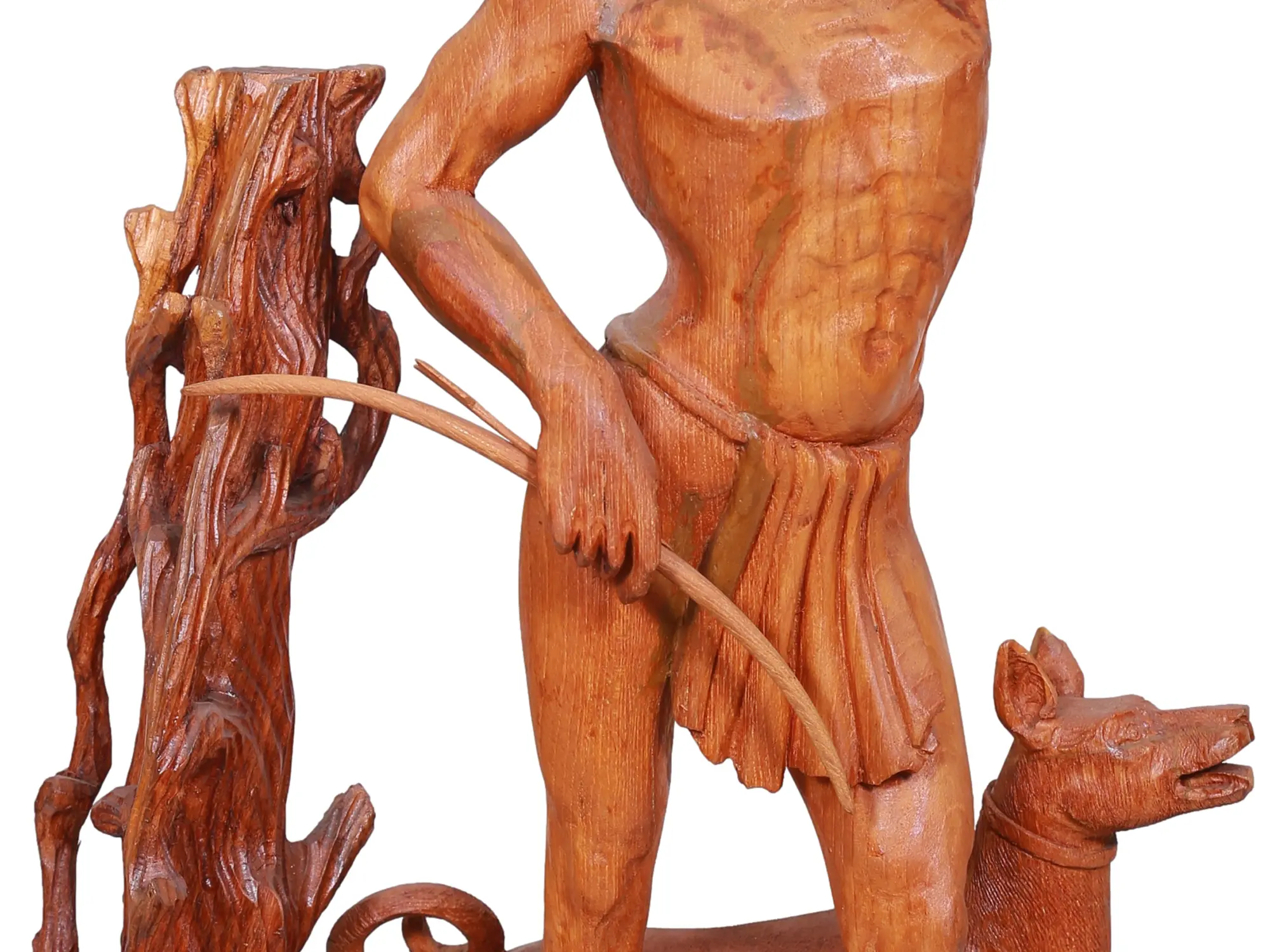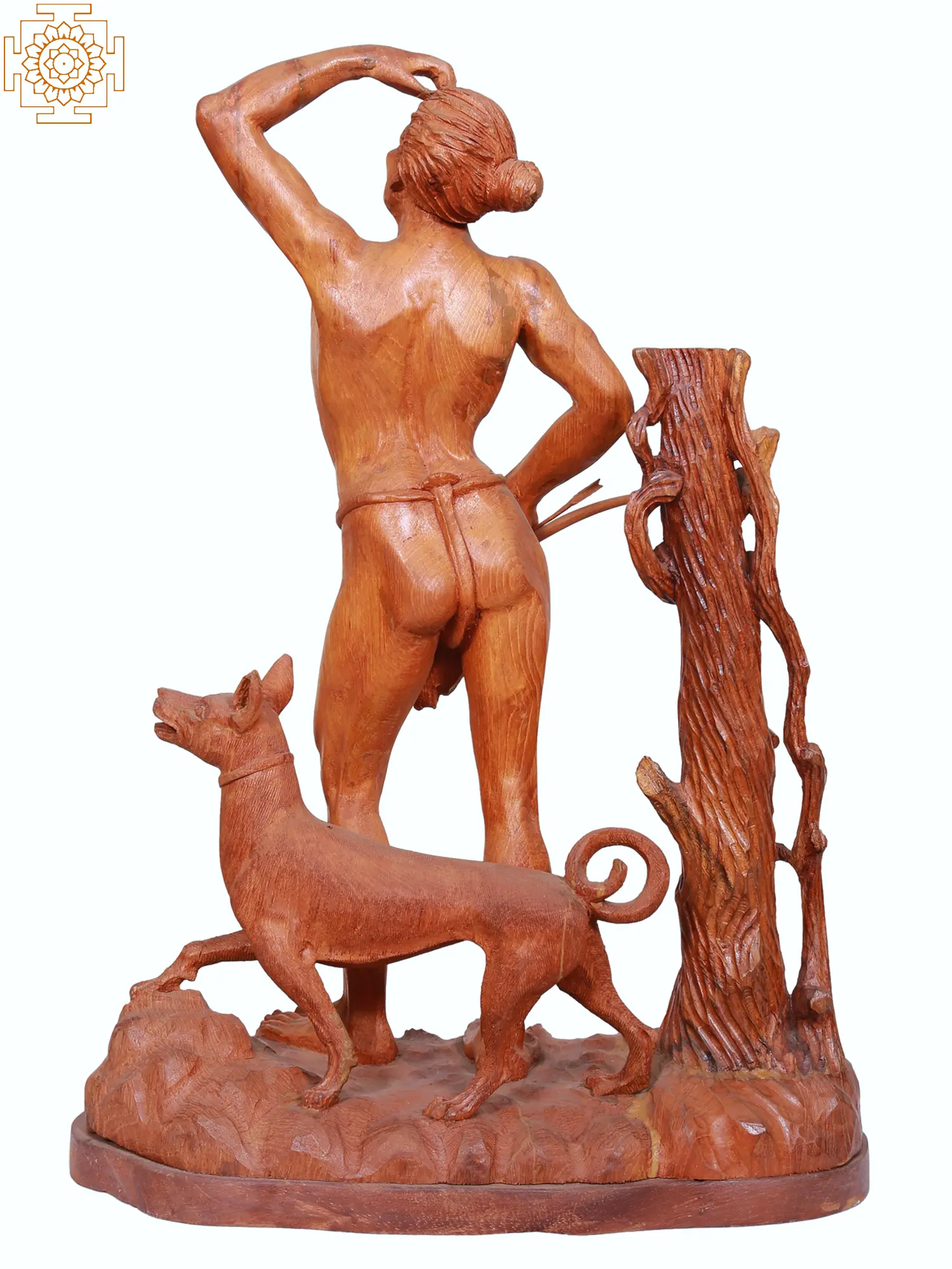 This striking teak wood sculpture captures a powerful moment of primal connection between man and nature. Carved with meticulous detail, it depicts a lean, muscular tribal man, his gaze fixed on the horizon as if scanning for prey or perhaps listening to the whispers of the wind. His posture, one hand touching his brow as he shields his eyes from the sun, speaks of vigilance and deep concentration. He holds a bundle of spears, the tools of his survival, testament to a life lived in harmony with the wild. Beside him stands a faithful dog, its form alert and ready, mirroring the man's watchfulness. The dog's attentive stance, head slightly raised and ears perked, conveys an unspoken understanding and partnership. Together, they embody the ancient bond between human hunters and their canine companions, a relationship that has existed since the dawn of civilization, enabling humanity to thrive and explore the world. The sculpture is set against a textured base, suggesting a rugged landscape, and a gnarled tree trunk that adds a sense of organic authenticity to the scene. The rich, warm tones of the teak wood lend an earthy elegance to the piece, highlighting the intricate carving of muscles, fabric, and the very grain of the wood itself. The scene evokes tales of ancient heroes and their quests. In many mythologies, the hunter is a revered figure, often a protector or a provider. Consider the Greek myth of Orion, a giant hunter who was placed among the stars after his death, forever chasing his celestial prey. Or the stories of indigenous peoples worldwide, where the skill of the hunter was crucial for the survival of the community, and where the dog played an indispensable role in tracking and companionship. This sculpture, in its raw and powerful portrayal, taps into these deep-rooted cultural narratives, celebrating the spirit of adventure, resilience, and the enduring partnership between man and animal. The meticulous craftsmanship ensures that each element, from the textured bark of the tree to the taut muscles of the man and dog, is brought to life, making this a truly captivating work of art.