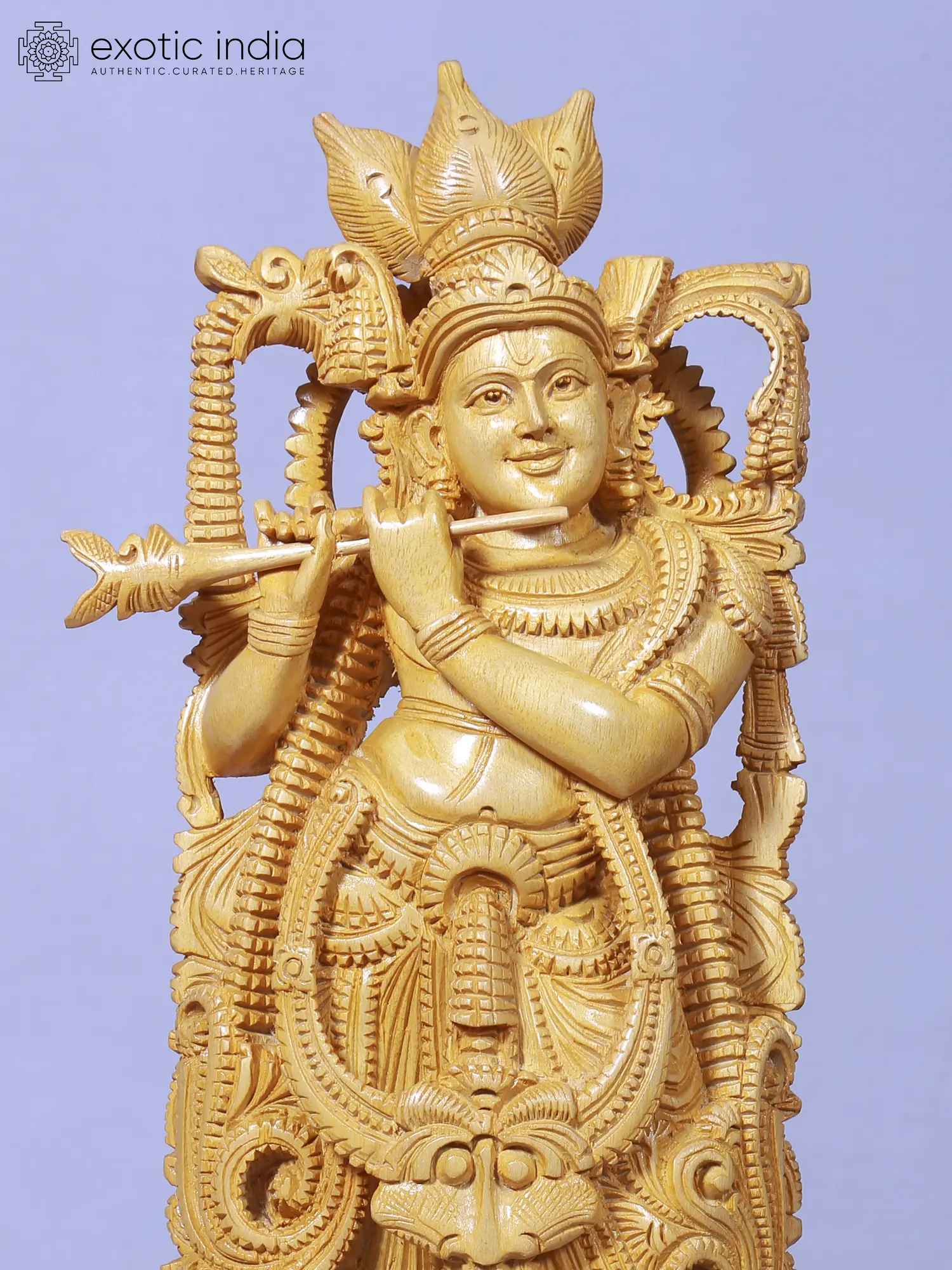 16" Lord Krishna Standing on Lotus Pedestal Playing Flute | Sandalwood Carved Statue