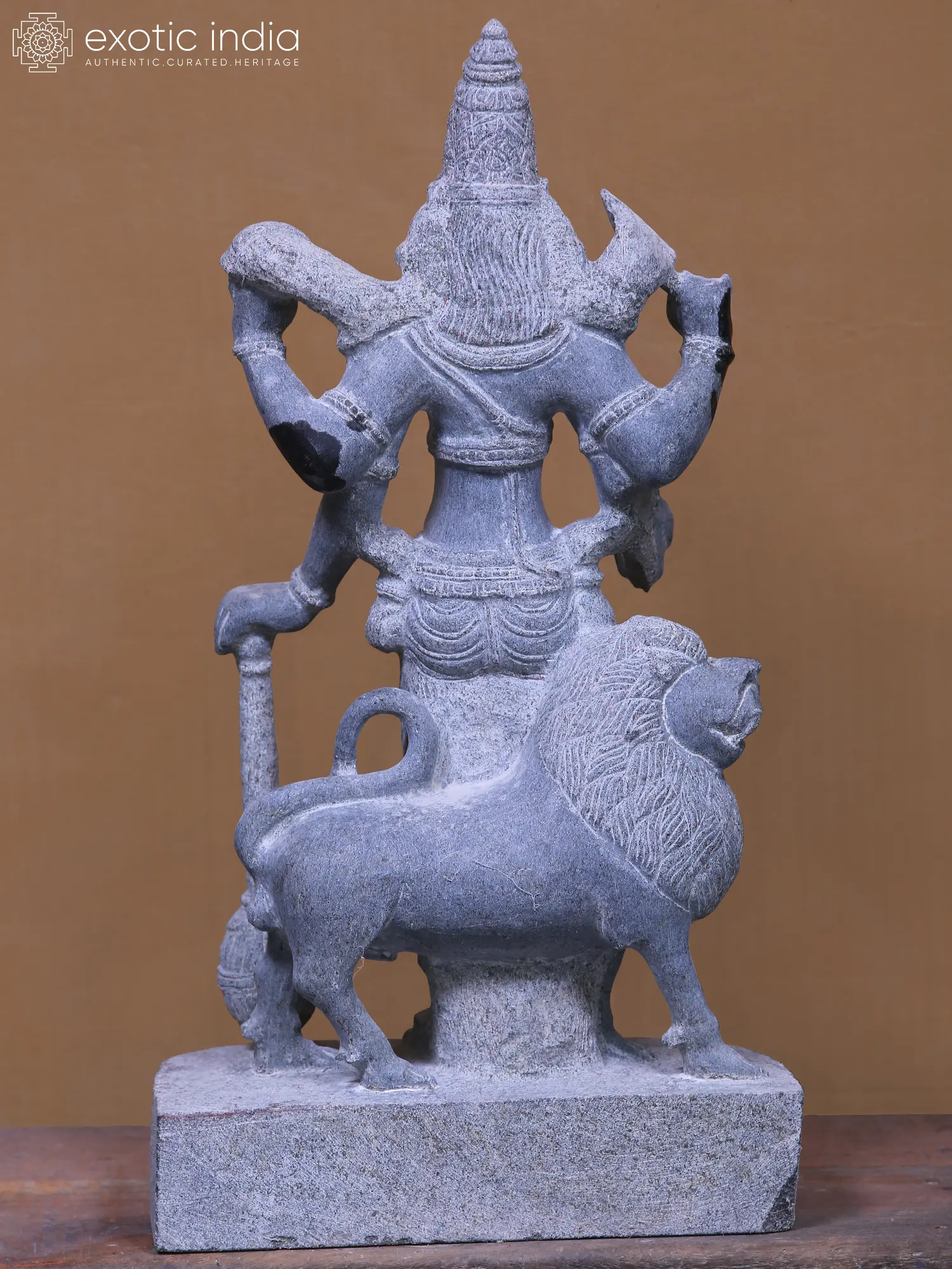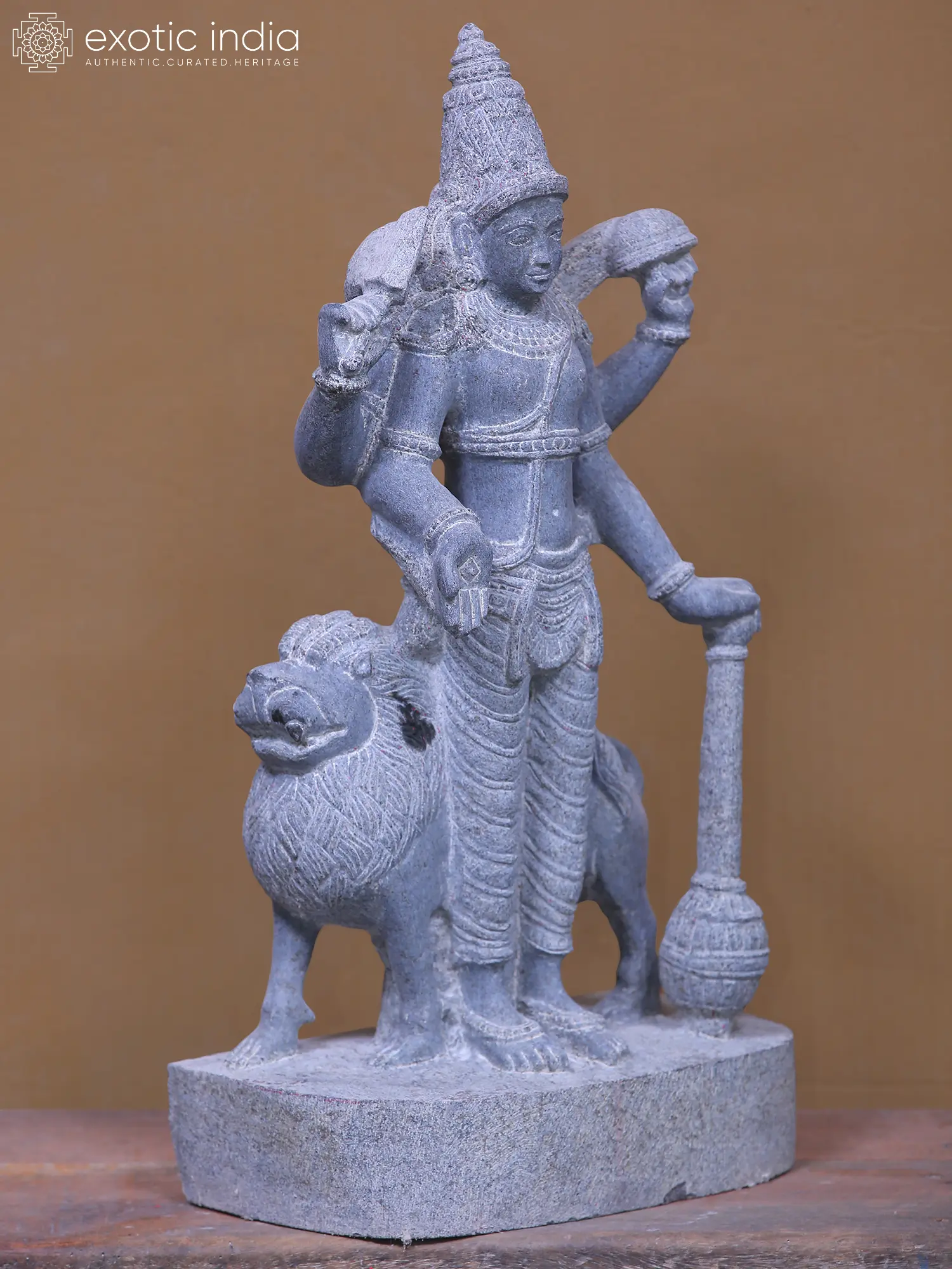This exquisite 21-inch black granite statue depicts Budha Graha, the planetary deity representing Mercury in Hindu astrology. Crafted with meticulous detail, this piece captures the essence of Budha, known for his intellect, communication, and swiftness. The statue shows Budha standing gracefully, his multiple arms holding symbolic objects representing his attributes. He is often portrayed riding a lion, symbolizing courage and strength, and this statue beautifully captures this imagery. The lion at his feet further emphasizes his connection to these powerful traits.
