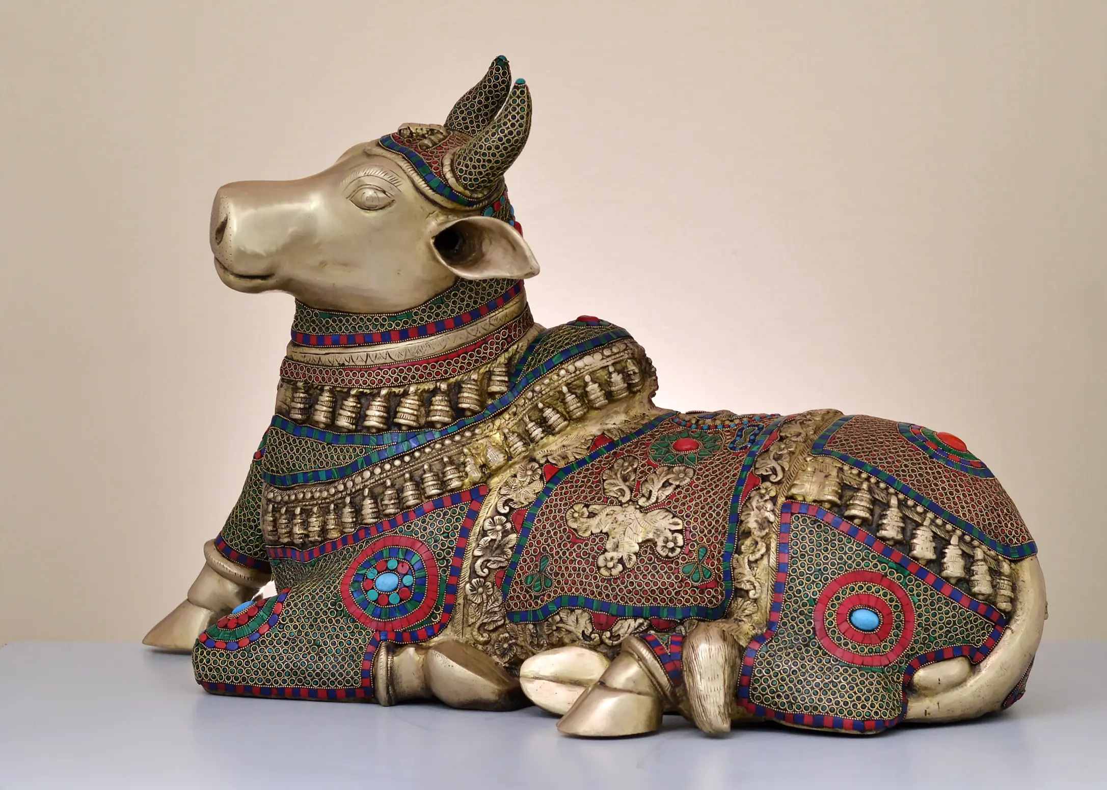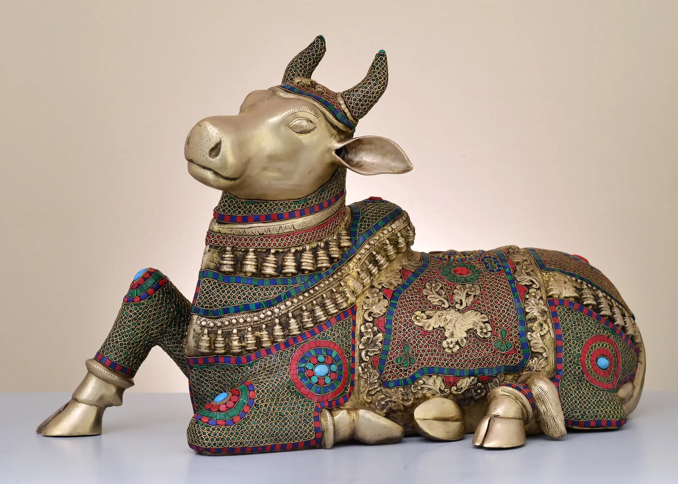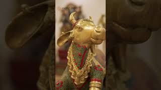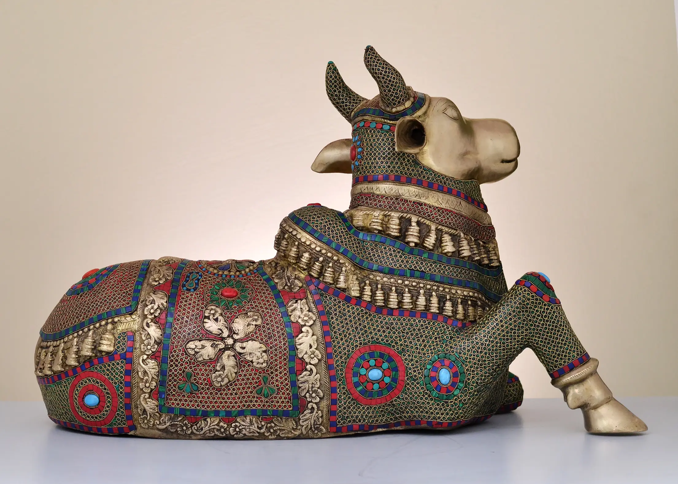 Lord Nandi embodies selfless love and devotion. The statue of Nandi in Brass and Inlay, with one foot poised to move and the rest of his body seated, represents his never-ending wait to meet his master, and his raised foot represents alertness. He is waiting, yet he is still willing to obey his Aradhya or Lord Shiva. This Brass Nandi, which represents the characteristics of Lord Shiva's beloved chariot, also has a vibrant depiction of him. The beautifully inlaid stones on his body, as well as the brass ornaments that compliment the arrangement, are an homage to Shiva Parvati's adored kid.