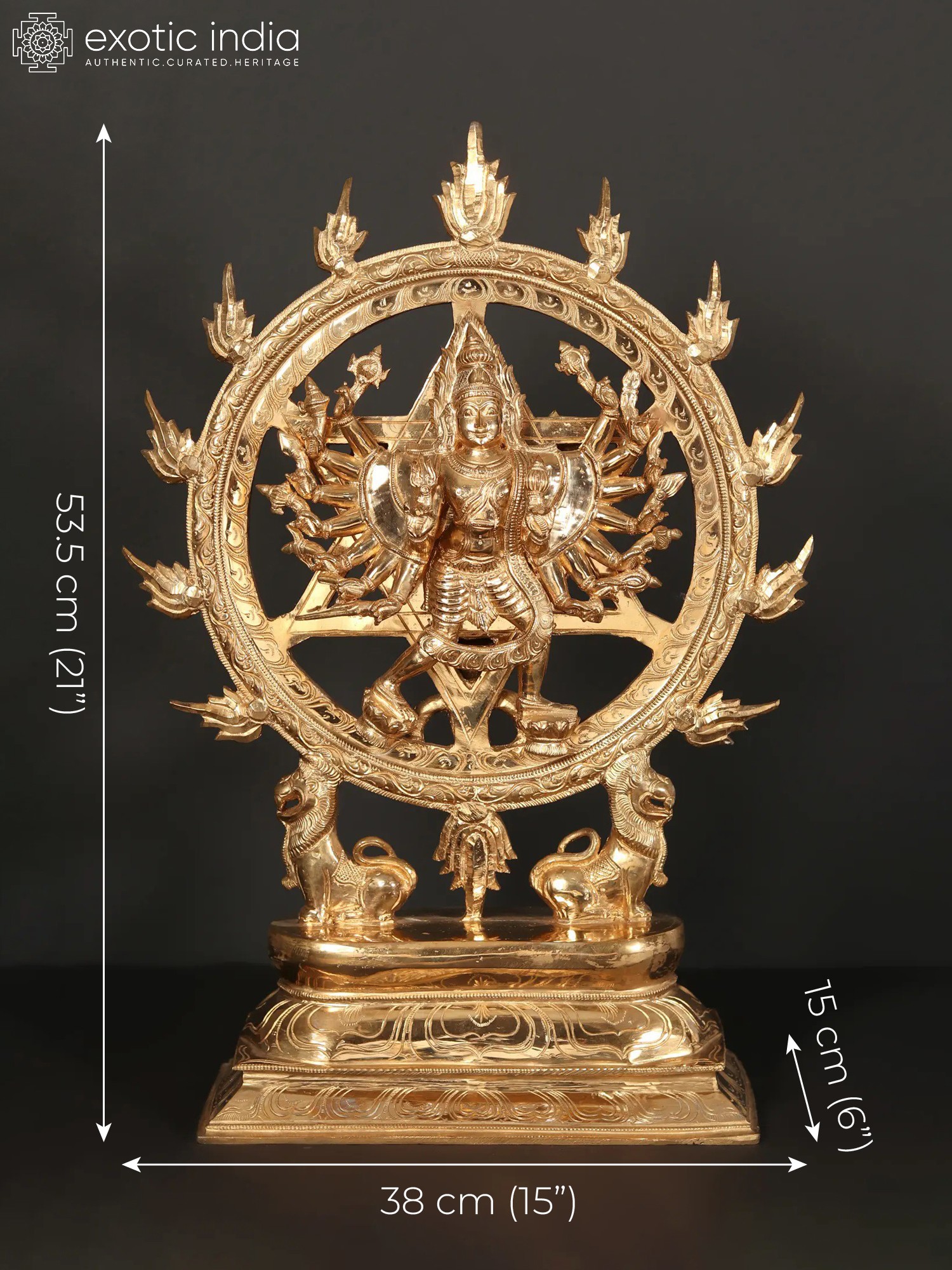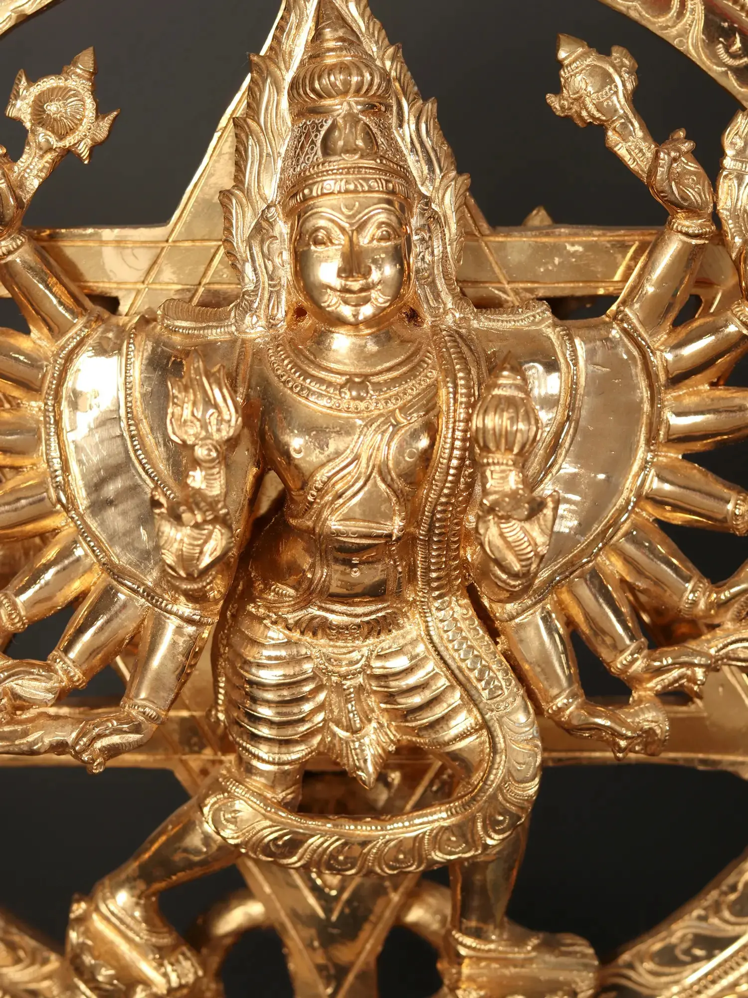 Witness the divine form of Vishnu Narasimha with our Bronze Chakrathalwar Statue. The impeccable detailing in this bronze creation captures the essence of Lord Vishnu in his Narasimha avatar, wielding the mighty chakra. This portrayal symbolises the cosmic order and the triumph of good over evil. As you contemplate this statue, feel the divine energy of protection and righteousness permeate your space. The symbolism of the chakra adds a layer of cosmic significance, making this bronze sculpture not just a representation but a powerful emblem of divine justice.