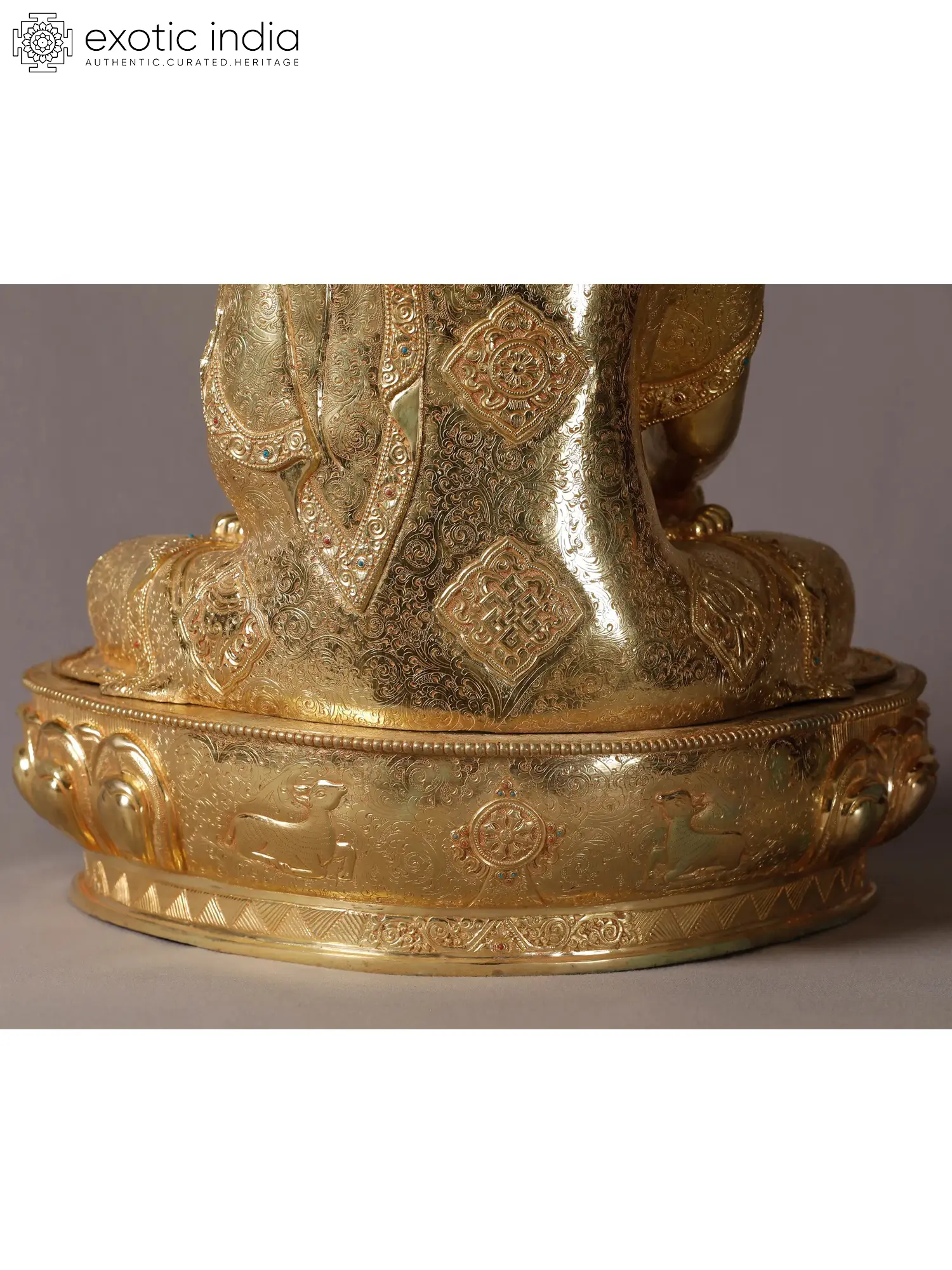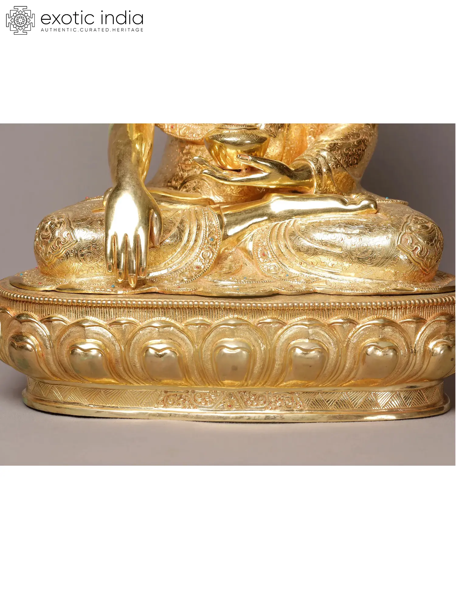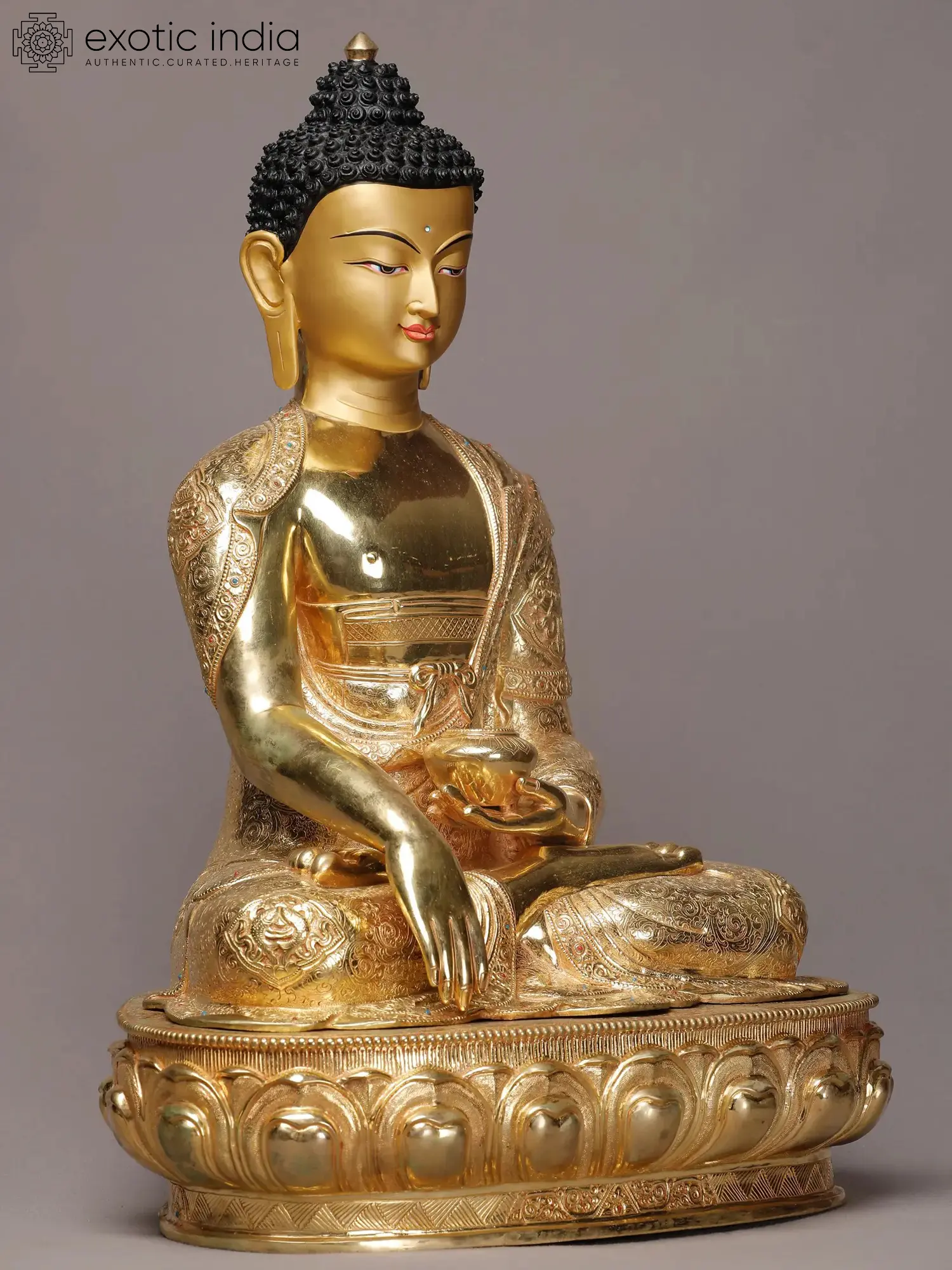 The Ashtamangala or eight auspicious signs in Buddhism are the motifs that can turn any object into a sacred article, but in this gilded copper Buddha statue from Nepal, inscribed on the monastic robe of Bhumisparsha Buddha, these signs have gained propitiousness by being in the proximity of the Enlightened One. The coils and facial features of Buddha are presented flawlessly, giving the statue a remarkably enlivened appearance. Tiny turquoise and coral are carefully studded in Buddha’s attire, fitting his stature as the sovereign master.