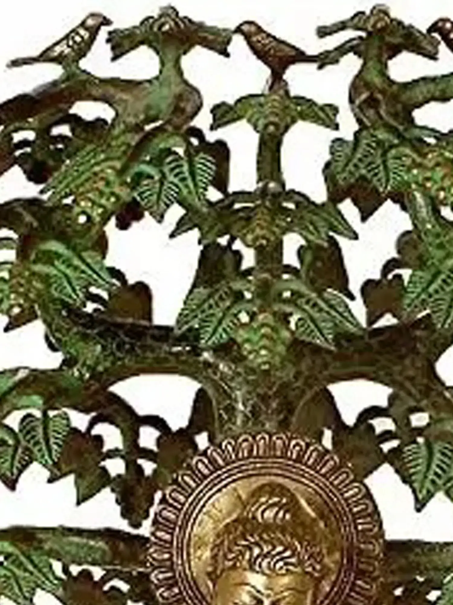A distinct, bitone palette. The seated figure preoccupies about a third of the height of the composition. It is a deep gold colour, which comes from the pure brass medium. From the lotus-petal plinth beneath Him to the fruit-filled canopy teeming with life above, it is a vivid emerald. Hints of black and brass gold in these sections bring out the vividness of the green.