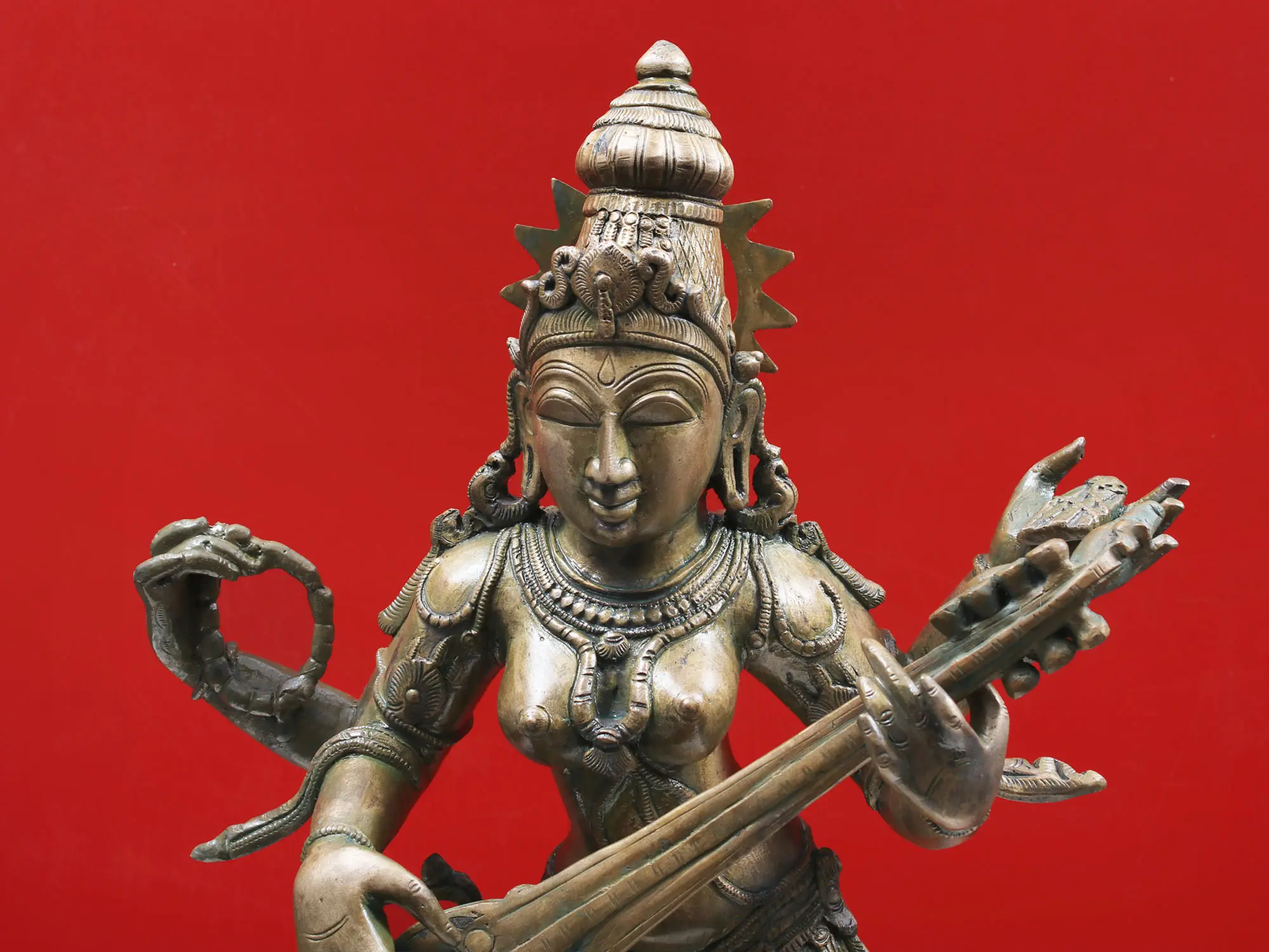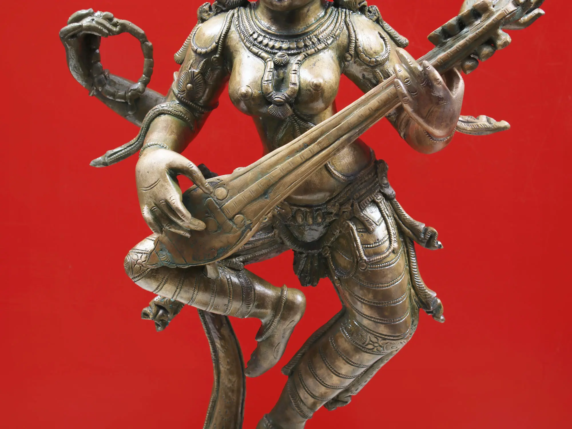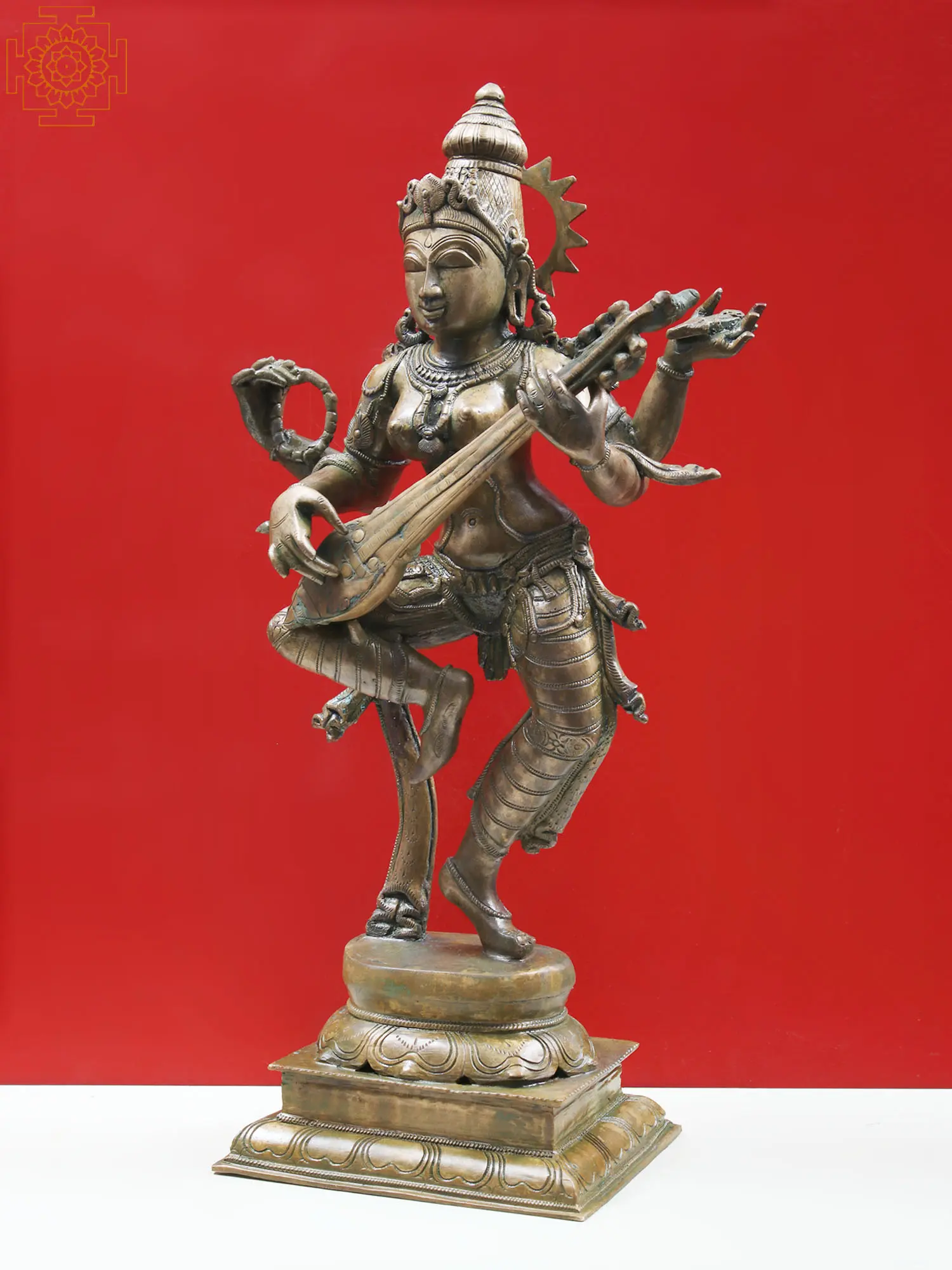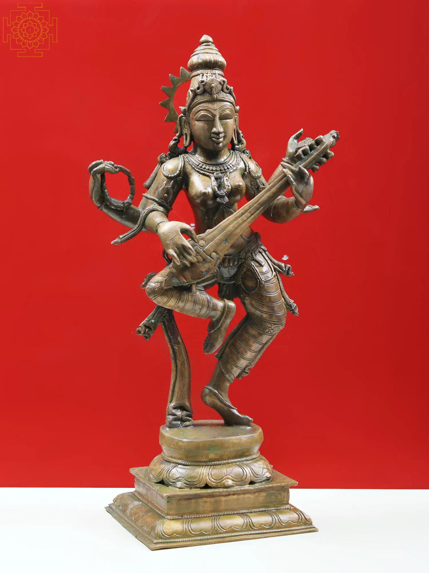 This exquisite bronze sculpture captures the divine presence of Saraswati, the Hindu goddess of knowledge, music, arts, wisdom, and learning. Revered as the mother of the Vedas, the consort of Brahma, and the source of all creative expression, Saraswati is depicted here in a dynamic dancing pose, her form exuding a sense of fluid motion and serene grace. Her posture, known as *Tribhanga* (a triple bend), is characteristic of classical Indian dance, imbuing the sculpture with a lifelike energy and a captivating aesthetic.