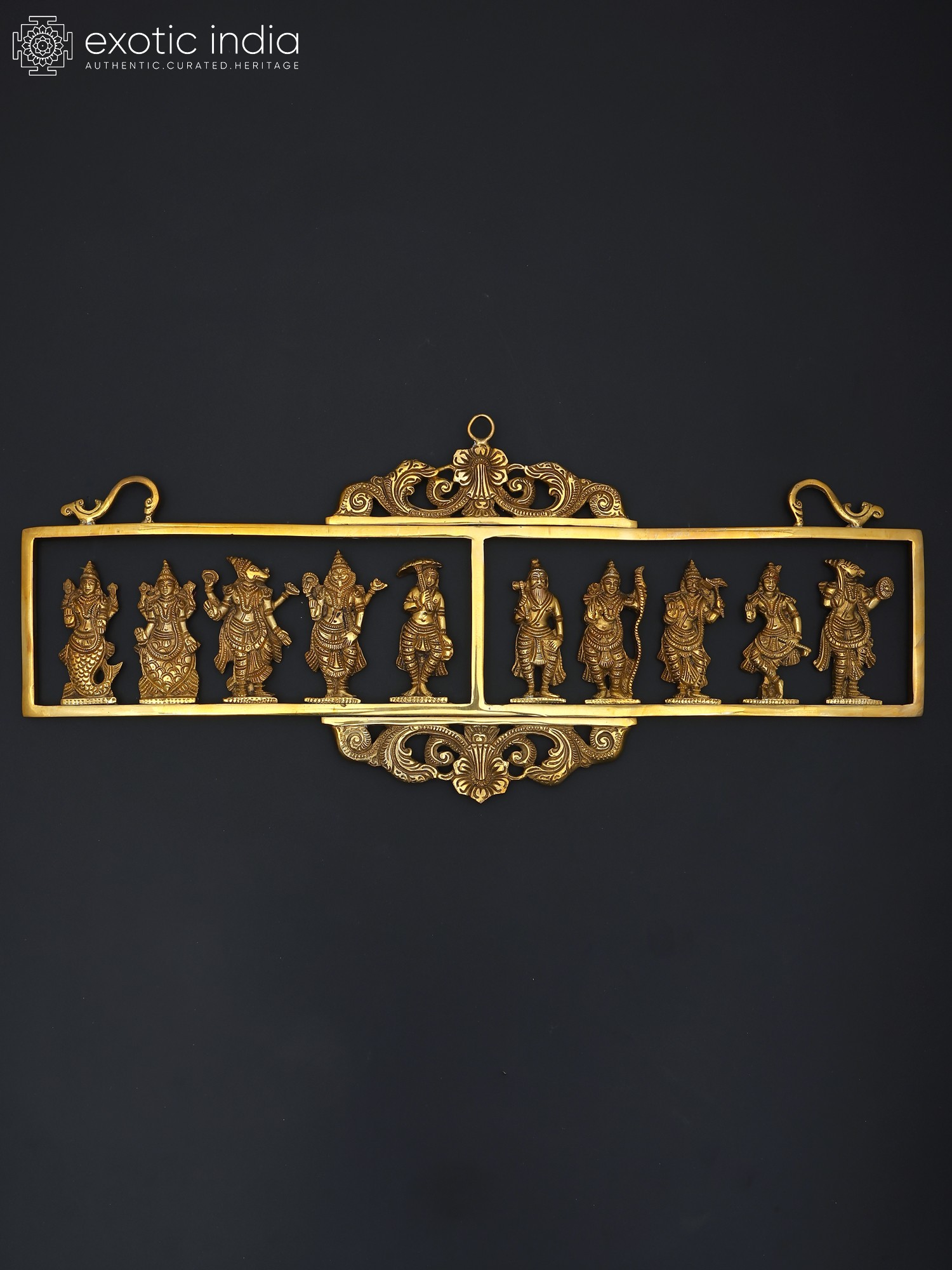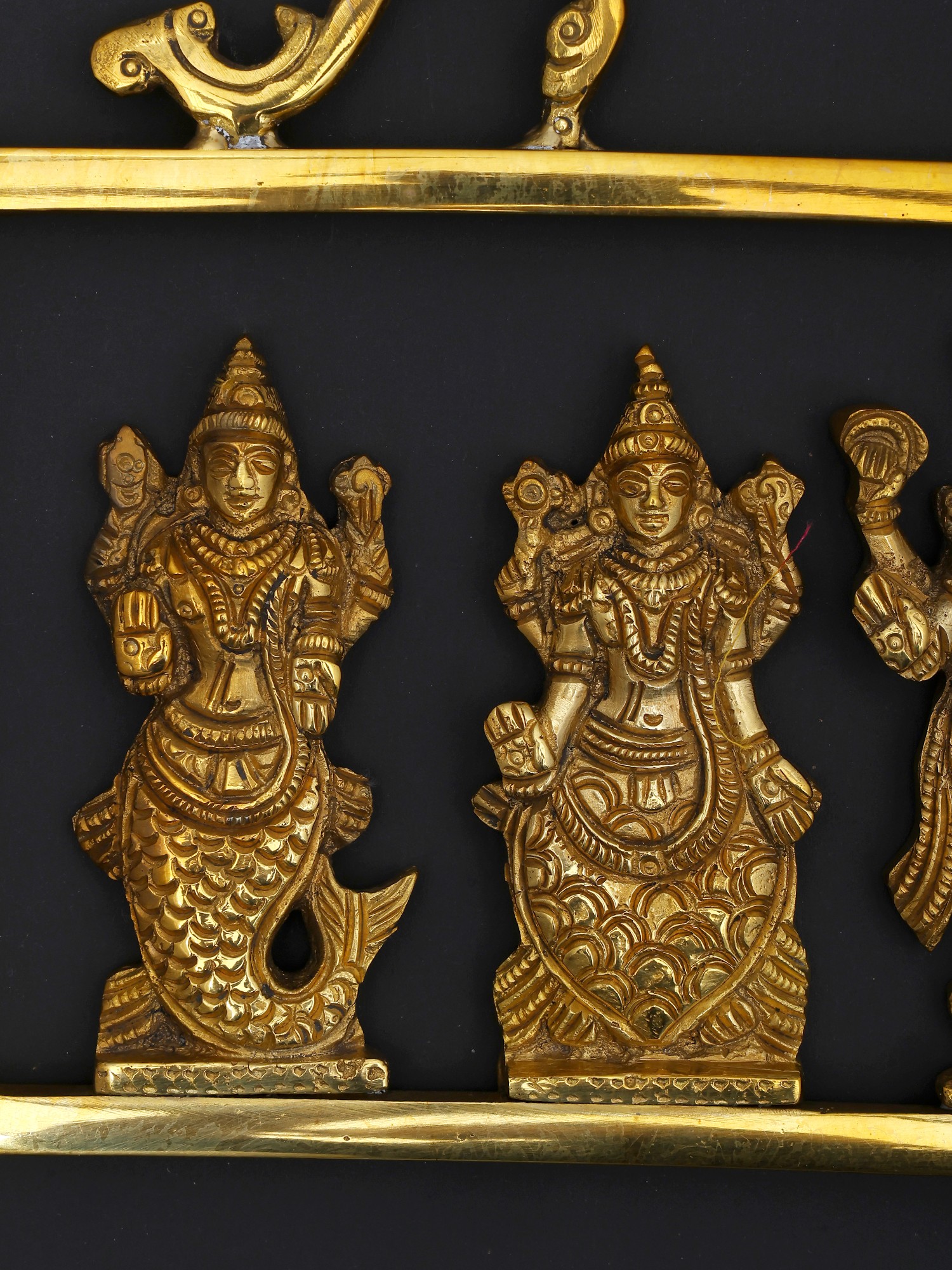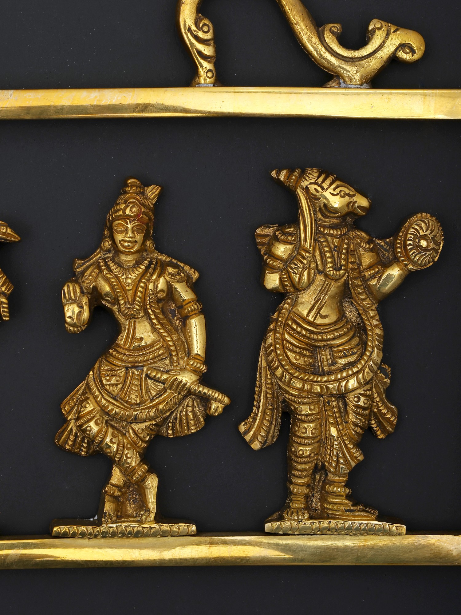 Victory to Keshava, Lord of the Universe, who took ten different forms, is part of a poem by Jayadeva. This section of Jayadev's Dasavatara Strotam extols the Dasavatar, or ten incarnations of Lord Vishnu. The portrayal of all reincarnations in one piece is considered highly fortunate, and followers commonly worship it in paintings or sculptures. This spiritual artwork is a brass wall with a plate containing all avatars encased within a brass ornate frame. The idea behind the creation of this wall hanging is to unite the self with the sacred via the gorgeous view of Lord Vishnu's ten forms.